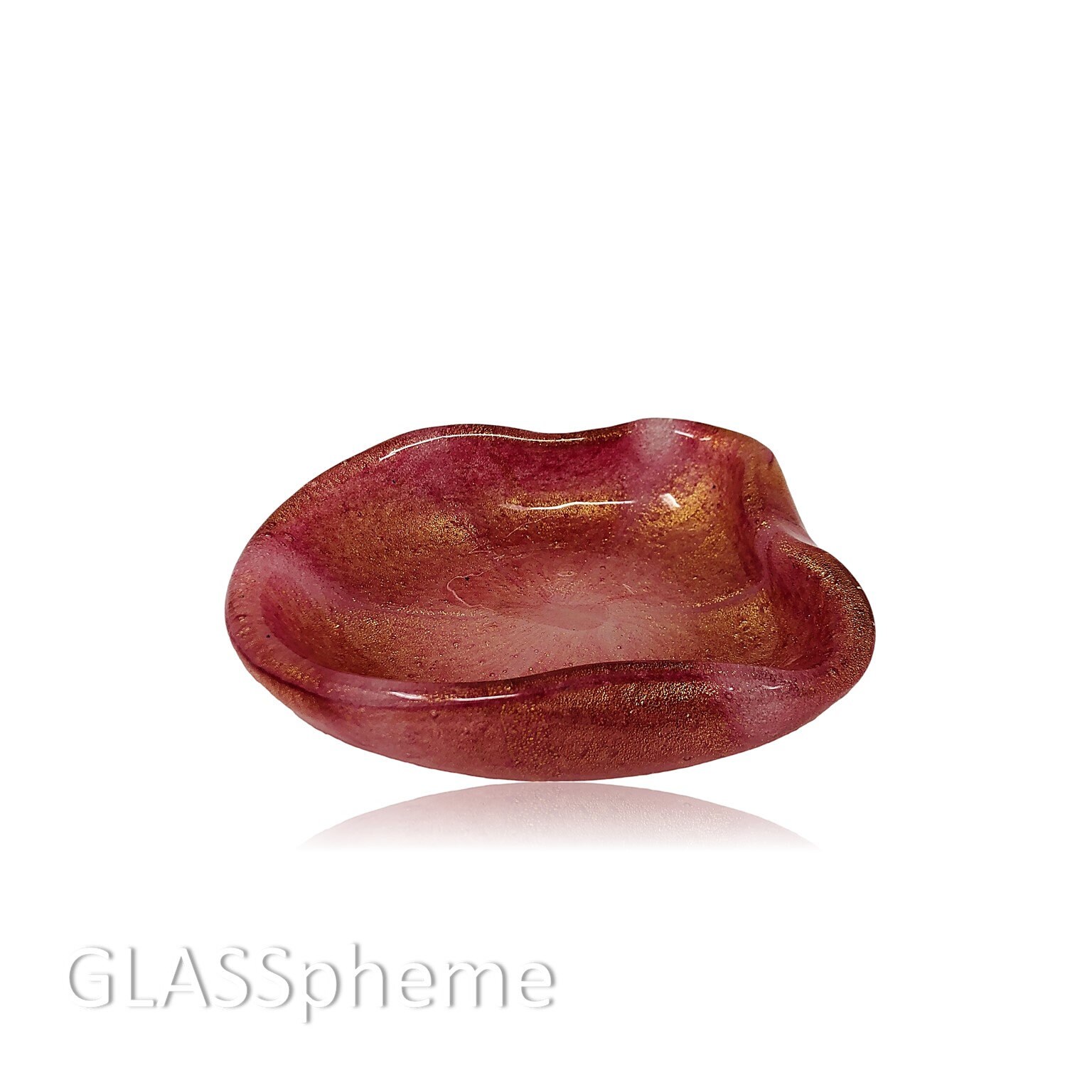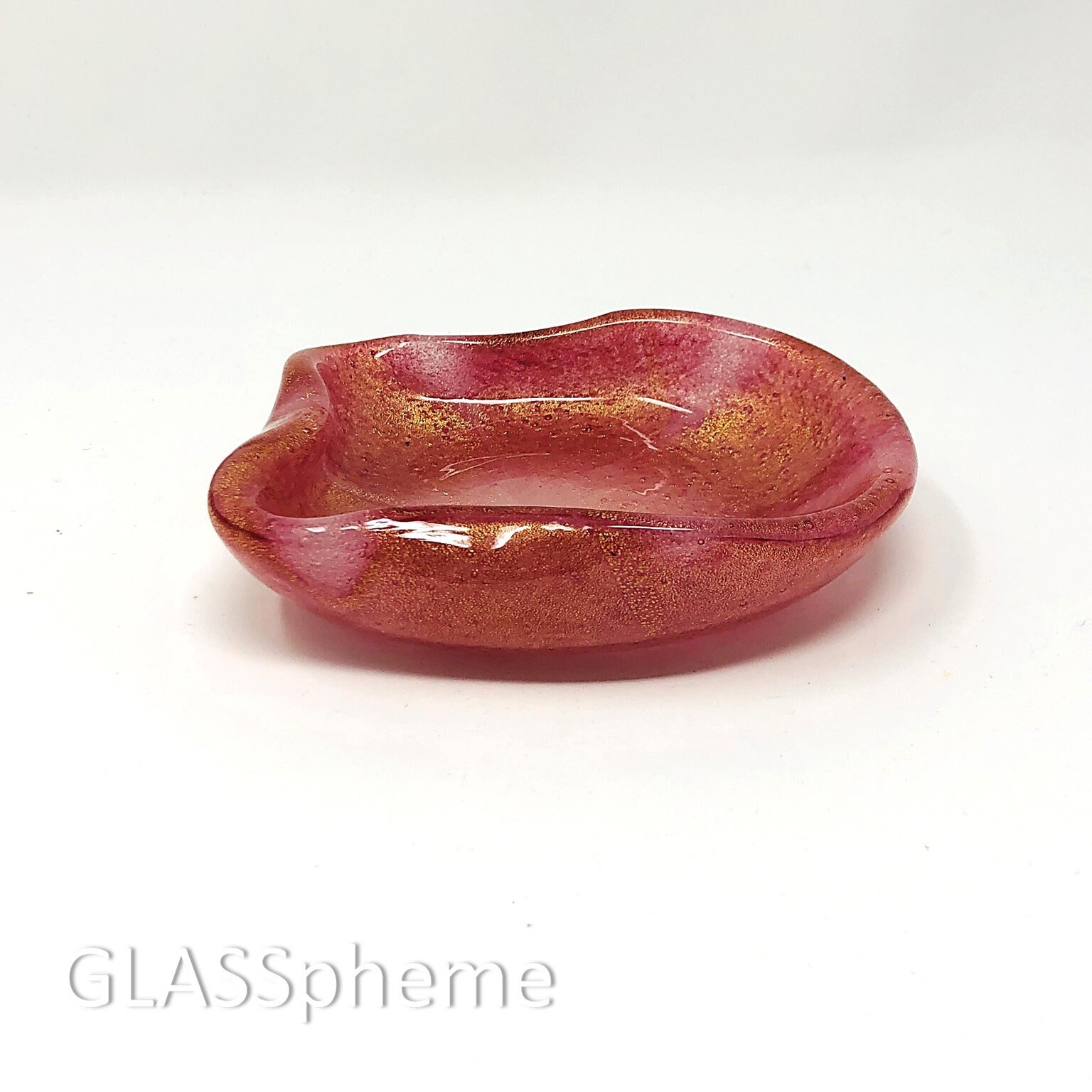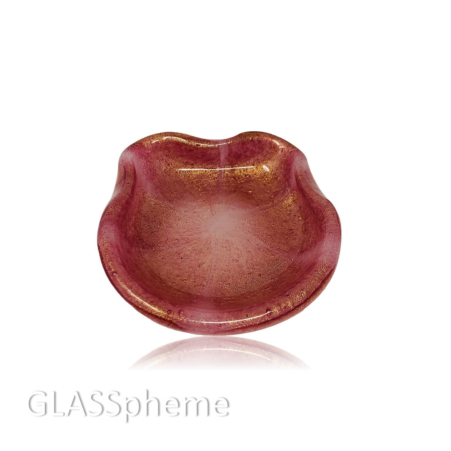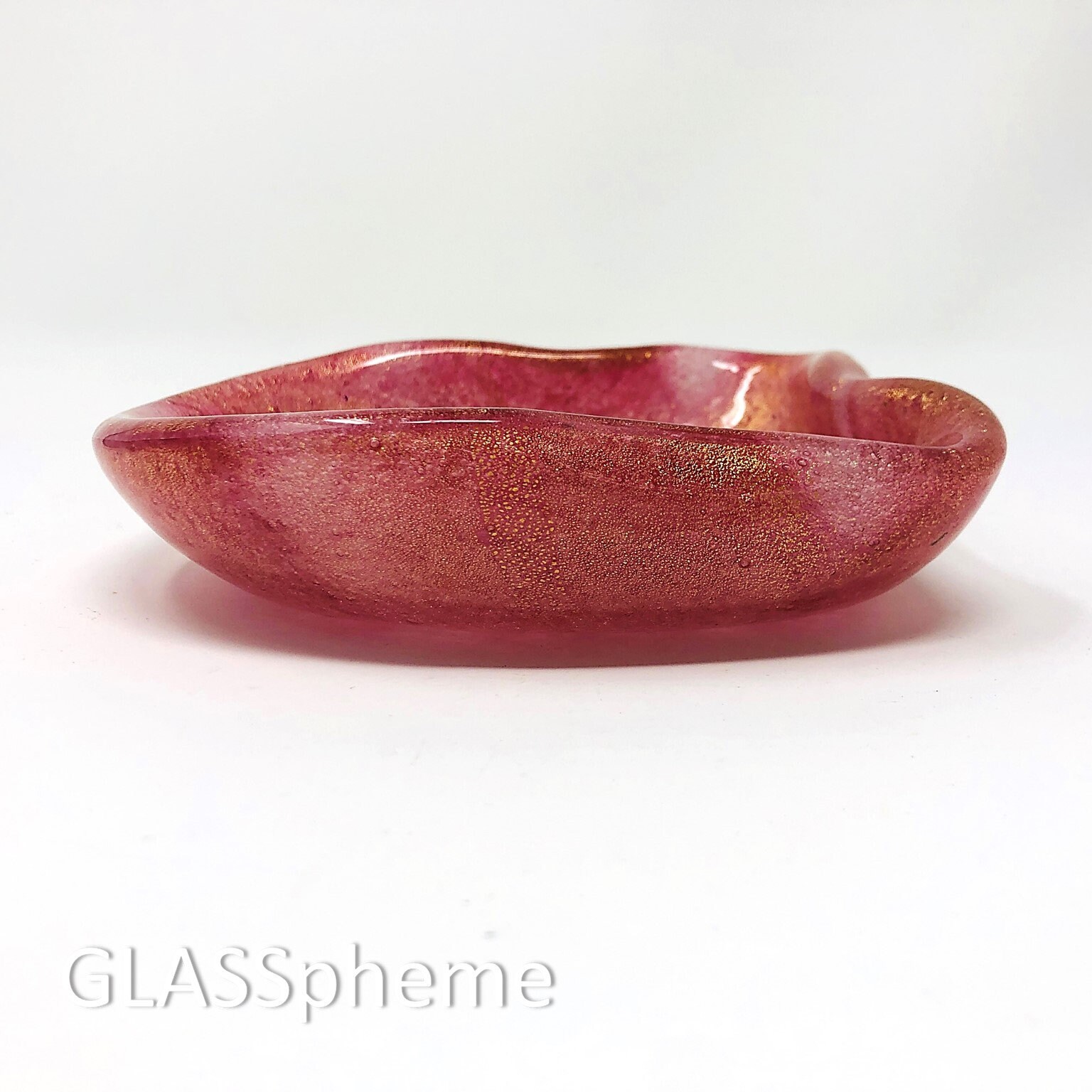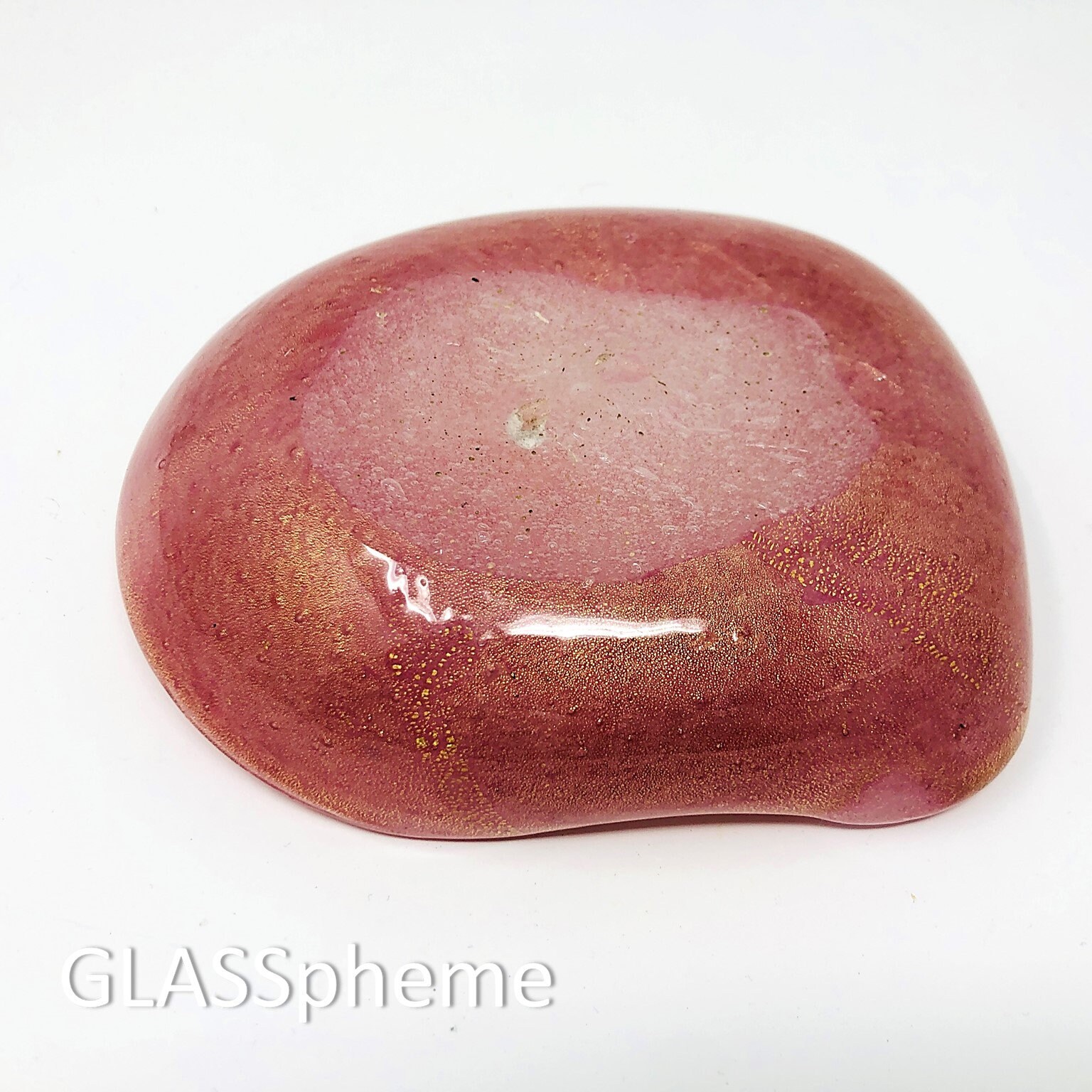Here's a truly uncommon vintage Murano beauty! Done using the Pulegoso technique originated by Napoleon Martinuzzi in the 1930s, this piece absolutely froths with tiny bubbles amidst the pink opalescent glass and heavily strewn gold aventurine. I've NEVER seen this design before so cannot begin to imagine the maker. But the base wear makes it clear that this is a mid-century piece and the exquisite use of pulegoso and gold screams MURANO.