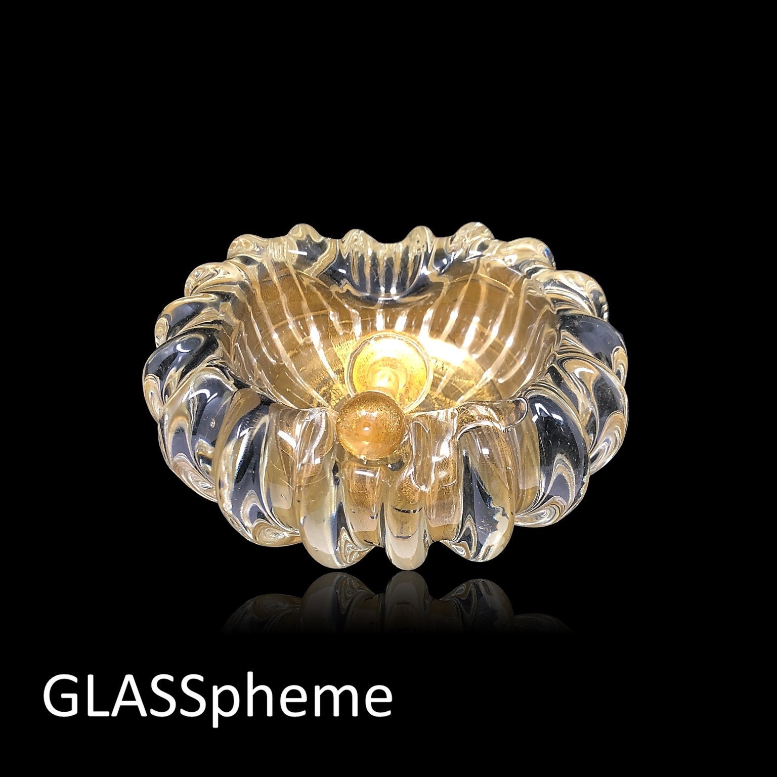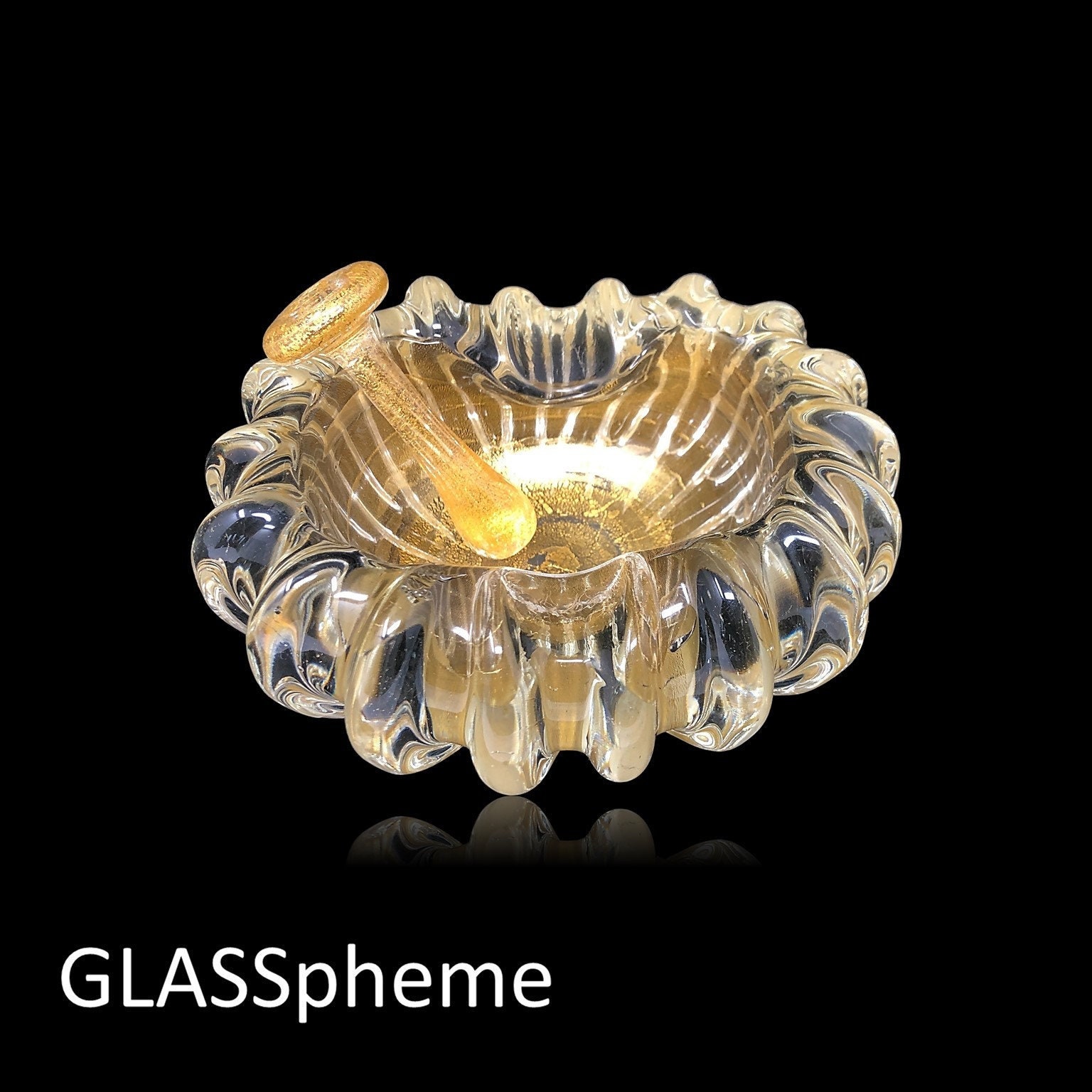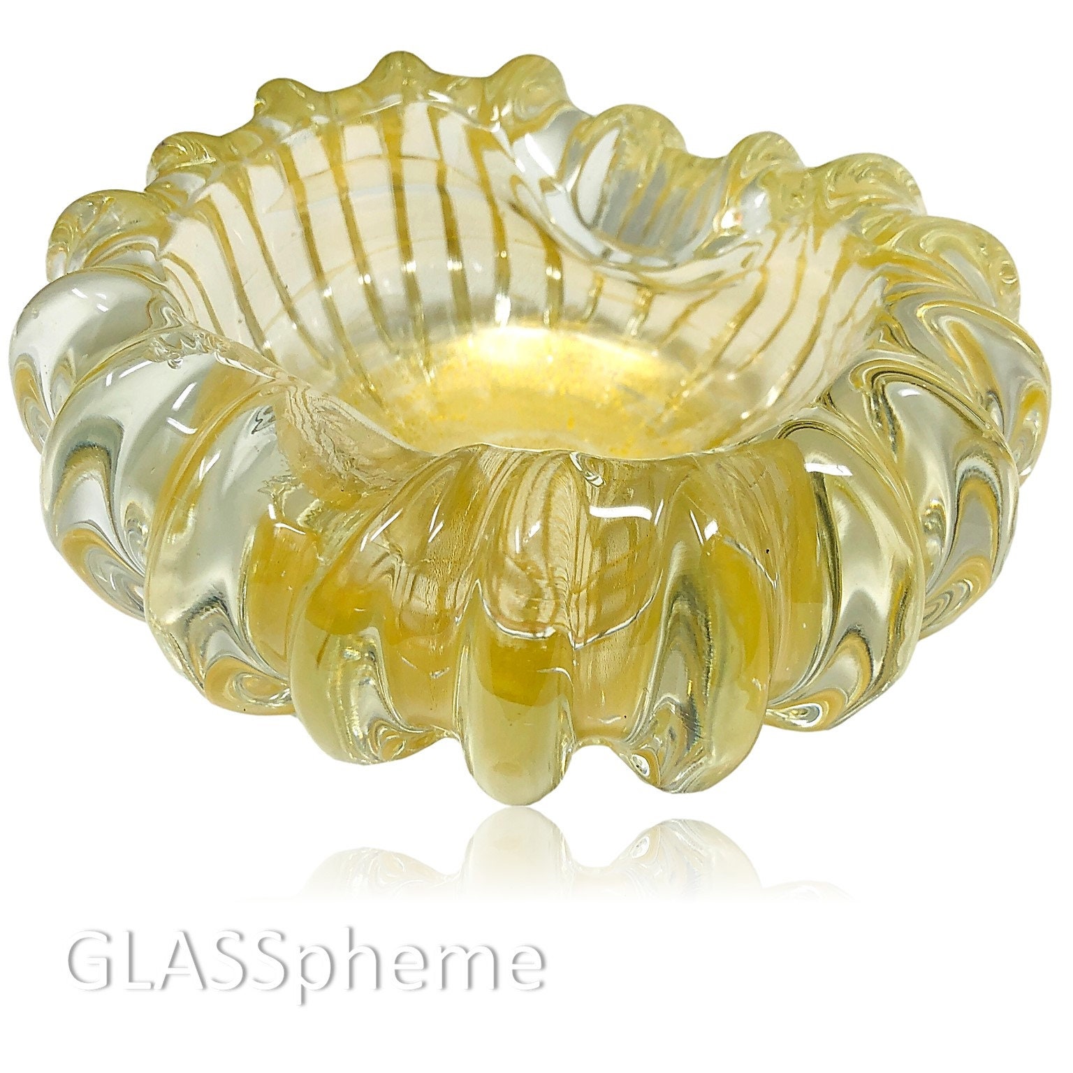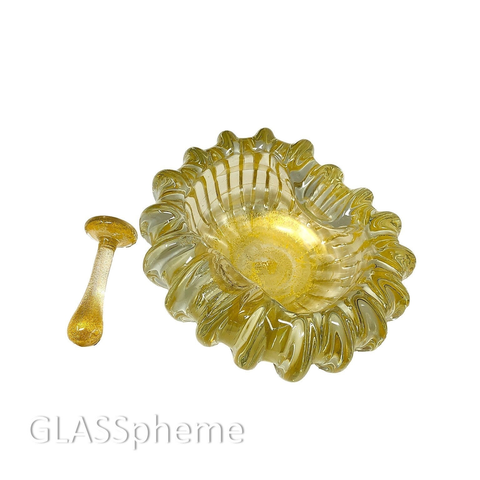 You're looking at a stupendously OPULENT midcentury Murano glass ash receiver with tamper (or candy or trinket dish) that will take your breath away! THIS is the gift for the cigar afficienado or collector of BEAUTY in your life! With base wear expected of such a vintage piece, this amazing find is otherwise minty and its shine and glitter will leave you gaping. Seguso? Barovier? I have no idea. However, this heavy magnificent piece will surely become one of your very favorite finds.