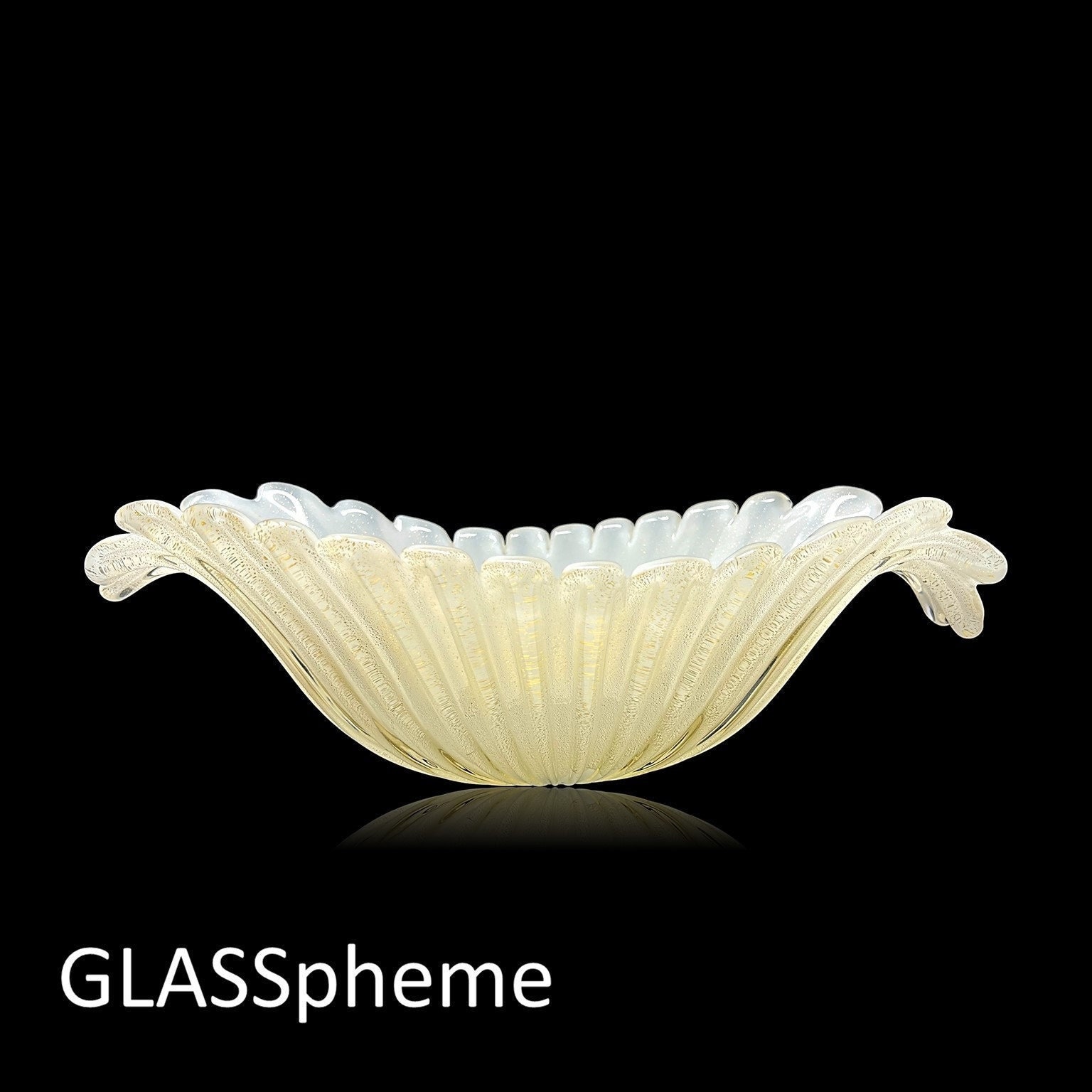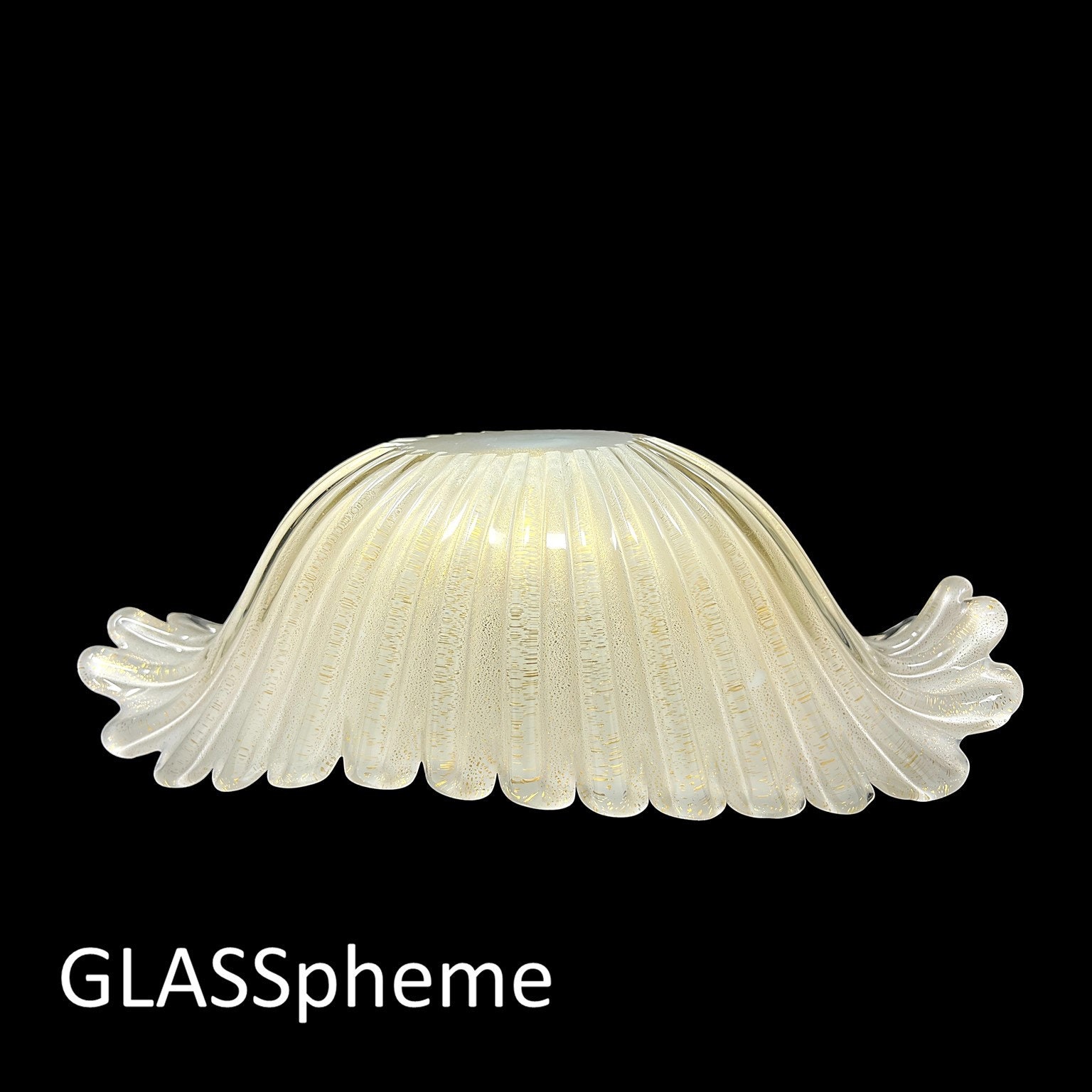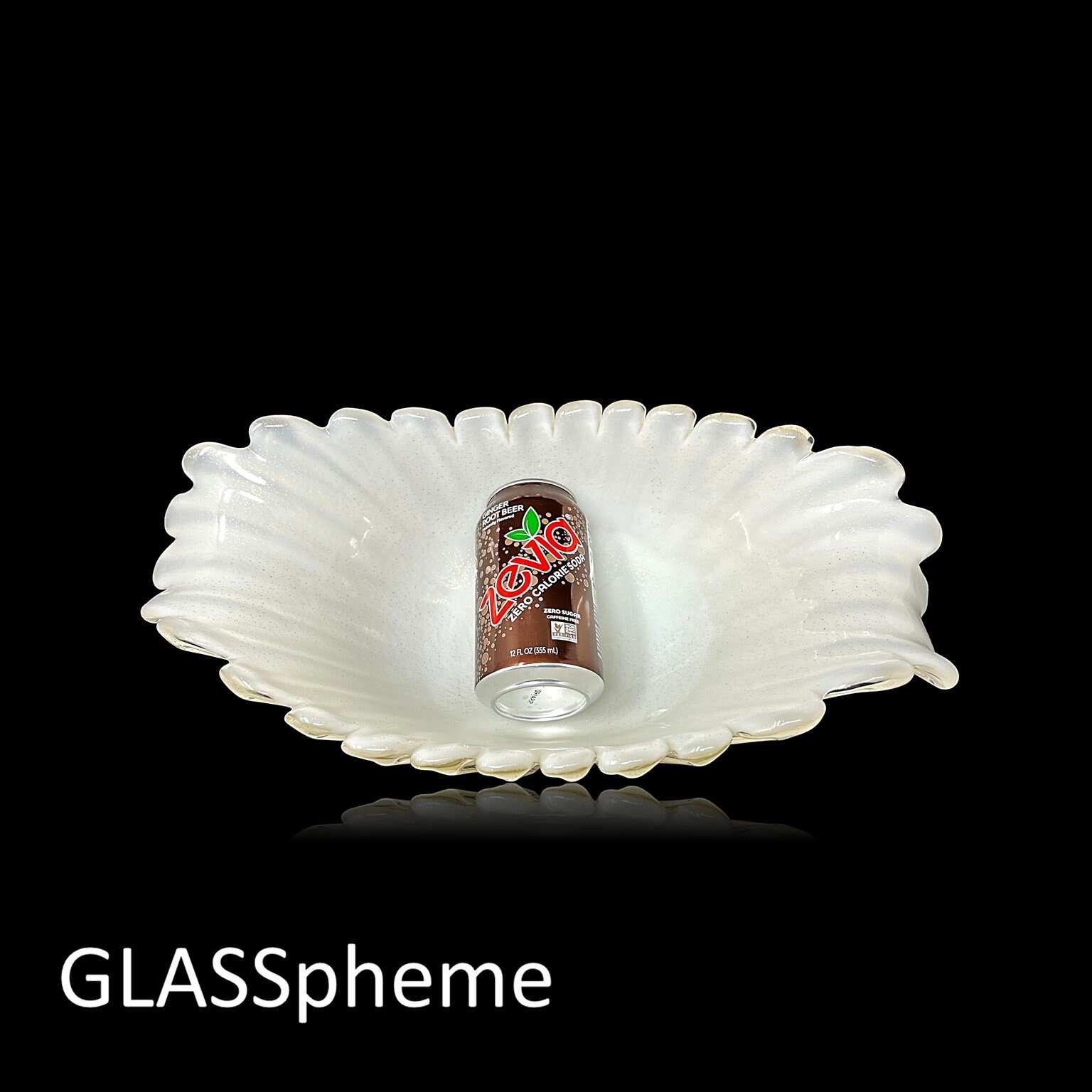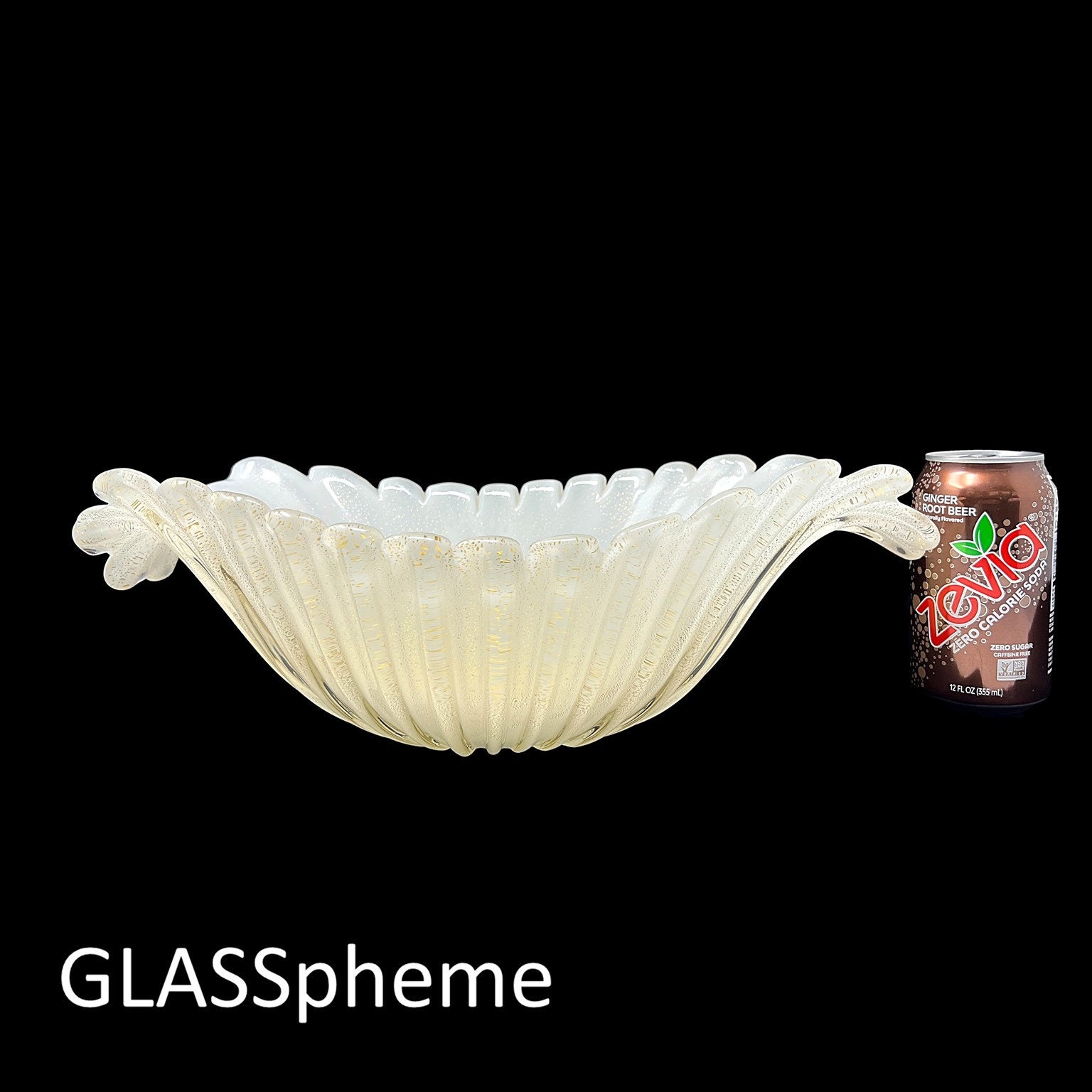 IMPOSSIBLY beautiful, this large weepworthy "lattimo oro" white opalescent gold-flecked scalloped glass bowl, console, or centerpiece by Archimede Seguso, documented in Leslie Pina's ARCHIMEDE SEGUSO (see photo above), will blow you away! At nearly 16" long and 8" wide, this supersized example of a spectacular design sports an otherworldly ethereal glow and is ready for your most prominent display. Unsigned, this nevertheless well documented Archimede Seguso design is in the mintiest condition--Museum quality!