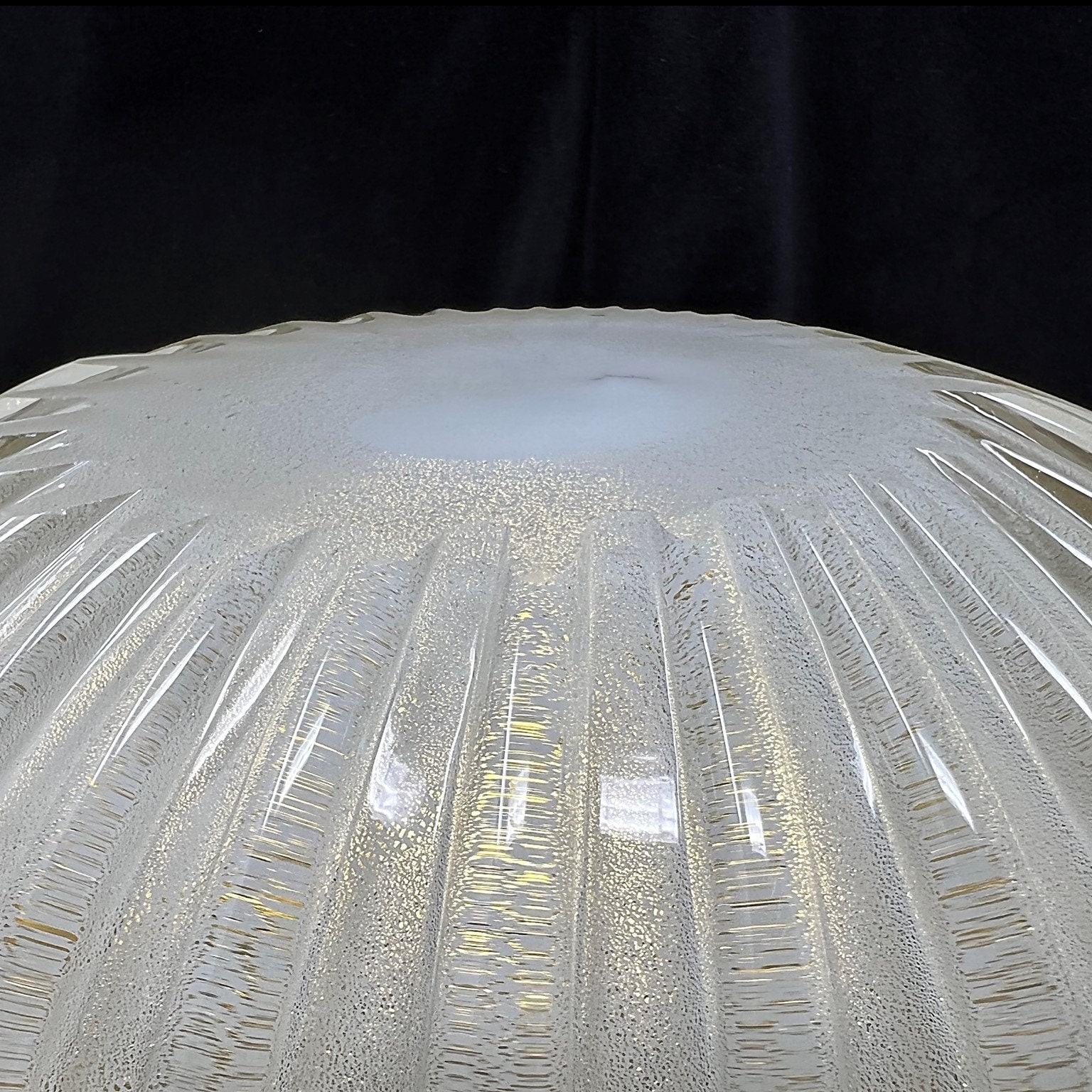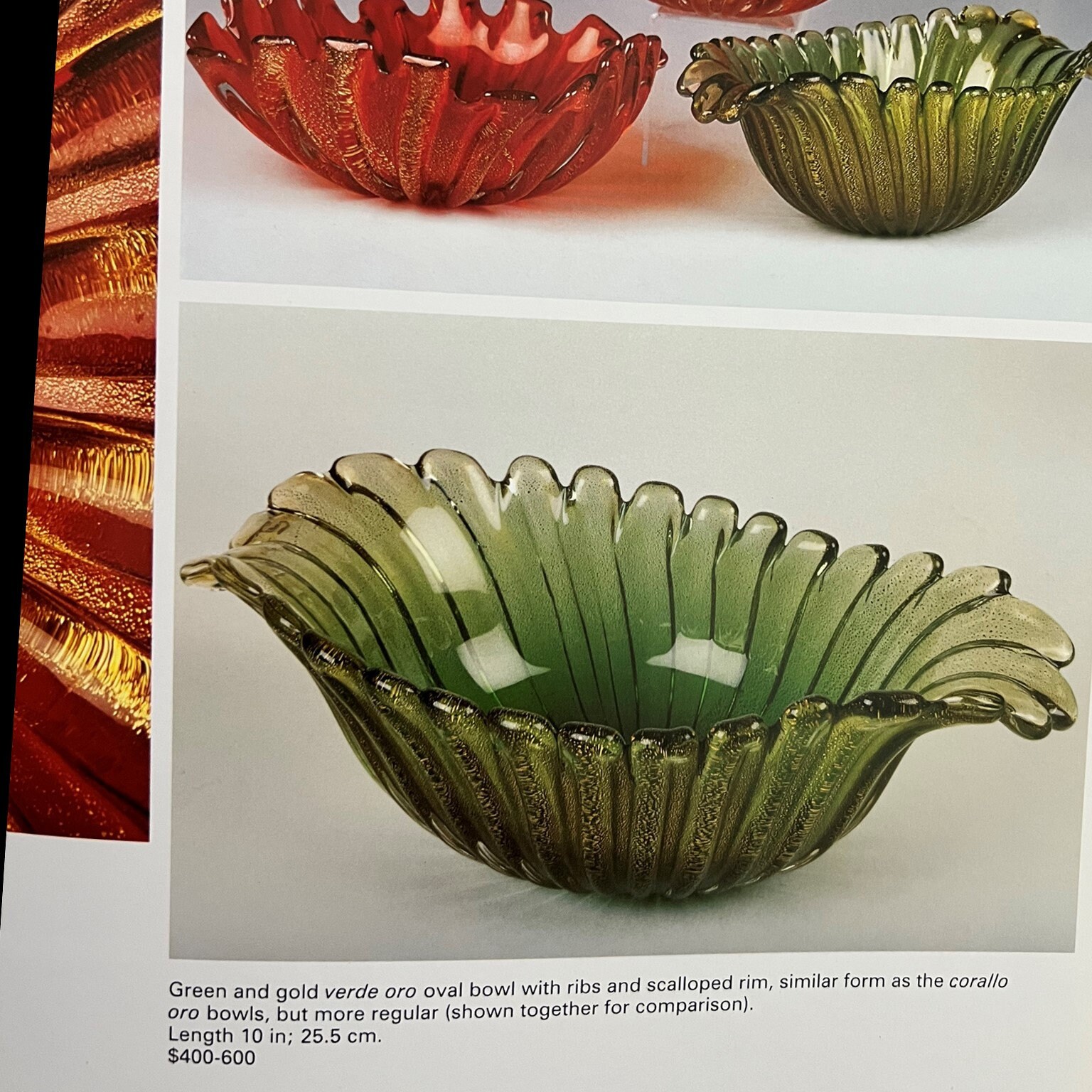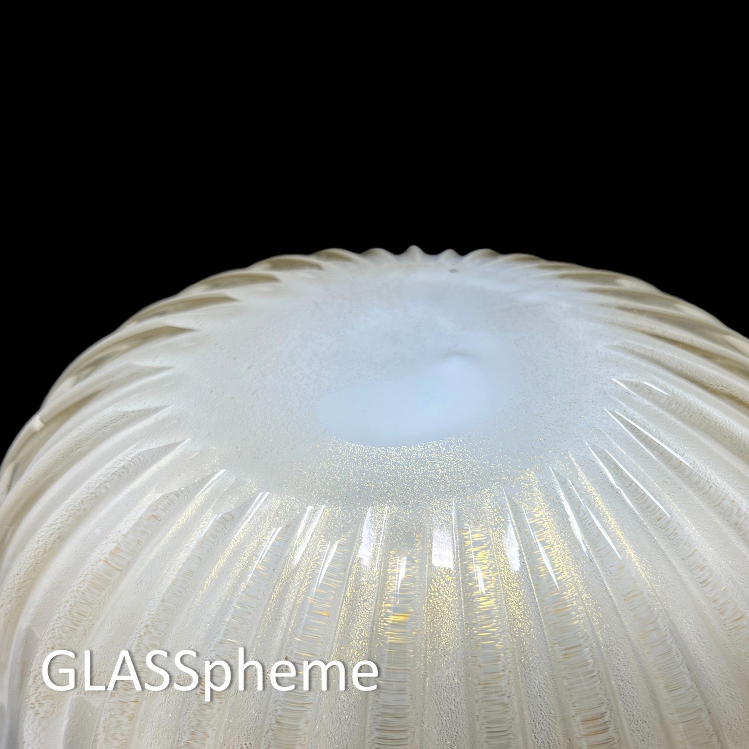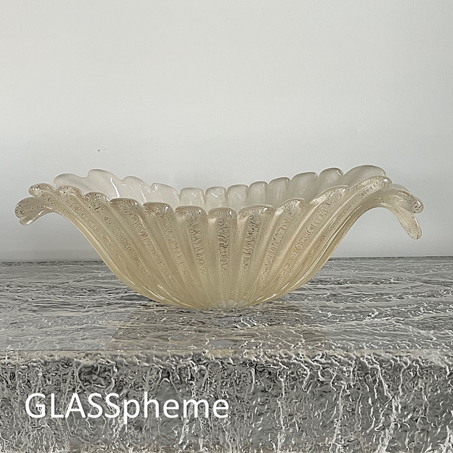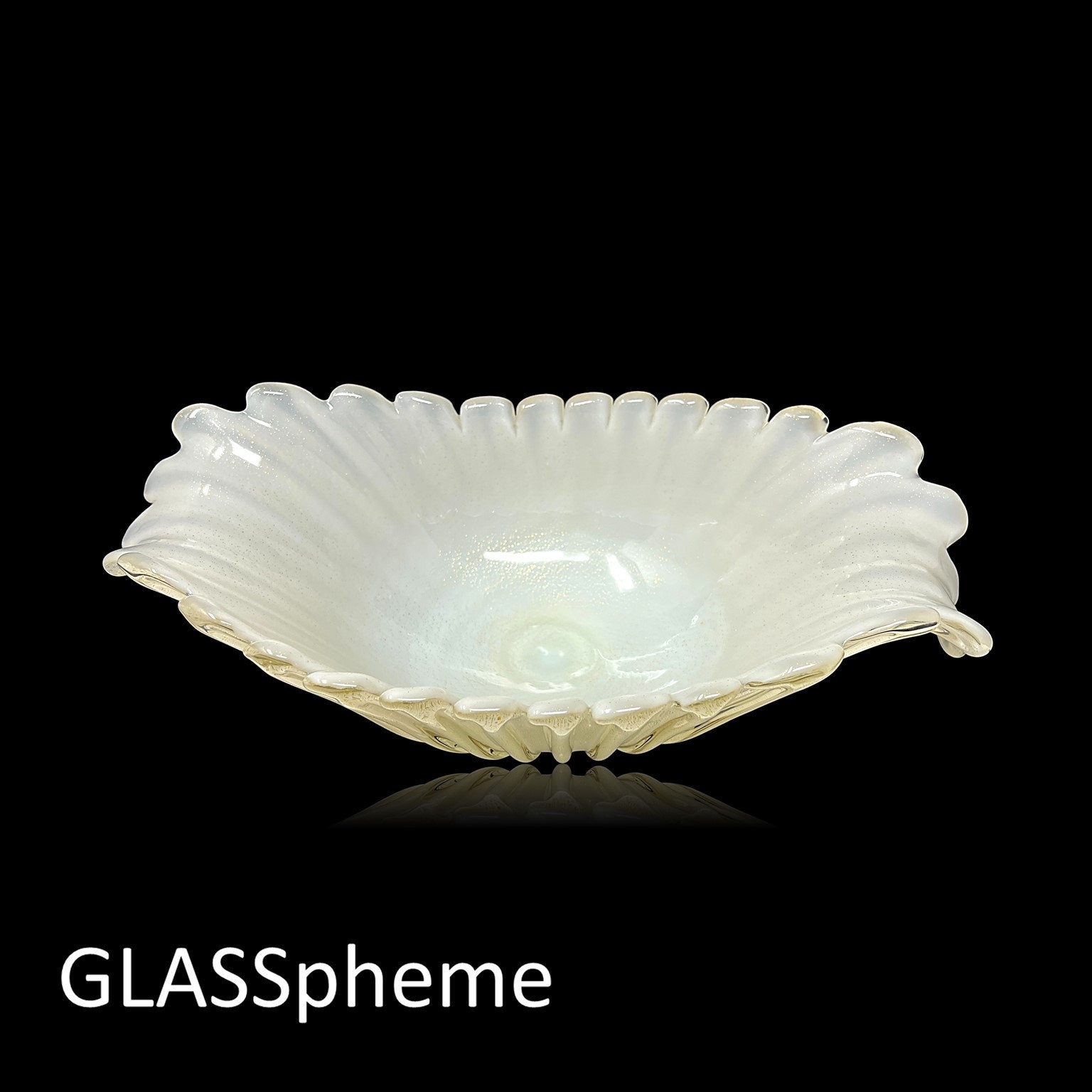 IMPOSSIBLY beautiful, this large weepworthy "lattimo oro" white opalescent gold-flecked scalloped glass bowl, console, or centerpiece by Archimede Seguso, documented in Leslie Pina's ARCHIMEDE SEGUSO (see photo above), will blow you away! At nearly 16" long and 8" wide, this supersized example of a spectacular design sports an otherworldly ethereal glow and is ready for your most prominent display. Unsigned, this nevertheless well documented Archimede Seguso design is in the mintiest condition--Museum quality!