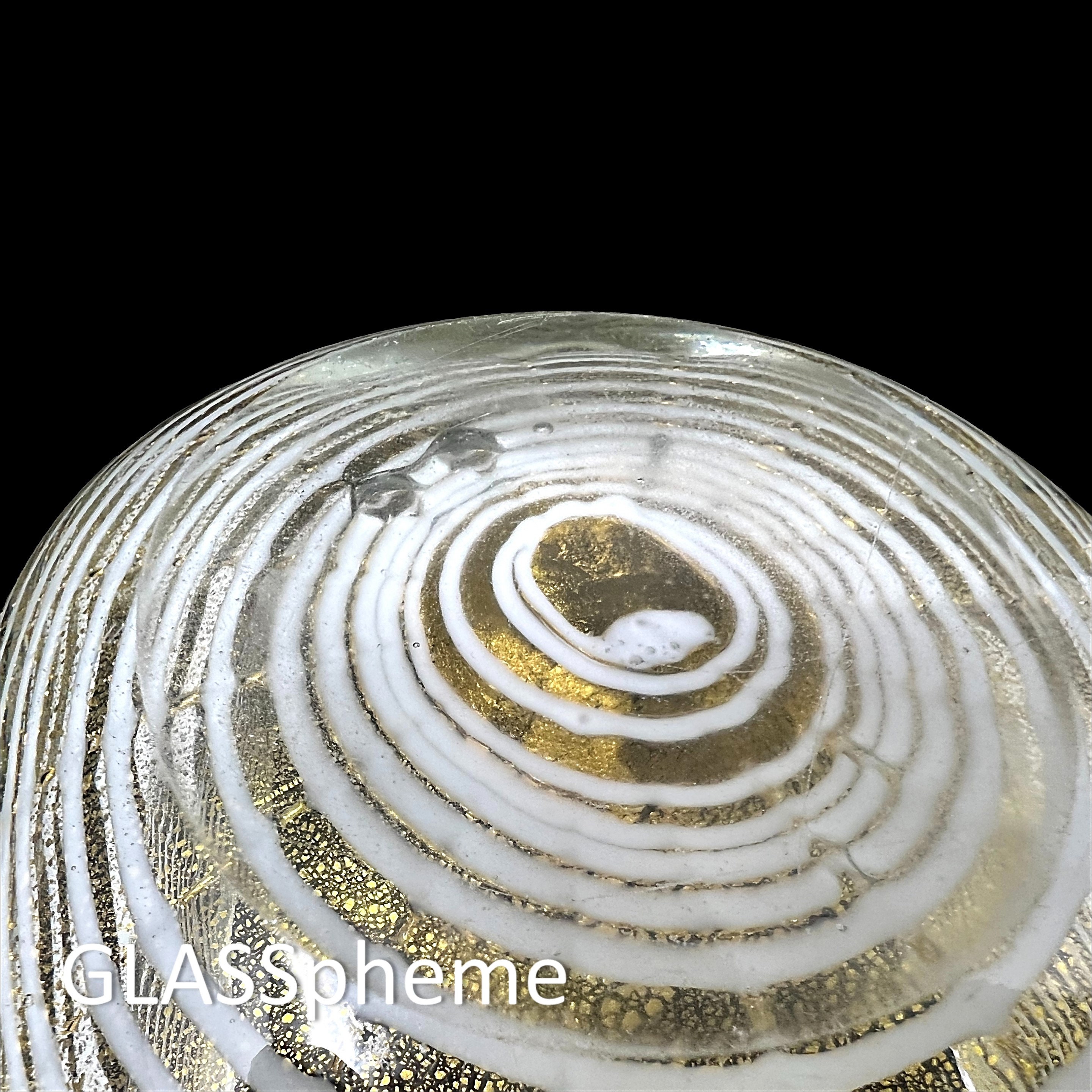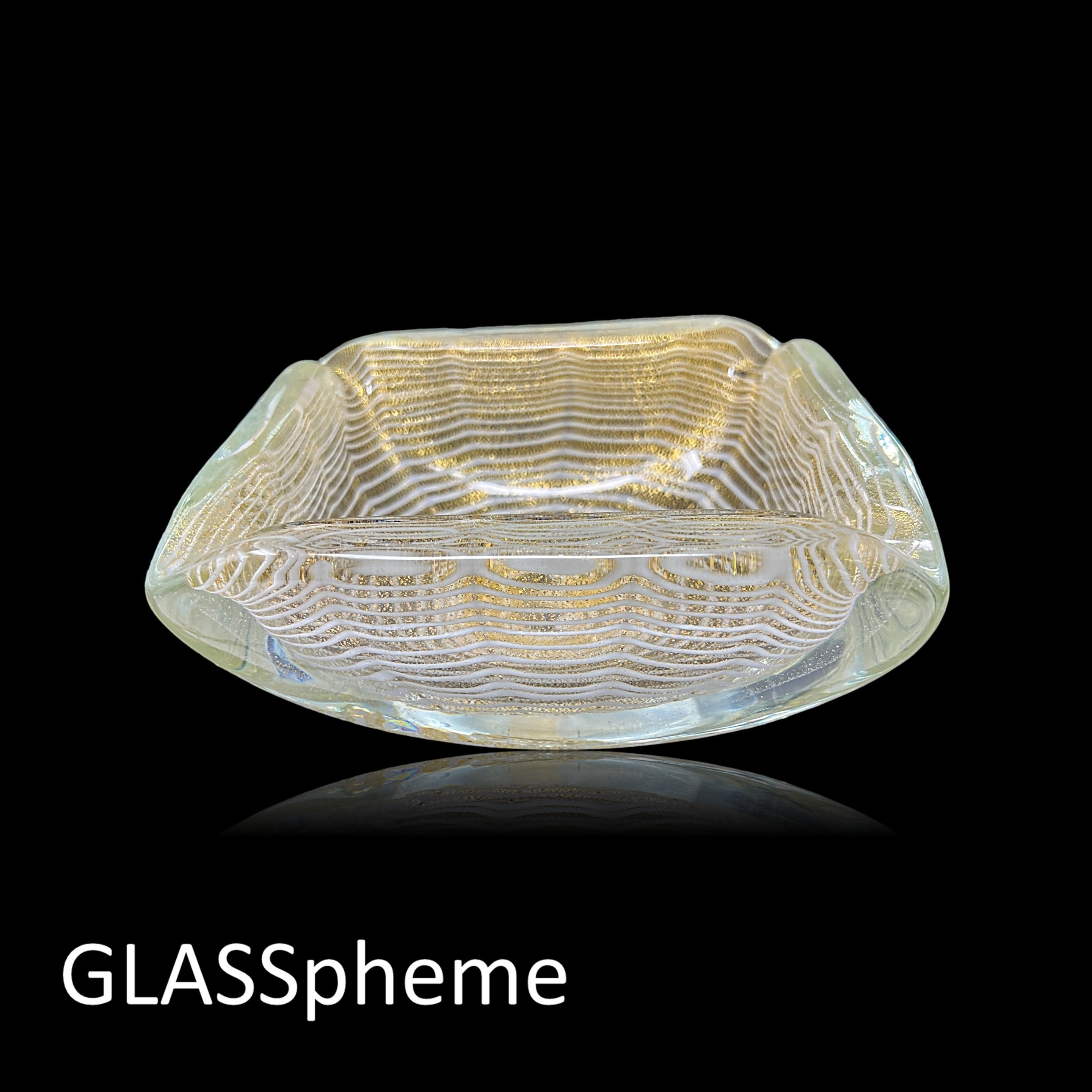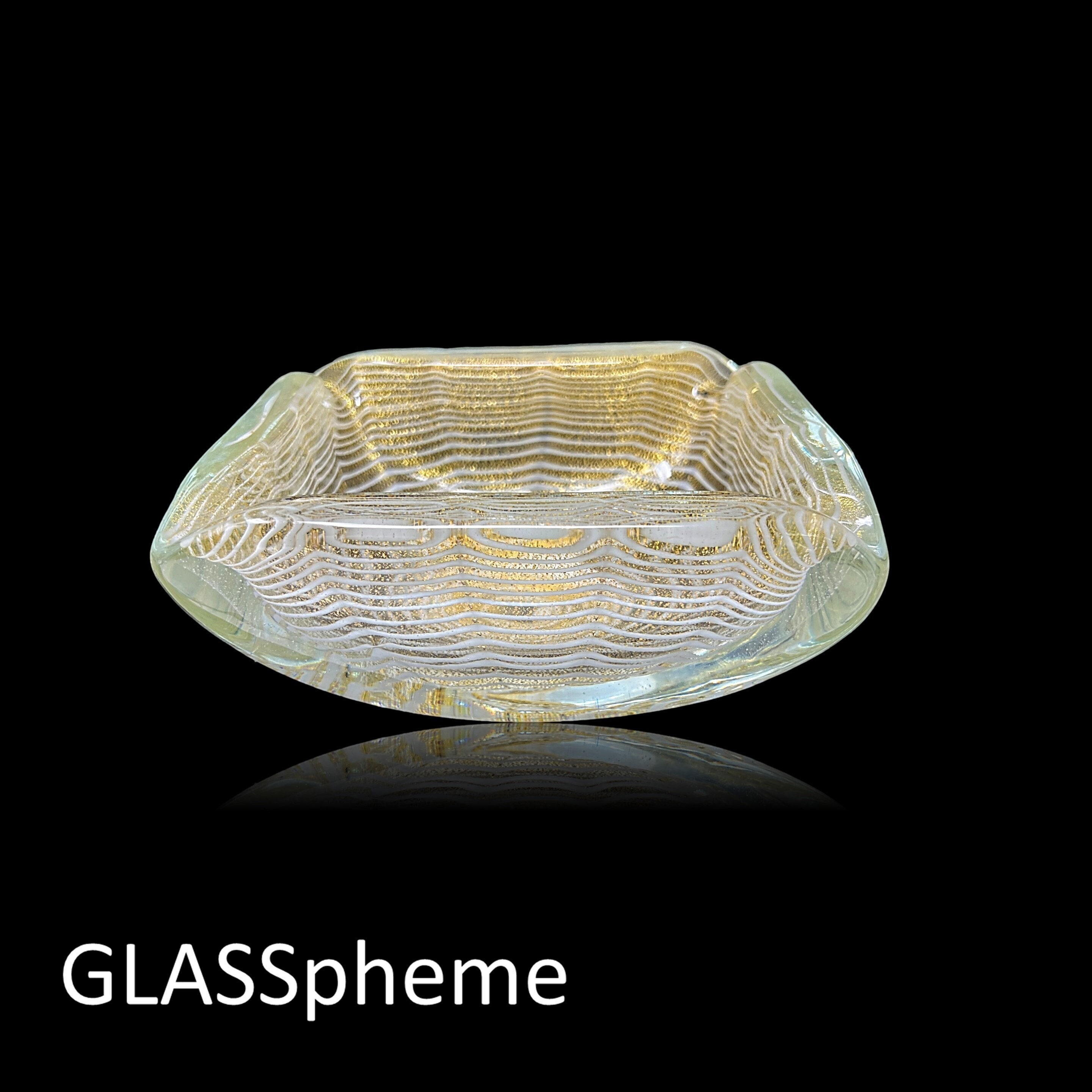 This big Barovier & Toso "Zebrati" Murano glass ashtray is both masculine AND Hollywood Regency opulent at the same time, perfect for cigars or dresser top as a trinket dish. Weighing in at over 5 lbs, this thick block-shaped beauty is about 7" long, 6.25" wide, and 3" tall. Done in clear crystal glass, it's accented with heavily flecked gold and a white lattimo swirl throughout. Condition is PERFECT, with the base wear expected of a heavy vintage piece. What a fabulous statement piece and the perfect gift!