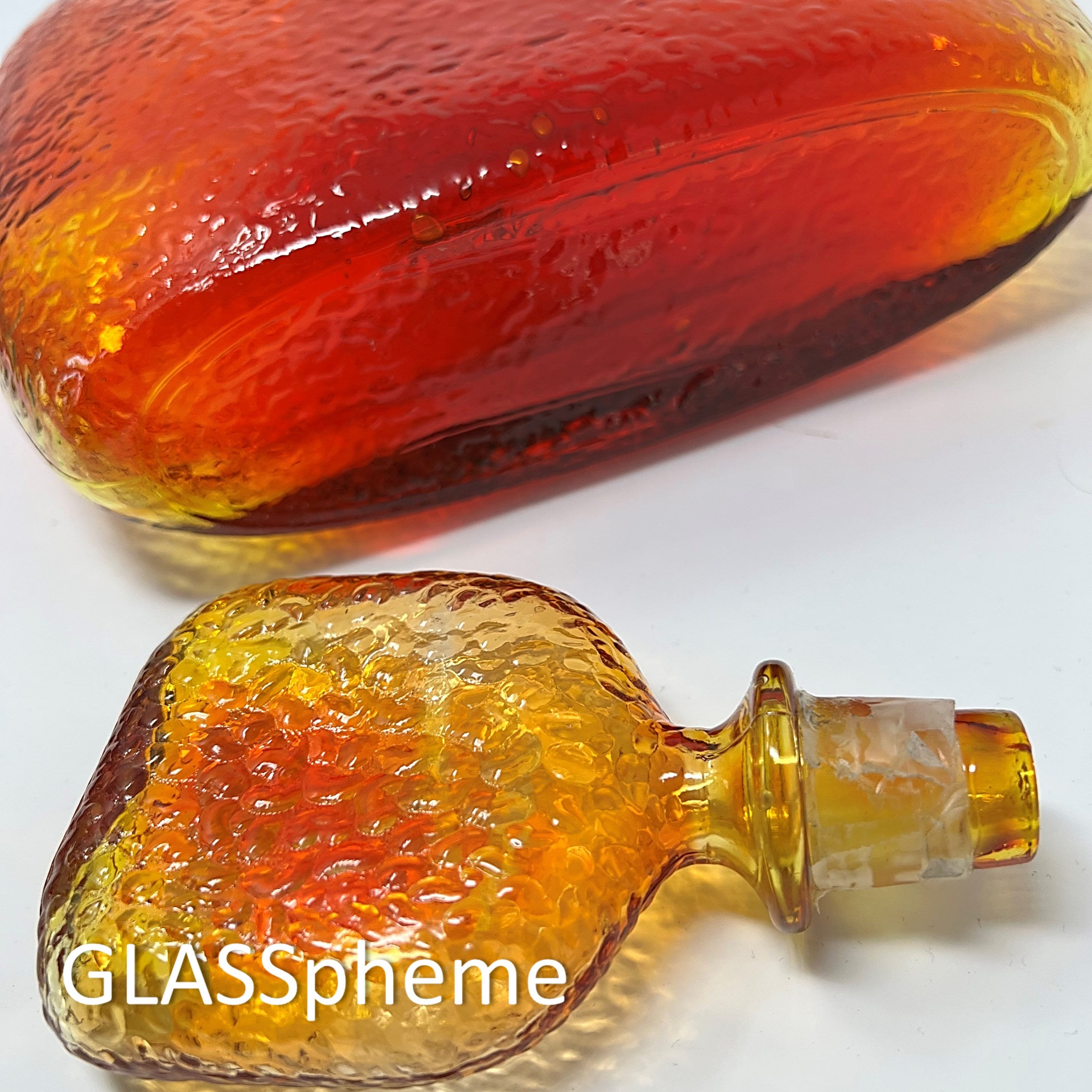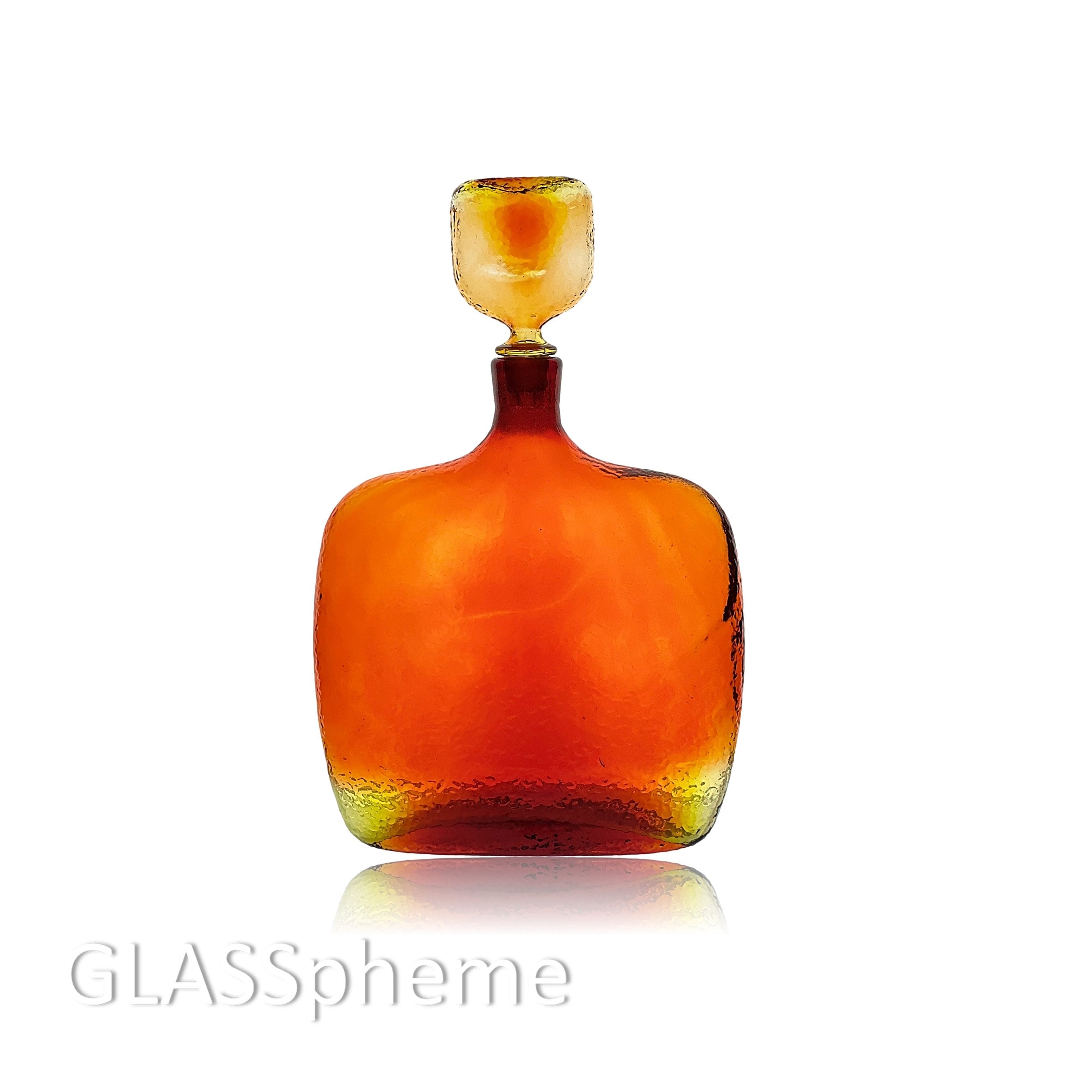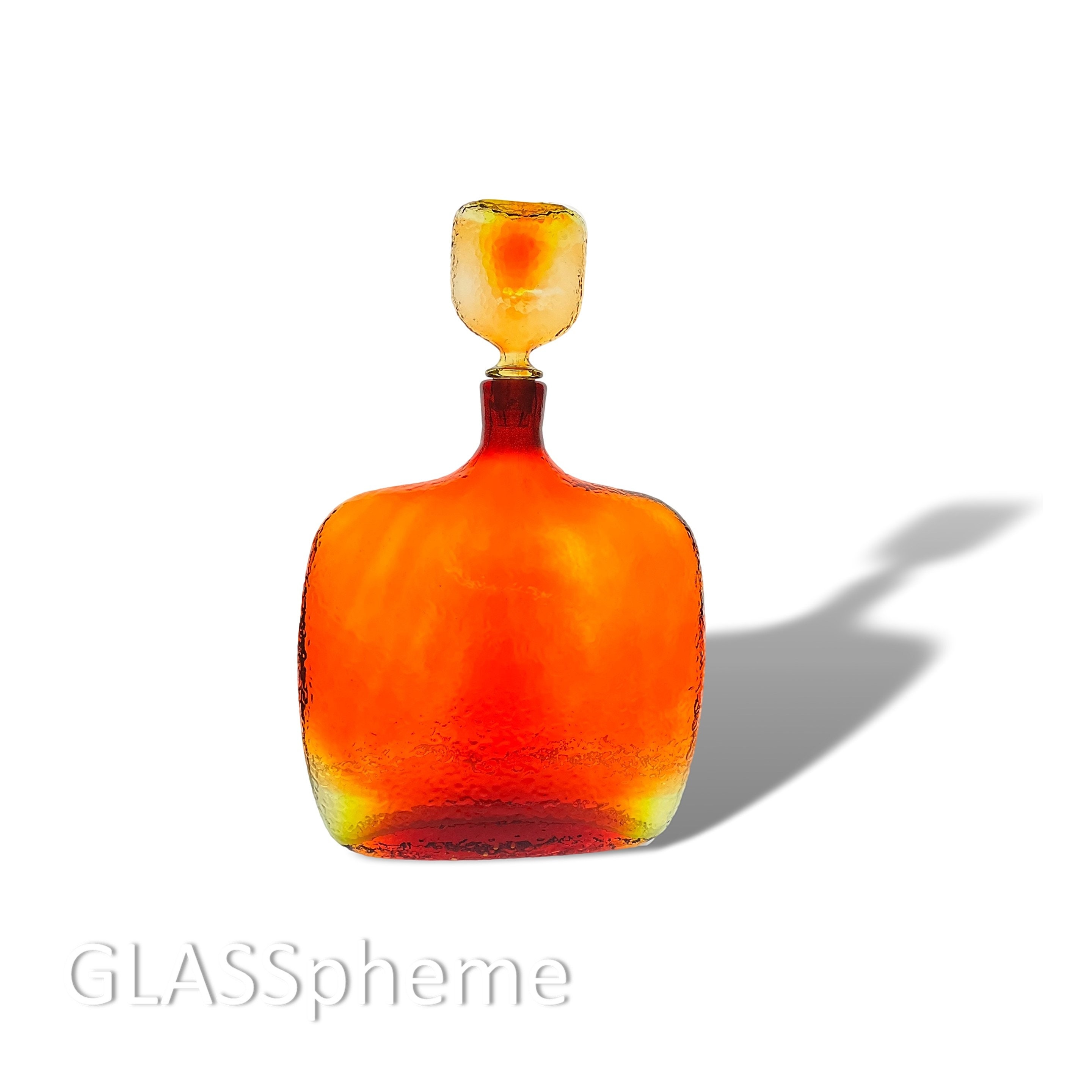 You're looking at a BIG DAZZLING midcentury Empoli textured glass decanter in bright orange amberina. Blenko fans KNOW this design -- Wayne Husted's super-mod, crazy rare and highly coveted #6315 flat-sided decanter. This Empoli production is a copy, but it is quite spectacular in its own right! Over 15" tall and 10" wide, this fabulous mid-century mod textured piece explodes with light, especially when placed in front of a sunny window. (It's actually a great piece for a window-sill because it's only about 3" deep.) Our unusual Empoli beauty is in PERFECT condition. The tape on the stopper is simply to enhance the fit--there is no damage anywhere. Moreover, this beauty is pristinely clean, as if it never held liquid.