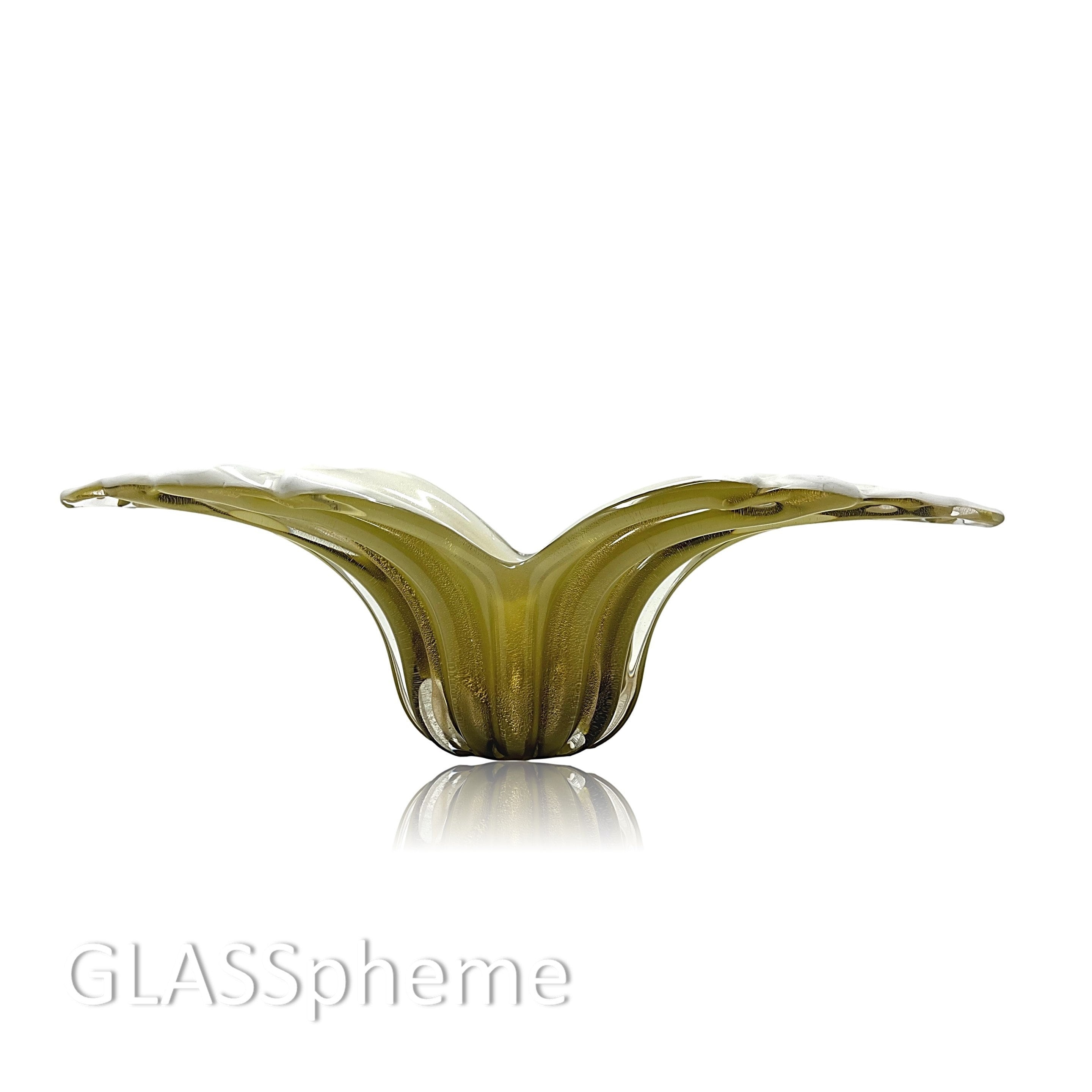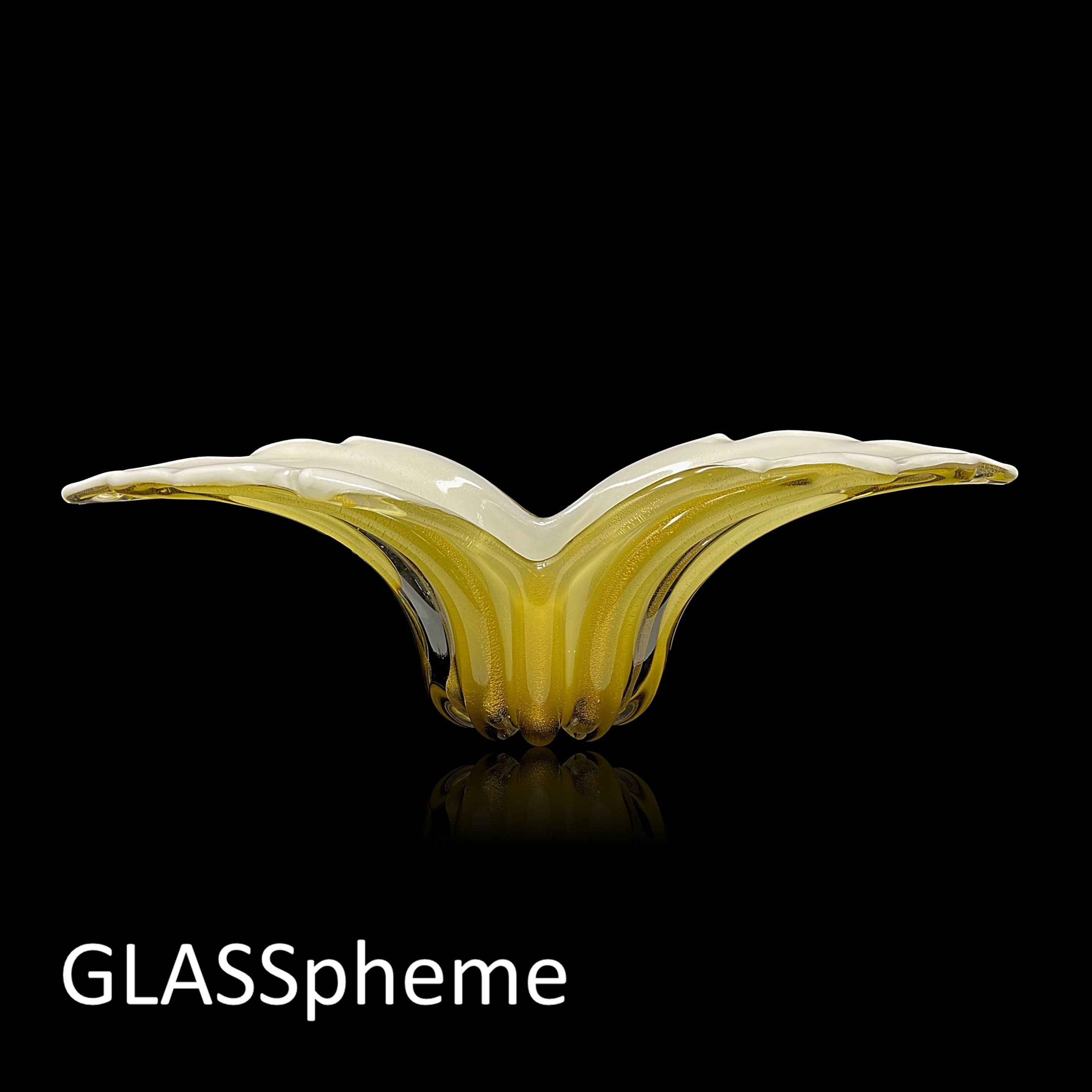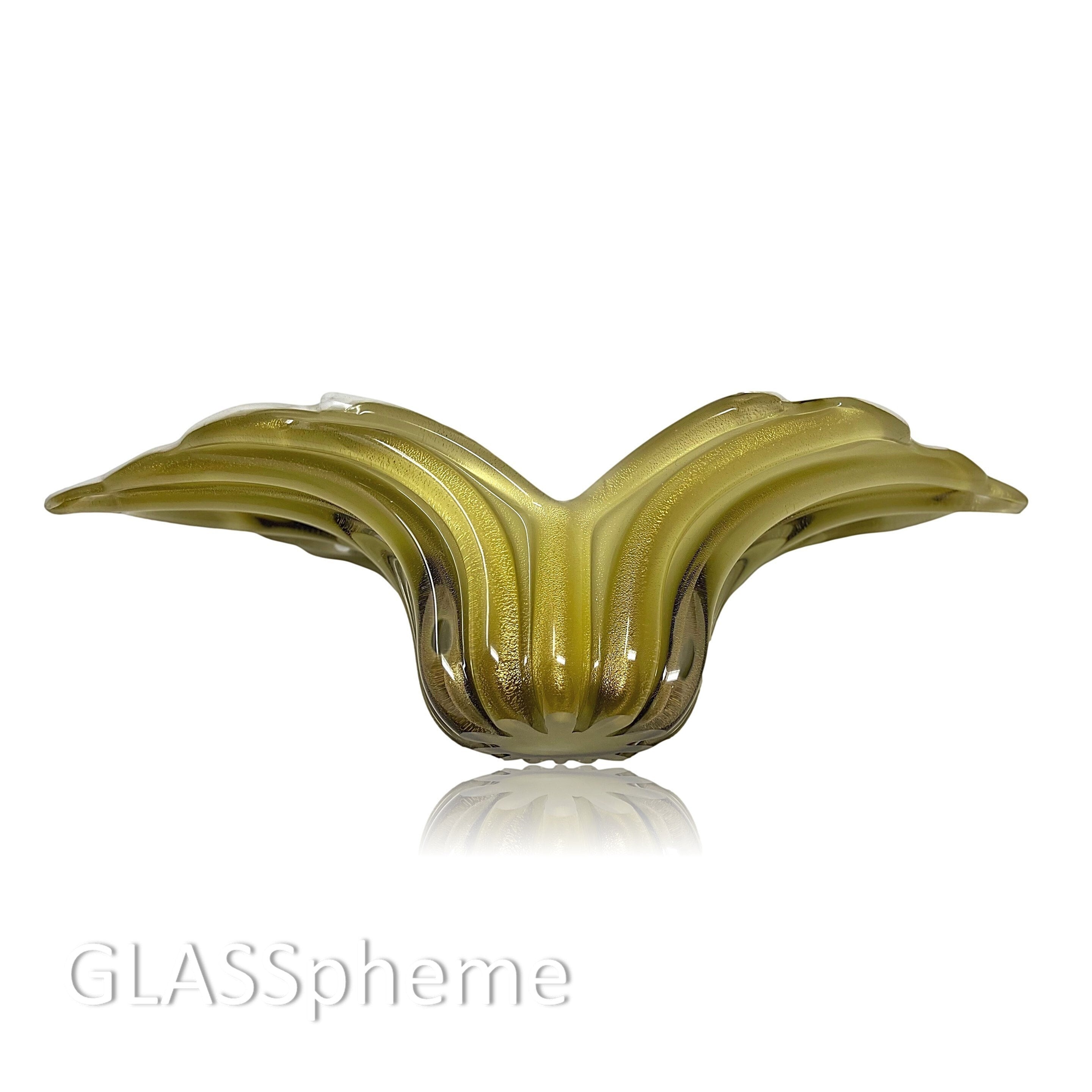 Alfredo Barbini's dramatically formed winged ribbed glass bowl | centerpiece is one of his most famous and sought after designs, with good reason: the grace and movement in this piece will never fail to take your breath away! Produced exclusively for Weil Ceramics and Glass in the 1960s, our Barbini beauty no longer sports its label but this design is highly documented and, in fact, appears on page 1 of Weil's Barbini catalog. (See last photo!)