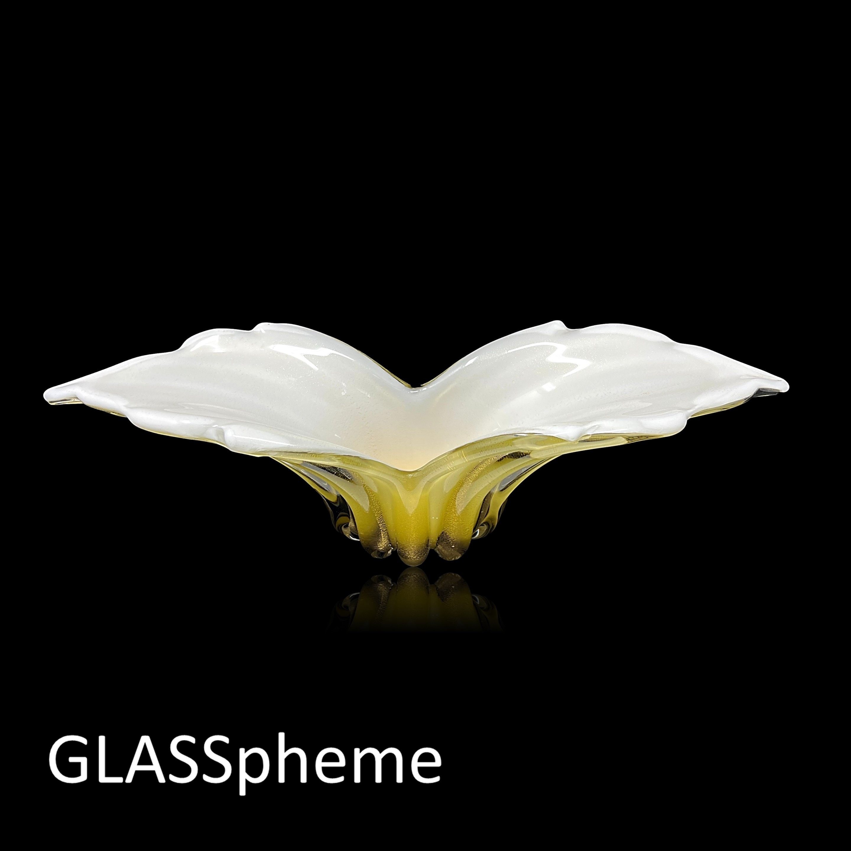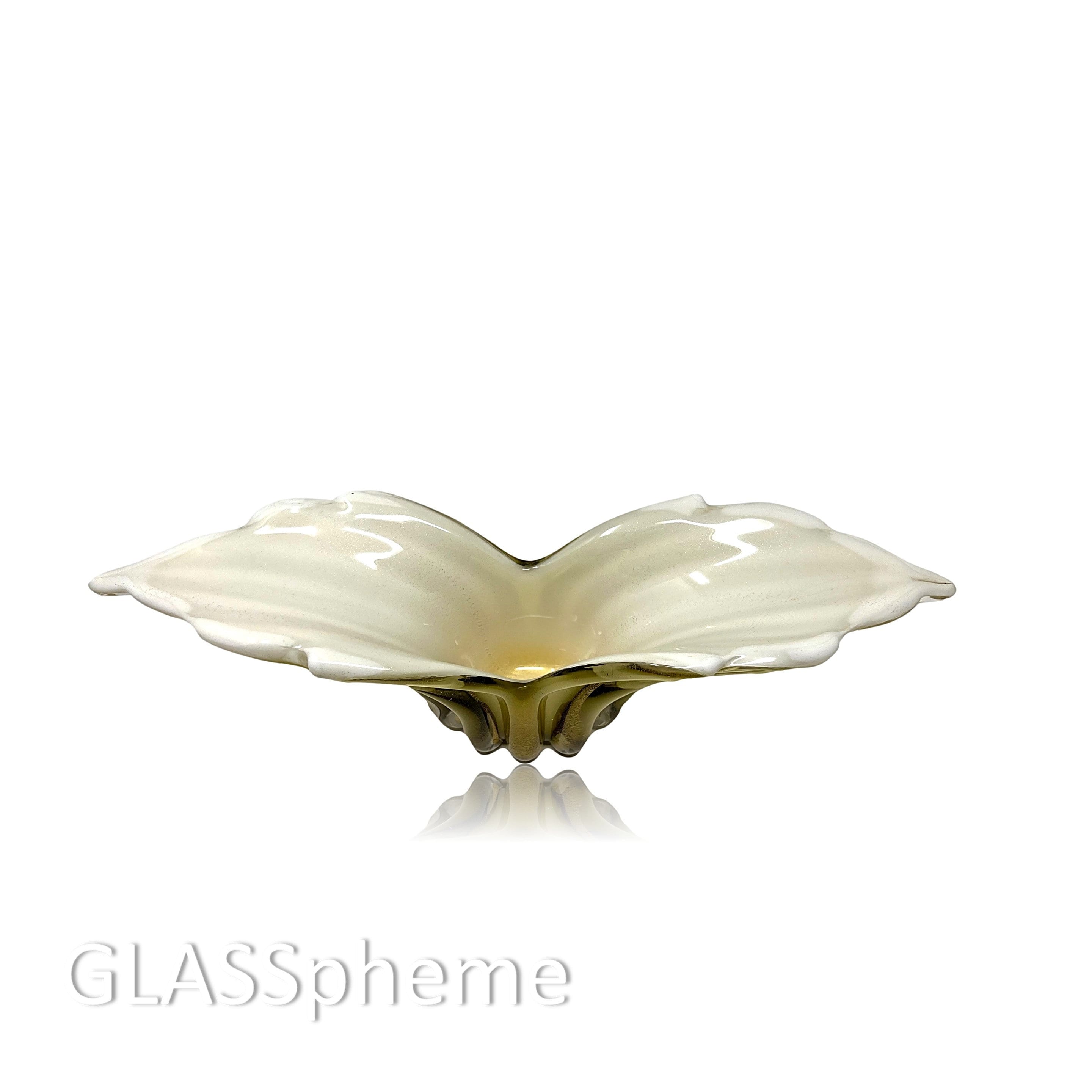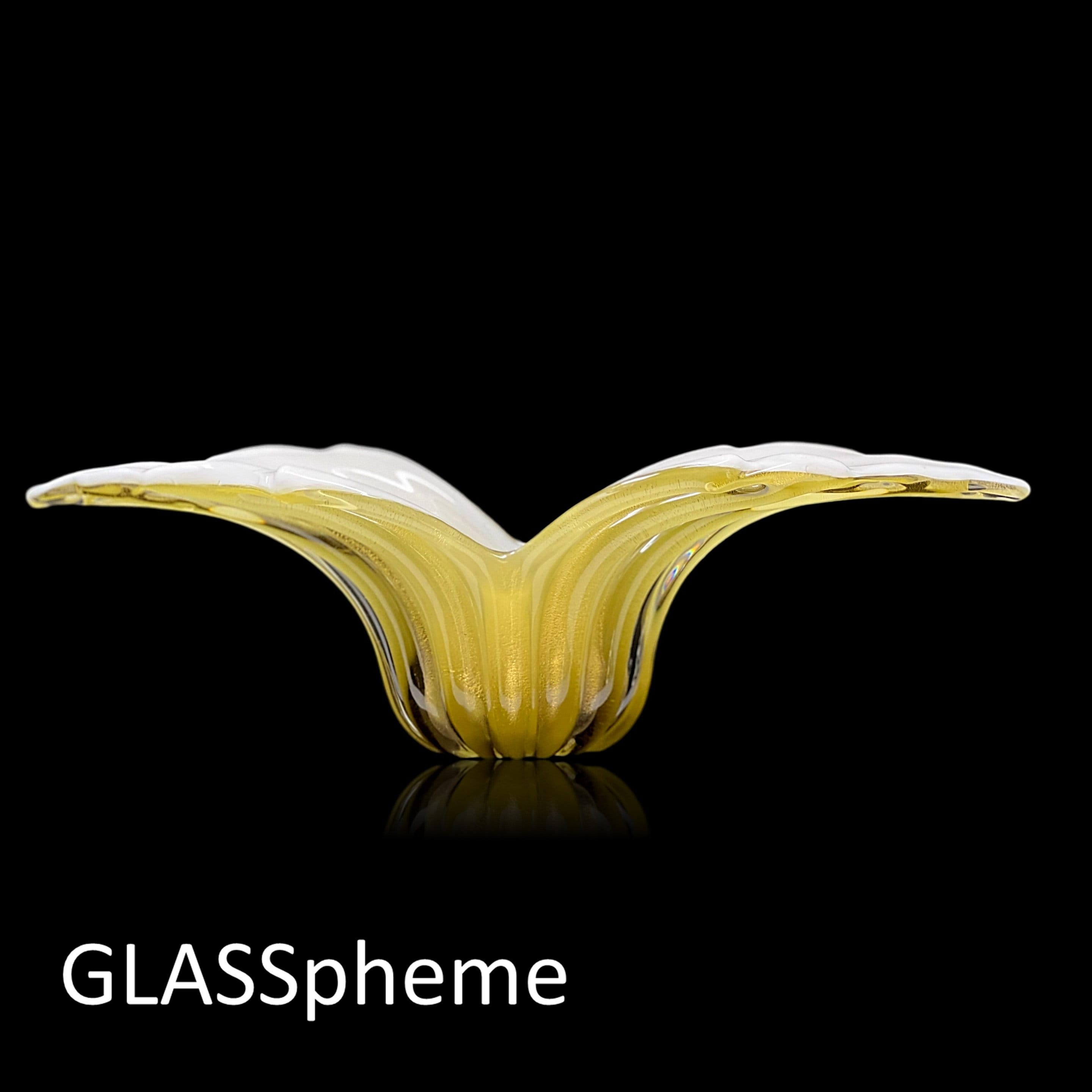 Alfredo Barbini's dramatically formed winged ribbed glass bowl | centerpiece is one of his most famous and sought after designs, with good reason: the grace and movement in this piece will never fail to take your breath away! Produced exclusively for Weil Ceramics and Glass in the 1960s, our Barbini beauty no longer sports its label but this design is highly documented and, in fact, appears on page 1 of Weil's Barbini catalog. (See last photo!)