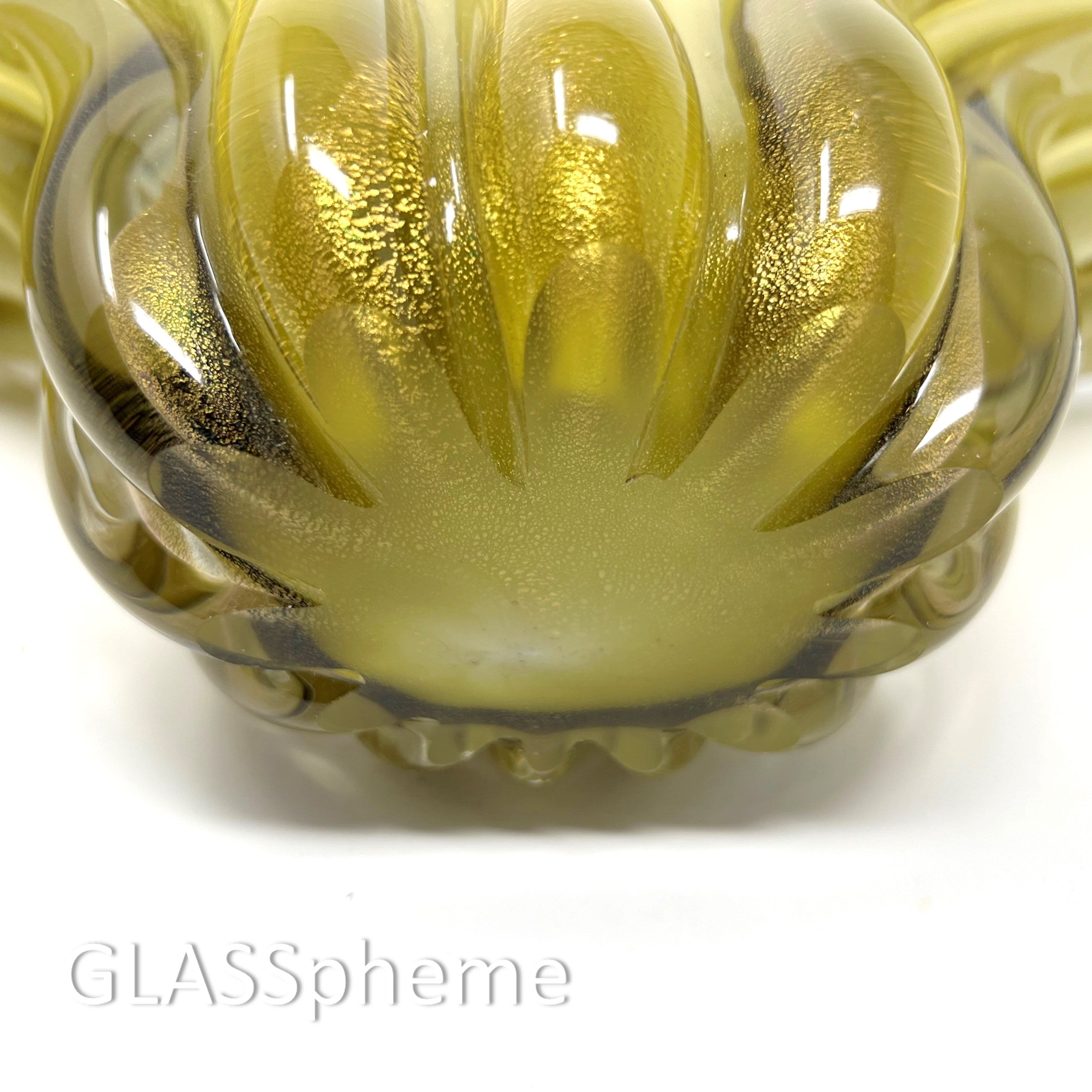 This gorgeous specimen is ridiculously OPULENT in a gold flecked lattimo submerged in thick ribs of crystal. Pure luxury and elegance, this sparkling gold beauty is probably the most popular variation of them all. Or at least the hardest to keep in stock!