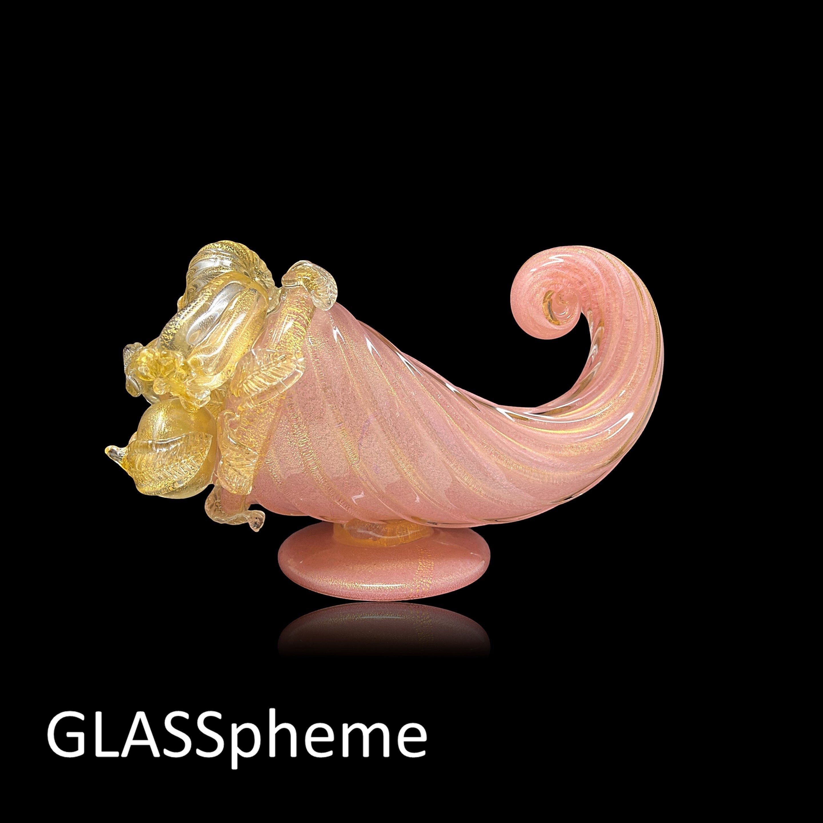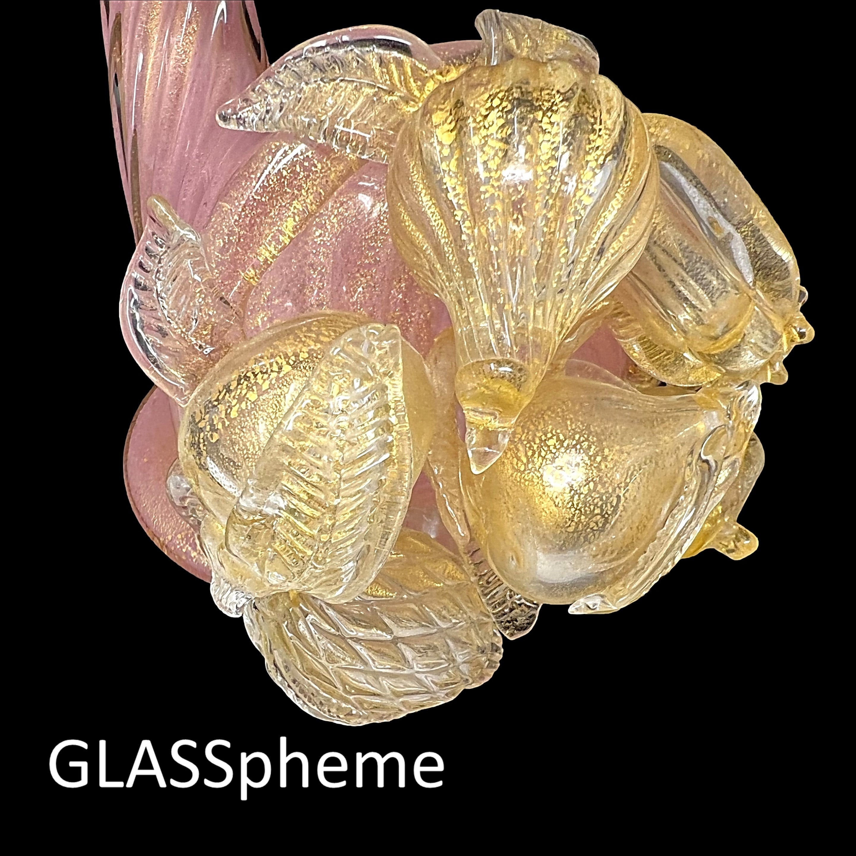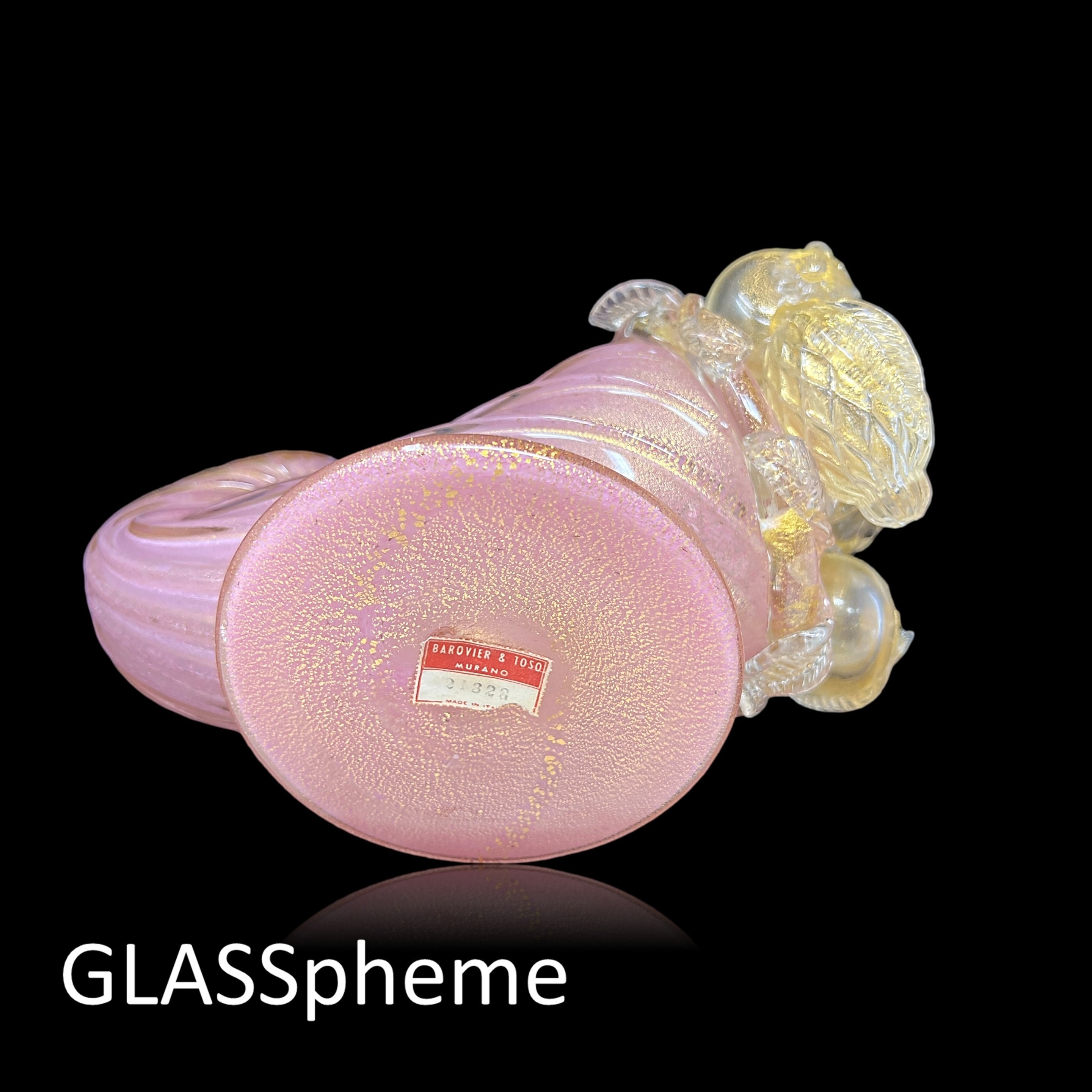 You're looking at a very large Hollywood Regency masterpiece--a SUBLIME BAROVIER & TOSO cornucopia (or "horn of plenty") with label. Done in pink incamiciato with gold leaf encased in thick crystal glass ribs and adorned with crystal and gold flecked fruit, this gorgeous rare beauty will haunt your dreams if someone else grabs it first! These lavish mid-century pieces with delicate appendages like leaves and stems tend not to make it through the decades unscathed, but our beauty has suffered only one minor loss that you would unlikely find if not pointed out: it is featured on the first photo, and pointed out with an arrow on our last. (If not for the telltale rough edge, I'd never have noticed it, myself.)