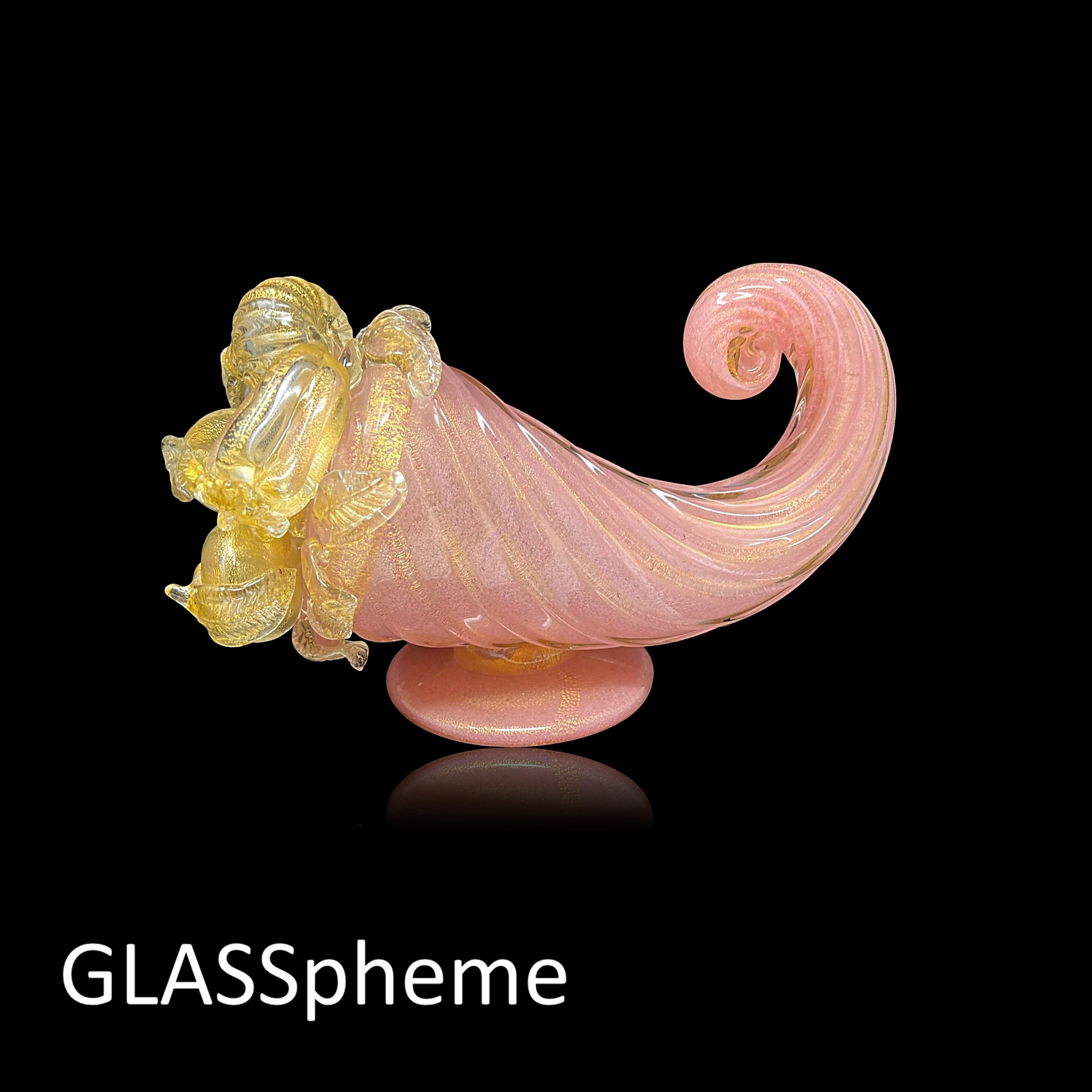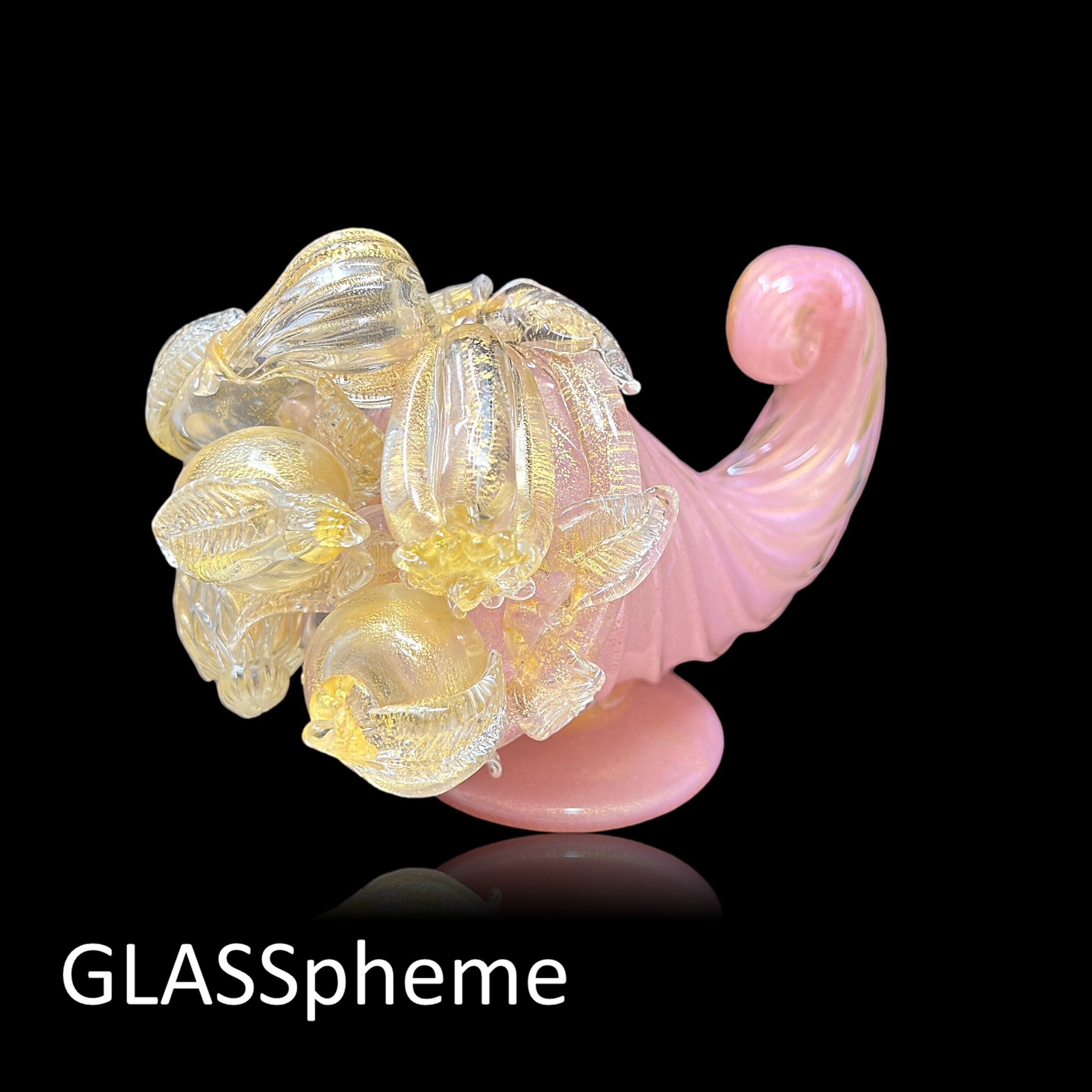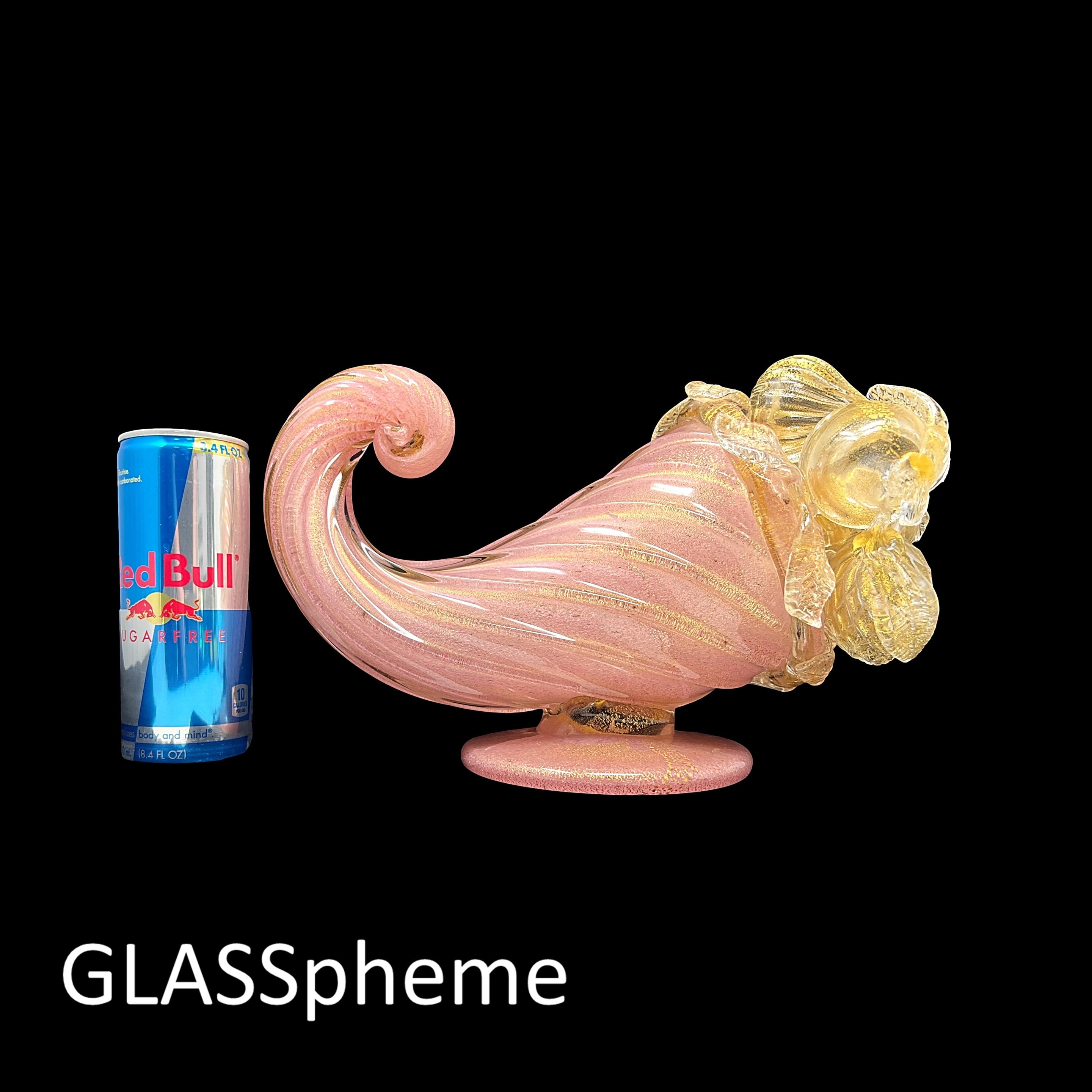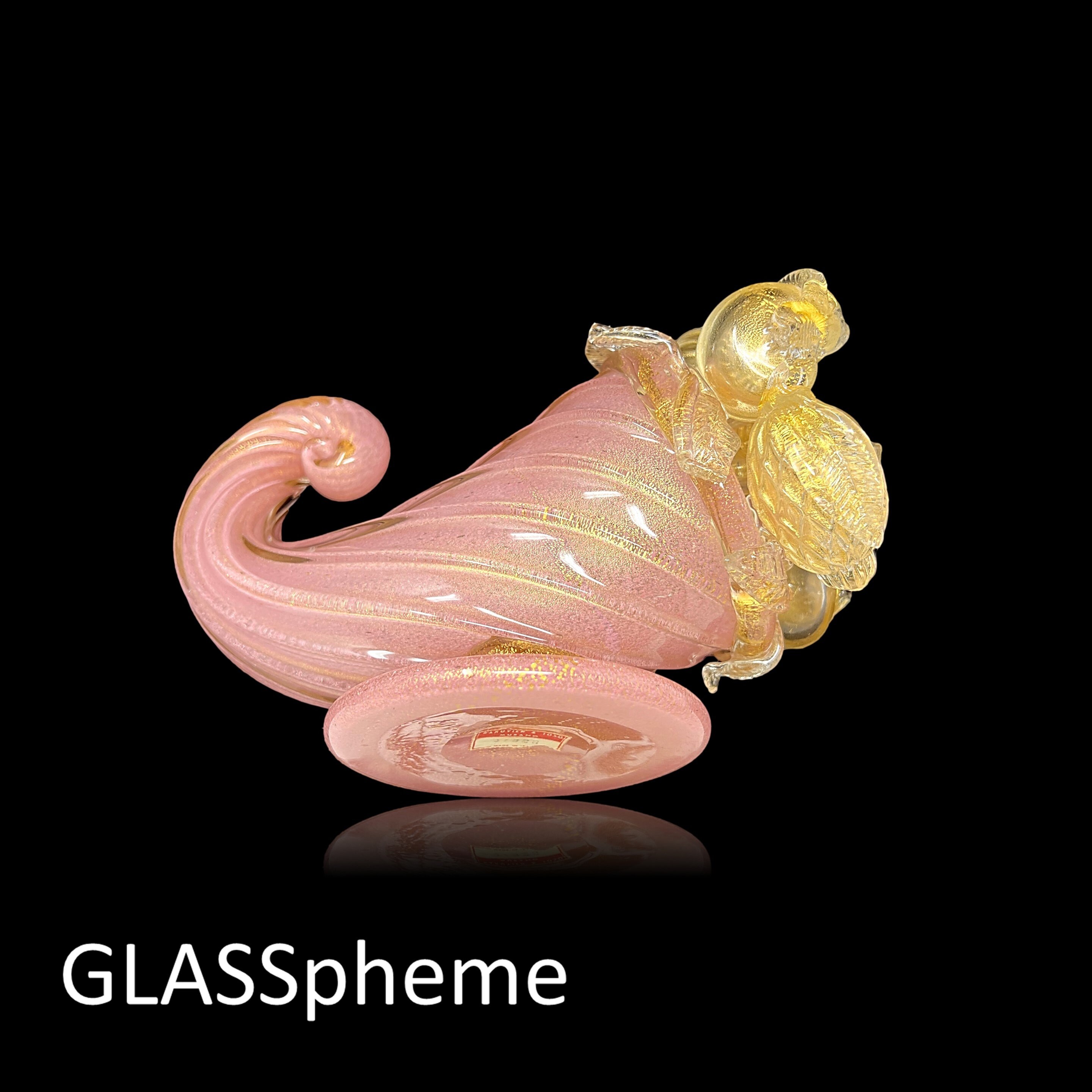 You're looking at a very large Hollywood Regency masterpiece--a SUBLIME BAROVIER & TOSO cornucopia (or "horn of plenty") with label. Done in pink incamiciato with gold leaf encased in thick crystal glass ribs and adorned with crystal and gold flecked fruit, this gorgeous rare beauty will haunt your dreams if someone else grabs it first! These lavish mid-century pieces with delicate appendages like leaves and stems tend not to make it through the decades unscathed, but our beauty has suffered only one minor loss that you would unlikely find if not pointed out: it is featured on the first photo, and pointed out with an arrow on our last. (If not for the telltale rough edge, I'd never have noticed it, myself.)
