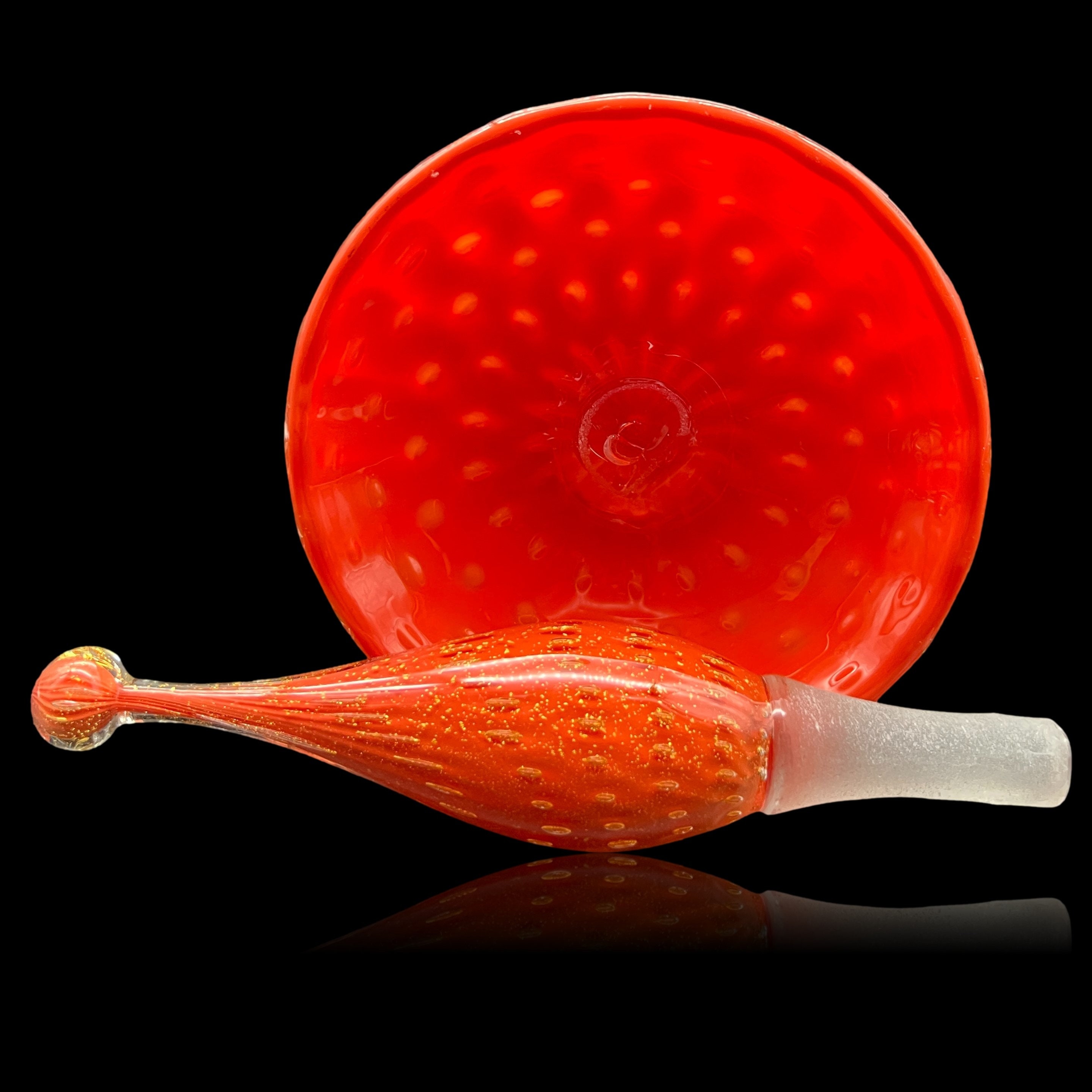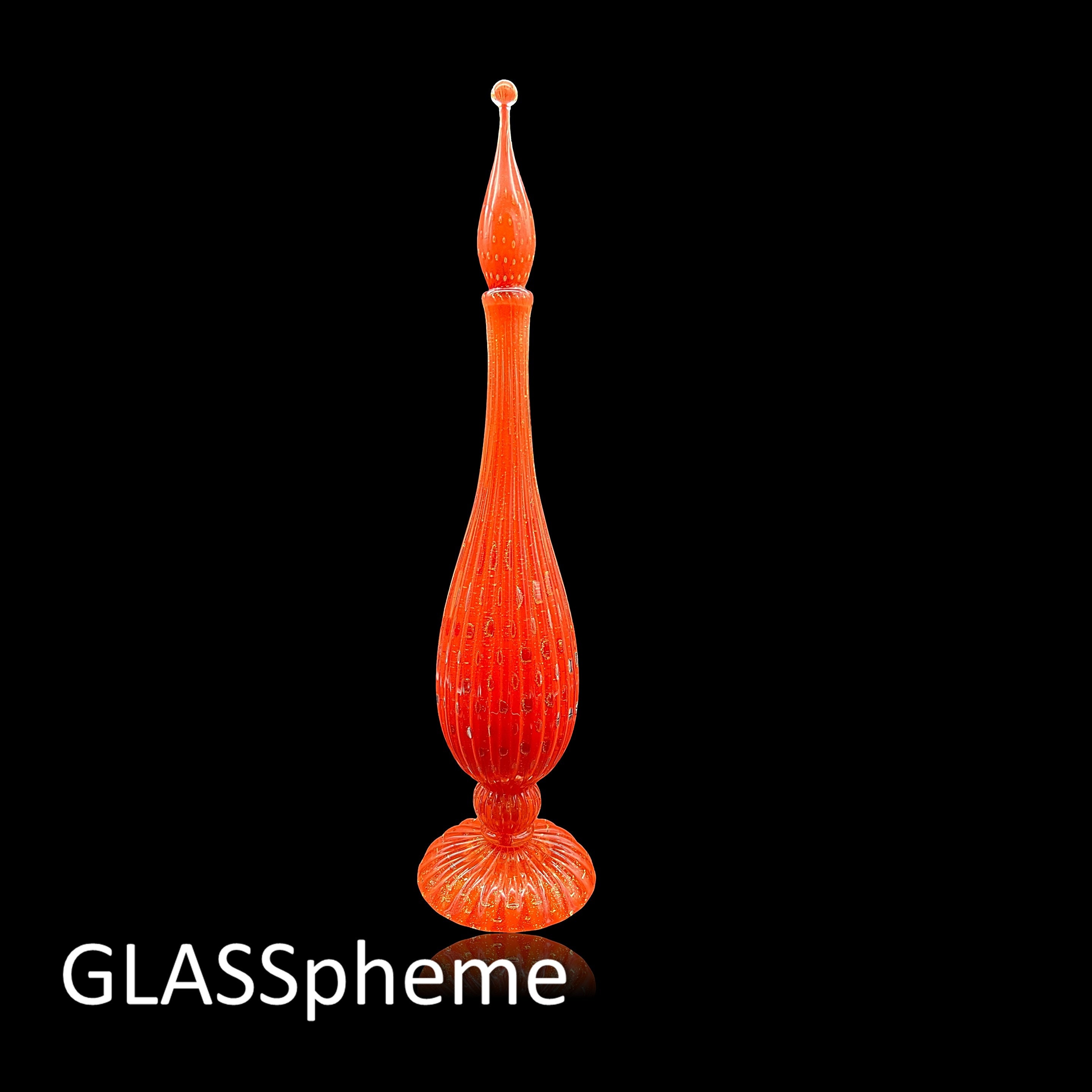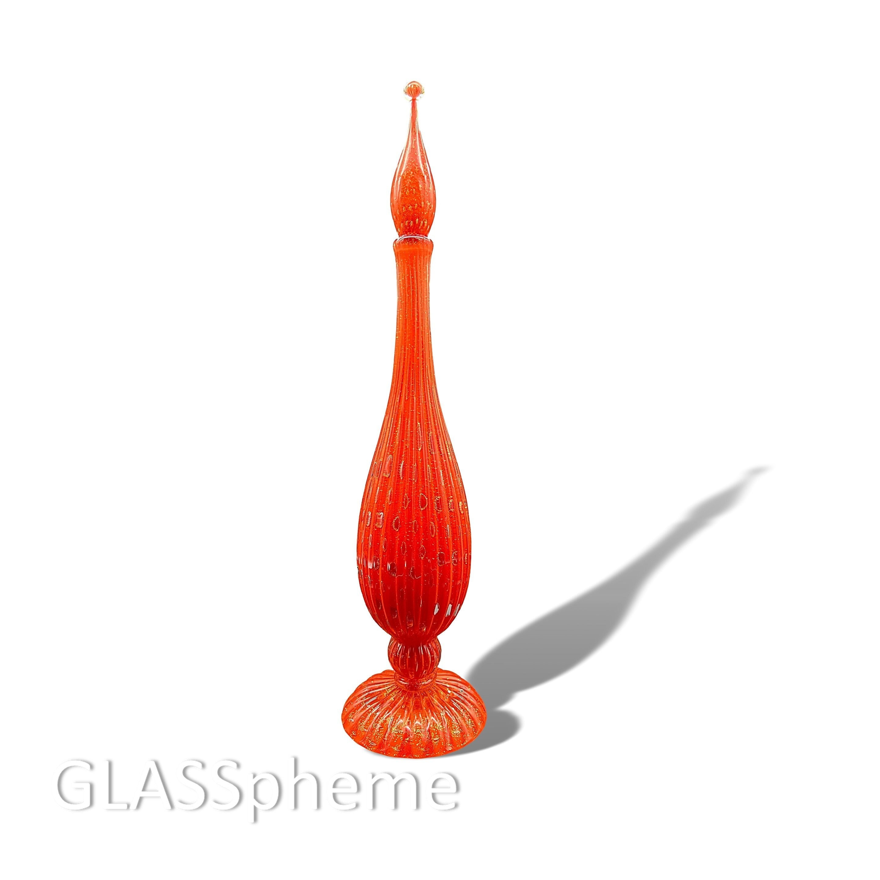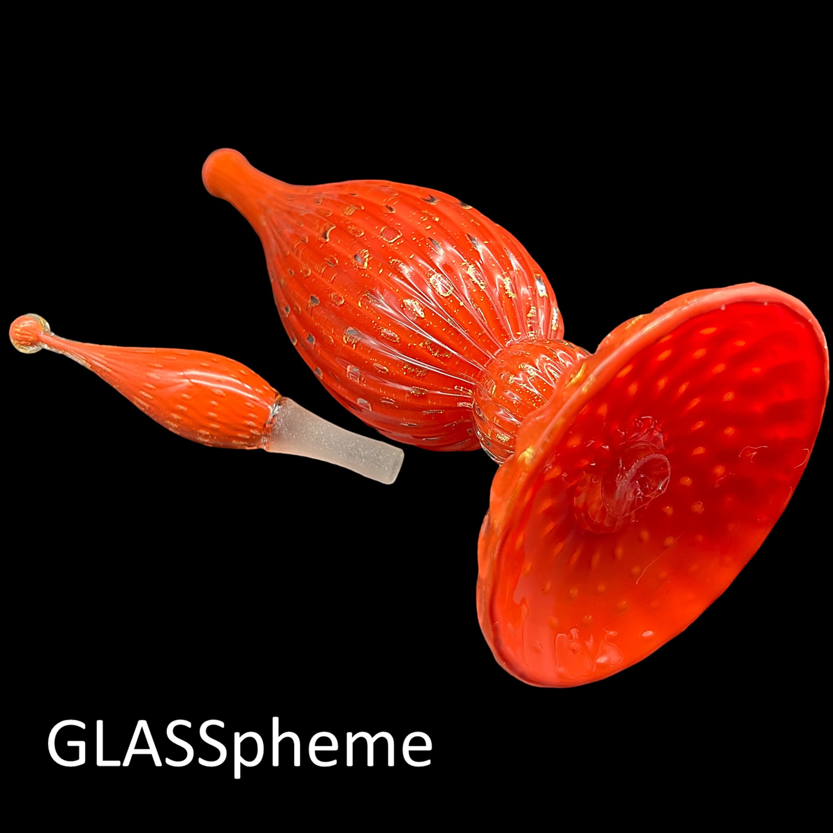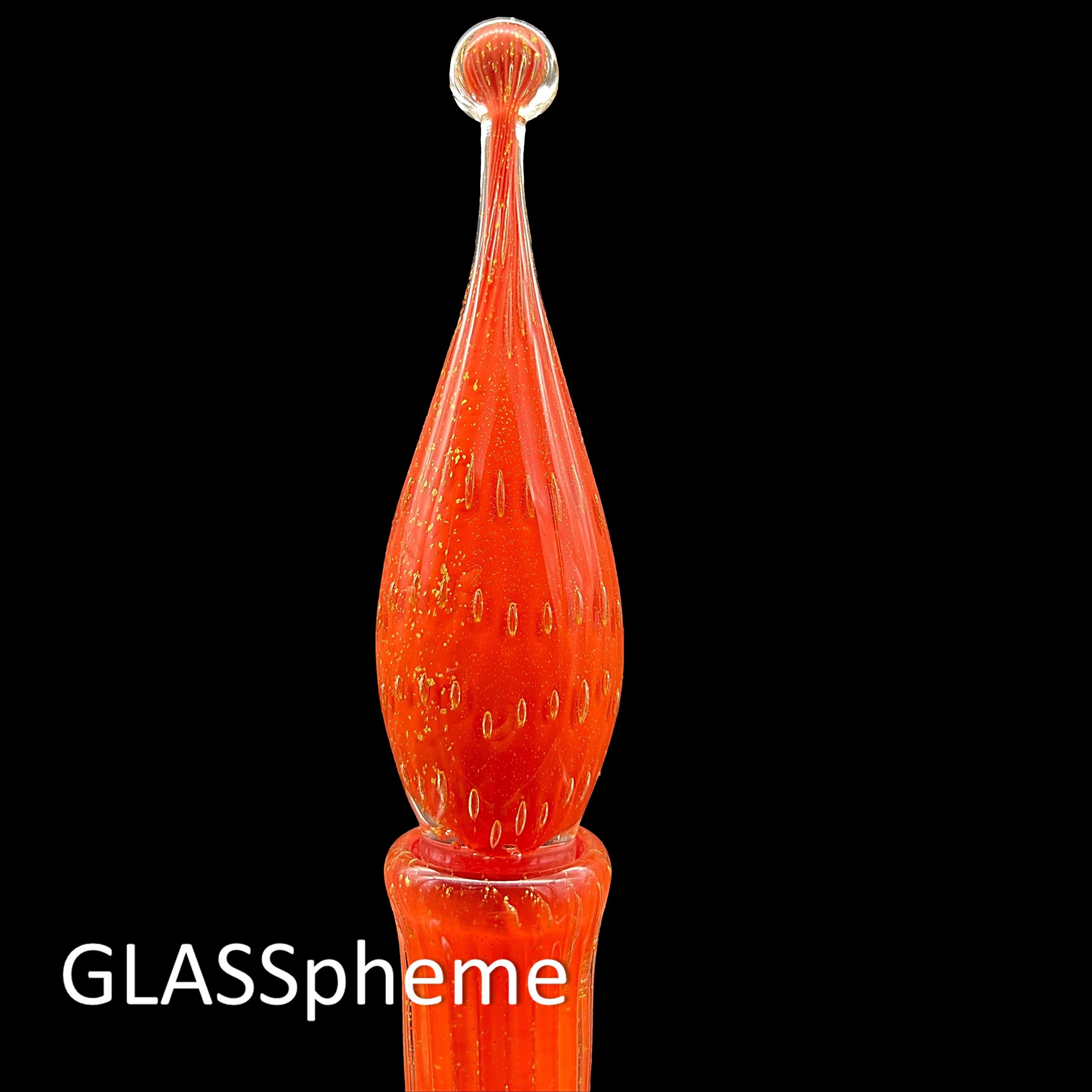 This glorious mid-century modern Murano masterpiece by Alfredo Barbini is a rare piece of heaven. Done in a brilliant cased persimmon/orange bullicante glass and strewn with gold, this exquisite and important collector's item will take your breath away. No labels left but this spectacular piece is featured in the Weil Glass & Ceramics Barbini catalog as shown in the last photo. A perfect gift for your favorite person, especially if that's yourself!
