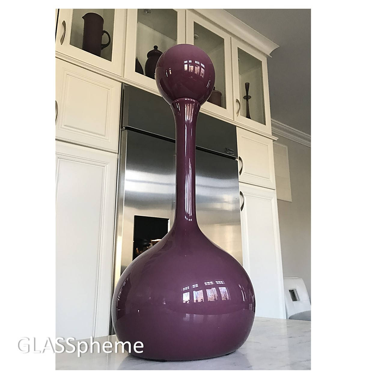 This mammoth ATOMIC AGE cased glass masterpiece comes along almost never, the ultimate 'GET' for mid-century modern glass collectors and designers alike, particularly in this creamy dreamy AMETHYST | PURPLE (it is indeed BOTH, depending on the lighting). This is the thick, heavy 1950s-60s Empoli cased glass, and not one of the thinner more lightweight confections of the 1970s. The bulbous base of this beauty is roughly 10" in diameter, its mirror image ball stopper is almost exactly half the size. Certainly, there's the occasional scratch or scuff (or two) or other evidence of wear somewhere on this 50+ year old piece. Even though I've yet to find any.