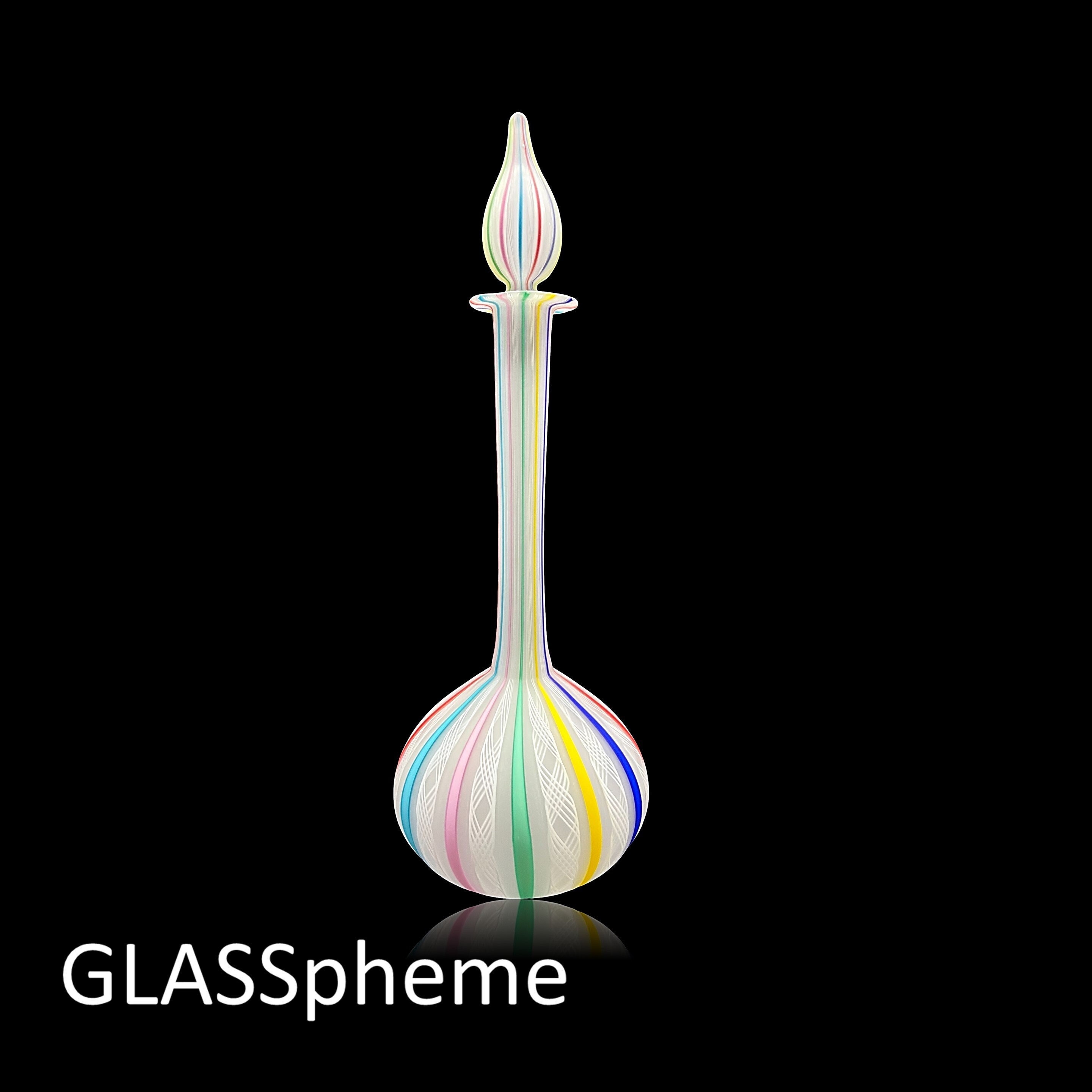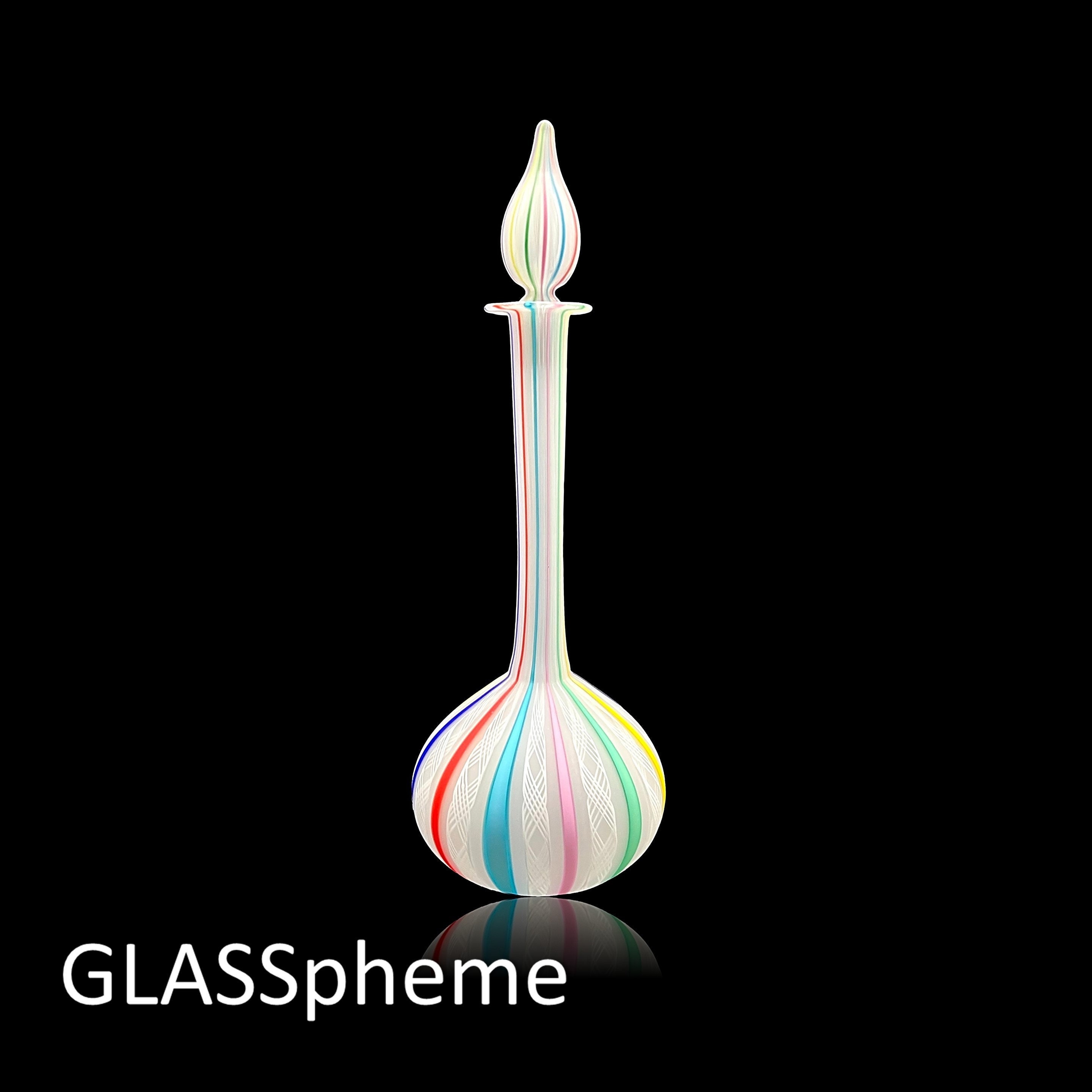 You're looking at an exquisite Circa 1950s satinato glass decanter, barber or perfume bottle by Fratelli Toso. Done in solid colored glass canes alternating with white zanfirico canes on a matte white/lattimo glass base, this 14" tall piece is a rarely seen beauty in pretty much PERFECT condition! Will be back to post references, but I'm positive of the Fratelli Toso attribution, and if you can prove me wrong, there's no statute of limitations on returns!