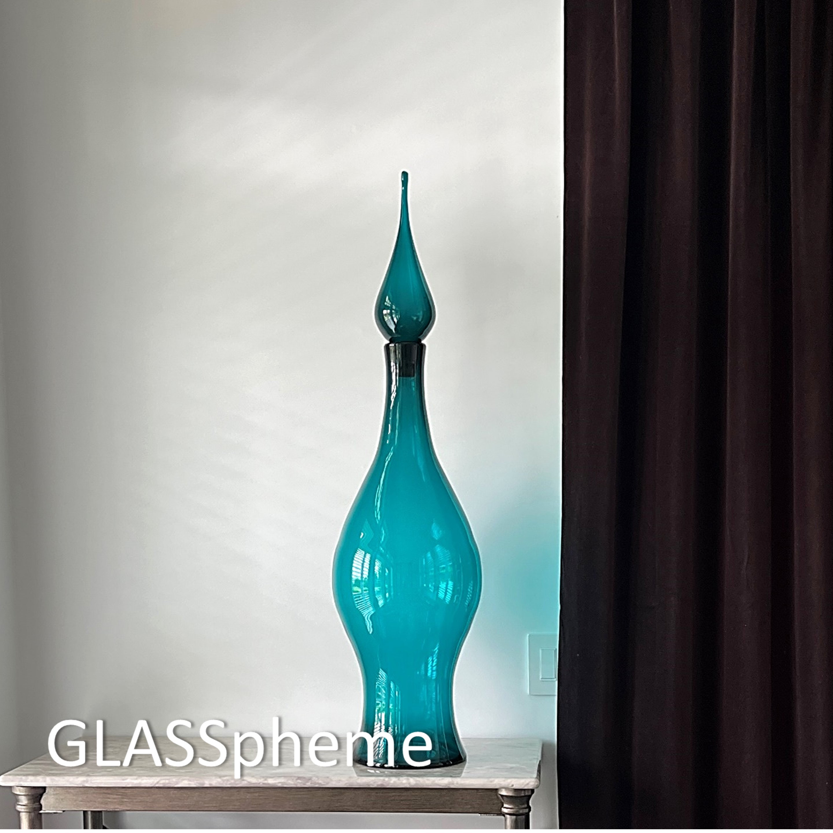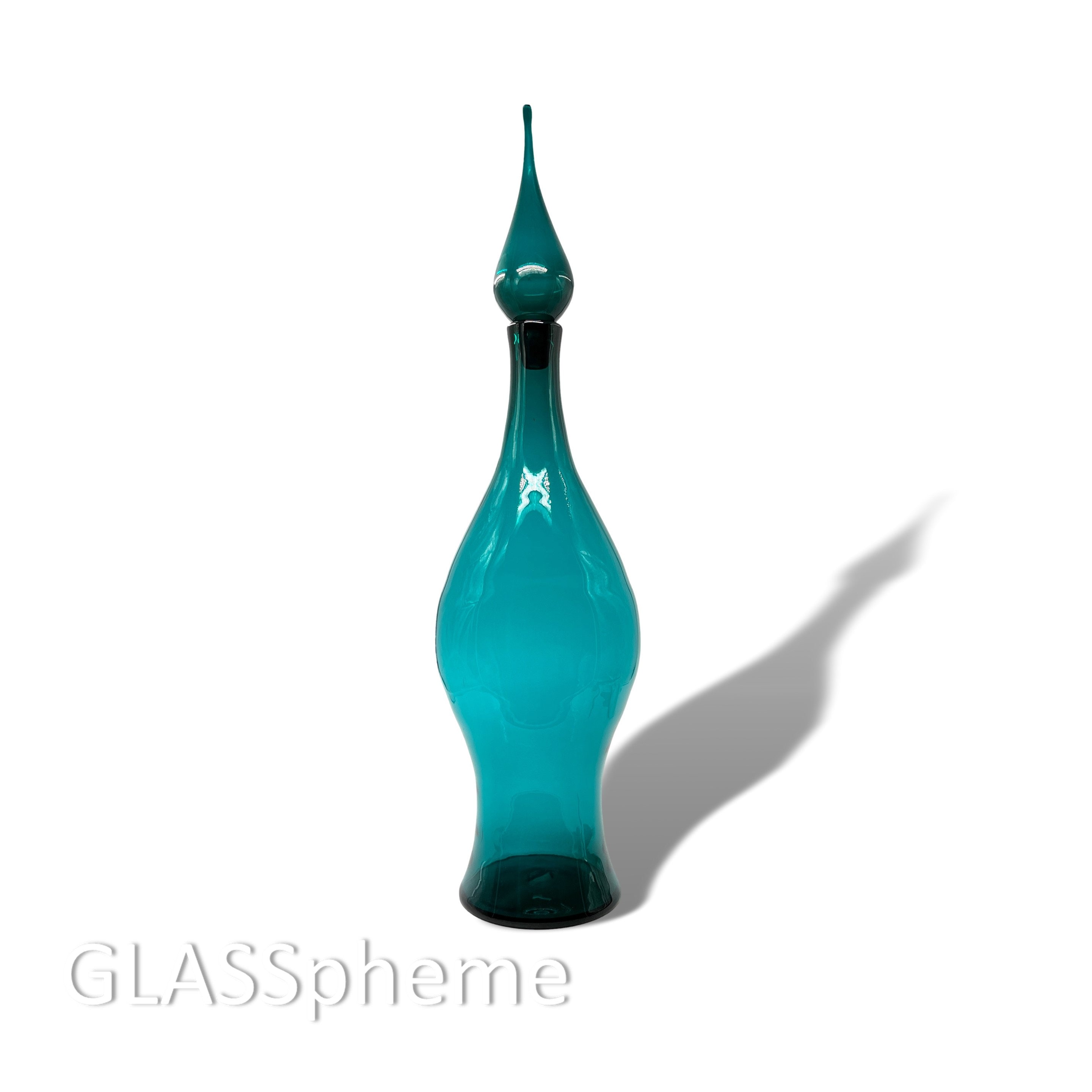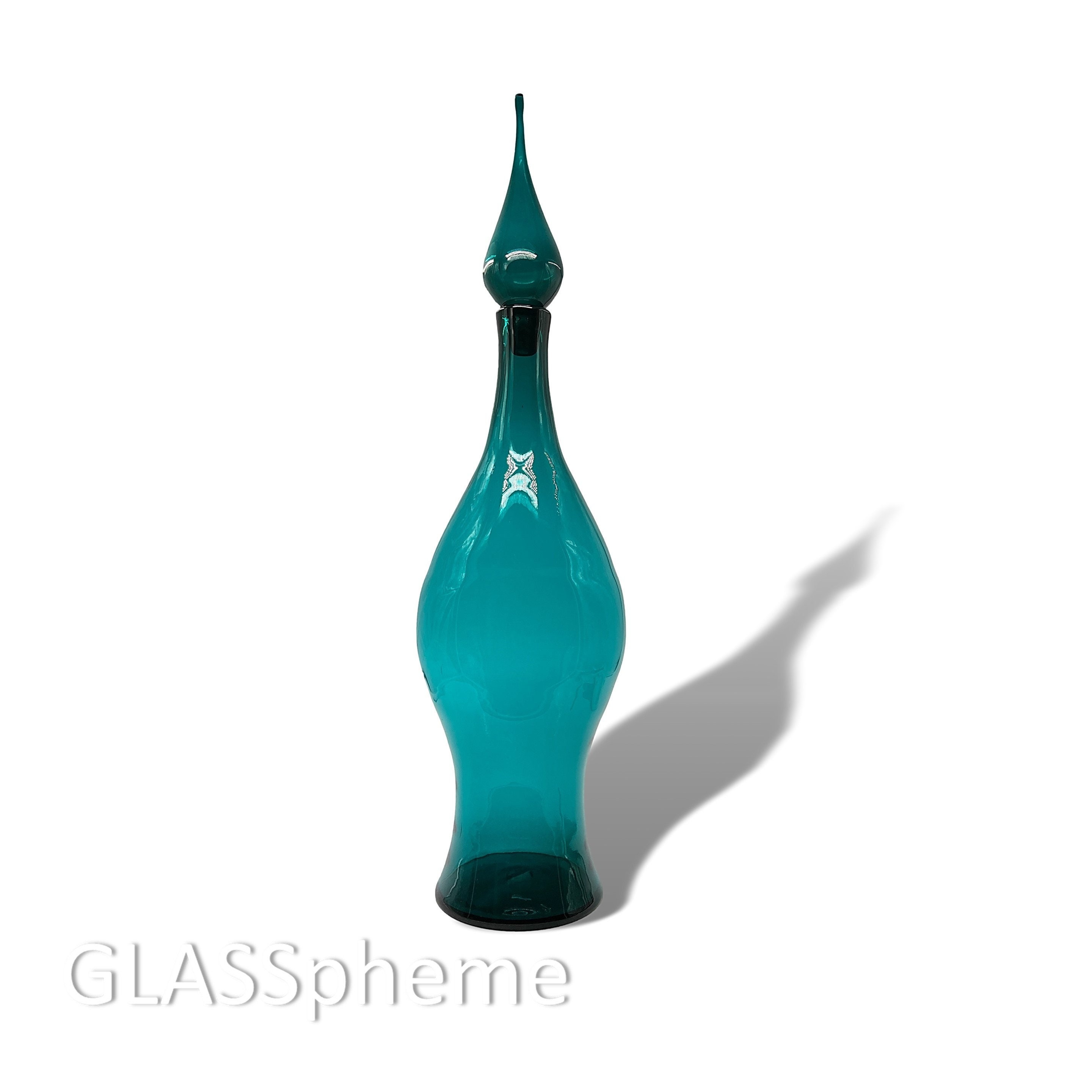 In 1965 and 1966 only, Blenko produced Joel Myers' rapturously curvaceous and unprecedentedly monumental #6535 architectural decanter in PEACOCK, (assuredly Blenko's most highly coveted color), and the world was never the same. Ok, an exaggeration perhaps, but not much of one for Blenko collectors. This breathtaking combination is so ridiculously spectacular and near-impossible to find that only two sold at auction in the last decade+ (according to Worthpoint). Moreover, this beauty is in ridiculously minty condition (see details below)! Once this is sold, your time is better spent hunting unicorns...
