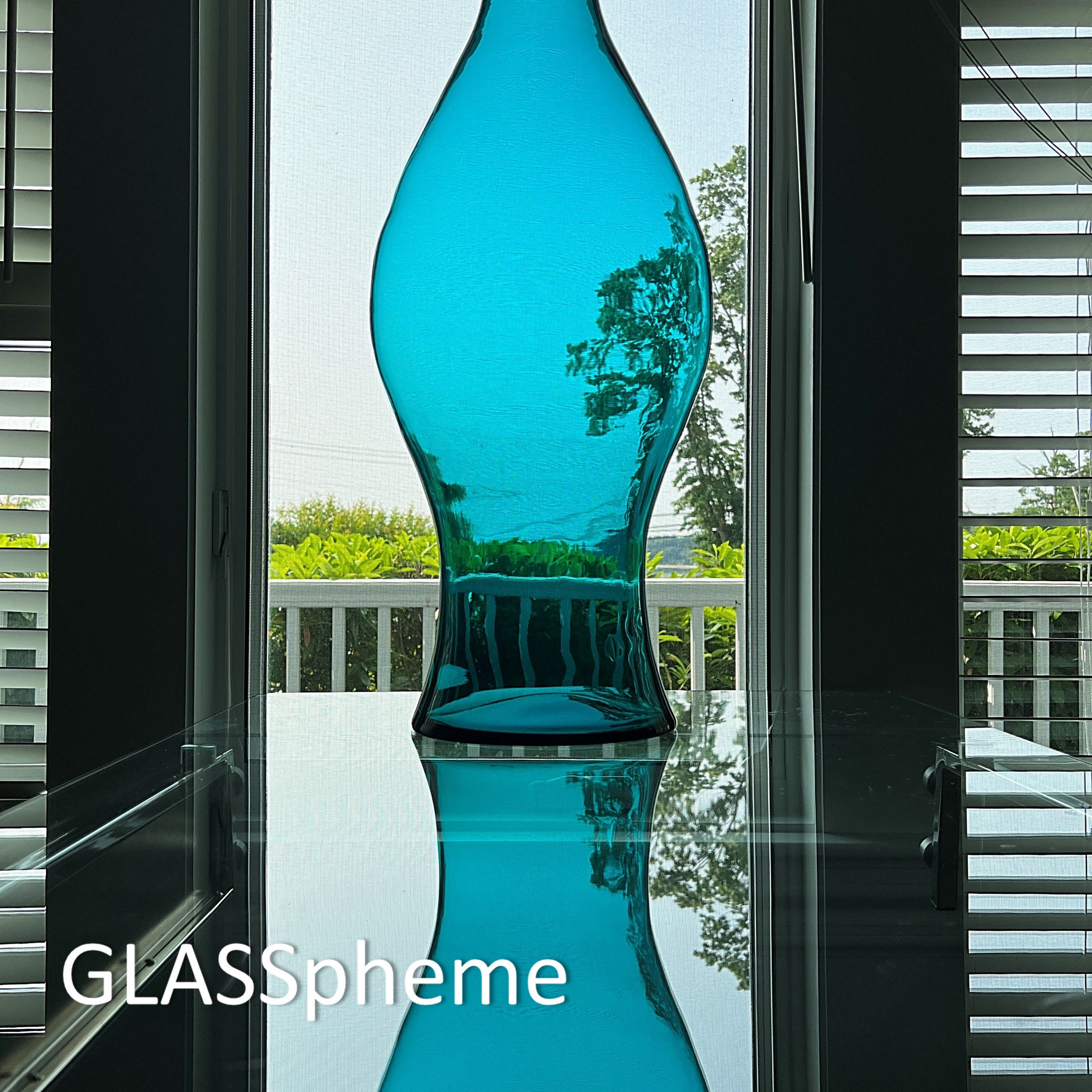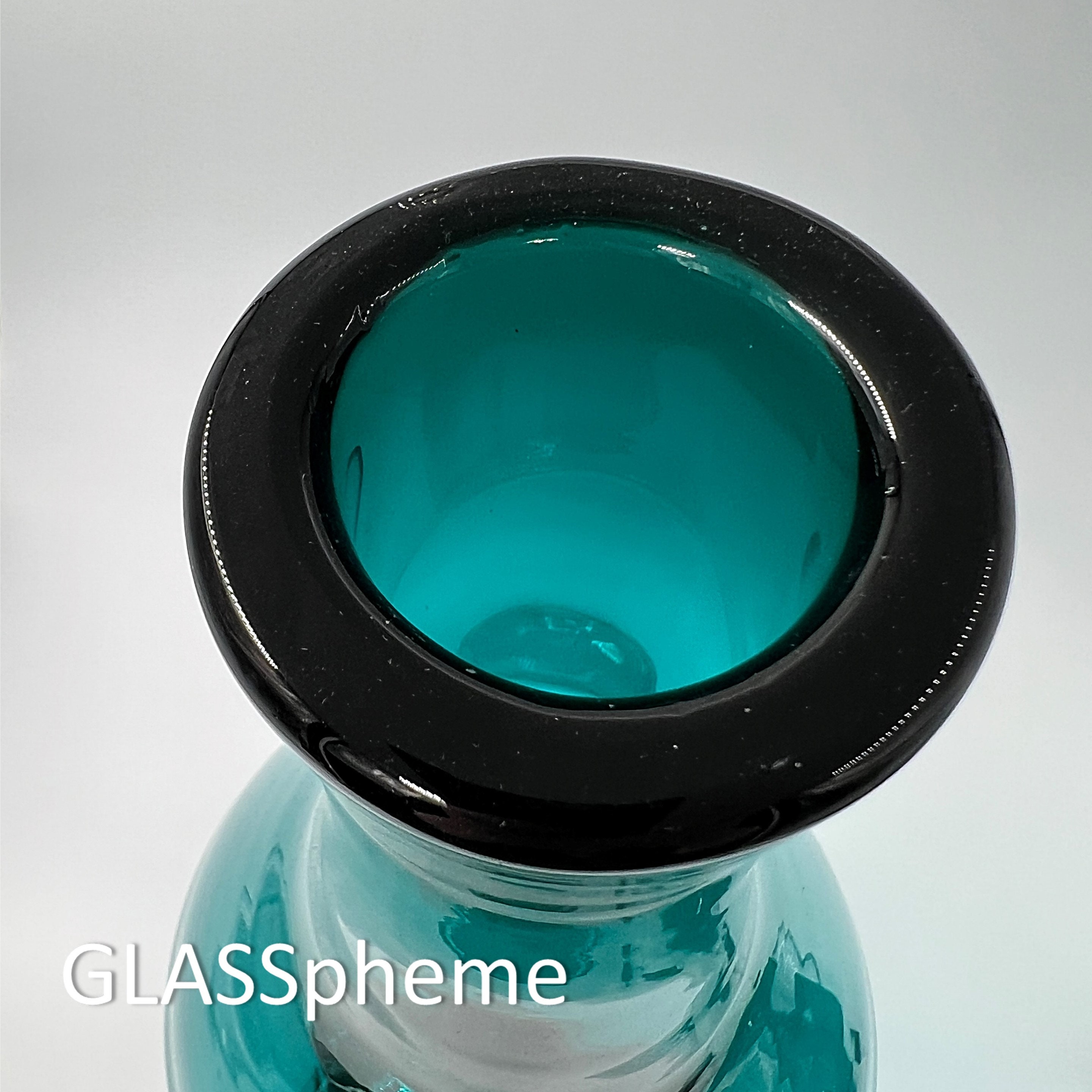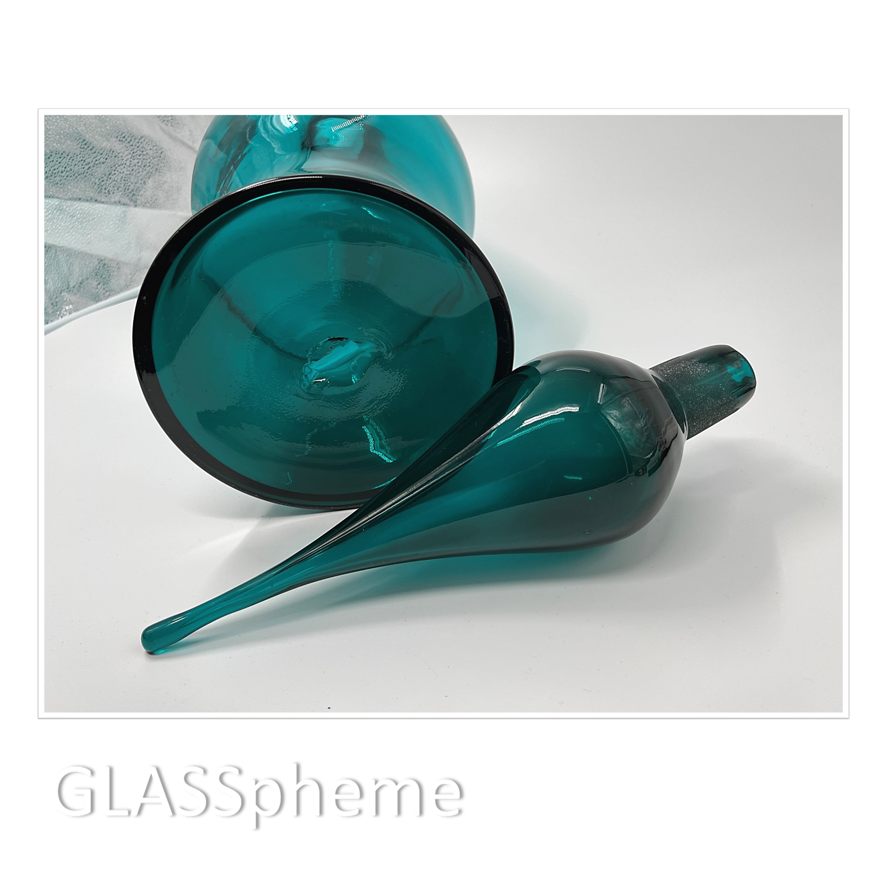 In 1965 and 1966 only, Blenko produced Joel Myers' rapturously curvaceous and unprecedentedly monumental #6535 architectural decanter in PEACOCK, (assuredly Blenko's most highly coveted color), and the world was never the same. Ok, an exaggeration perhaps, but not much of one for Blenko collectors. This breathtaking combination is so ridiculously spectacular and near-impossible to find that only two sold at auction in the last decade+ (according to Worthpoint). Moreover, this beauty is in ridiculously minty condition (see details below)! Once this is sold, your time is better spent hunting unicorns...