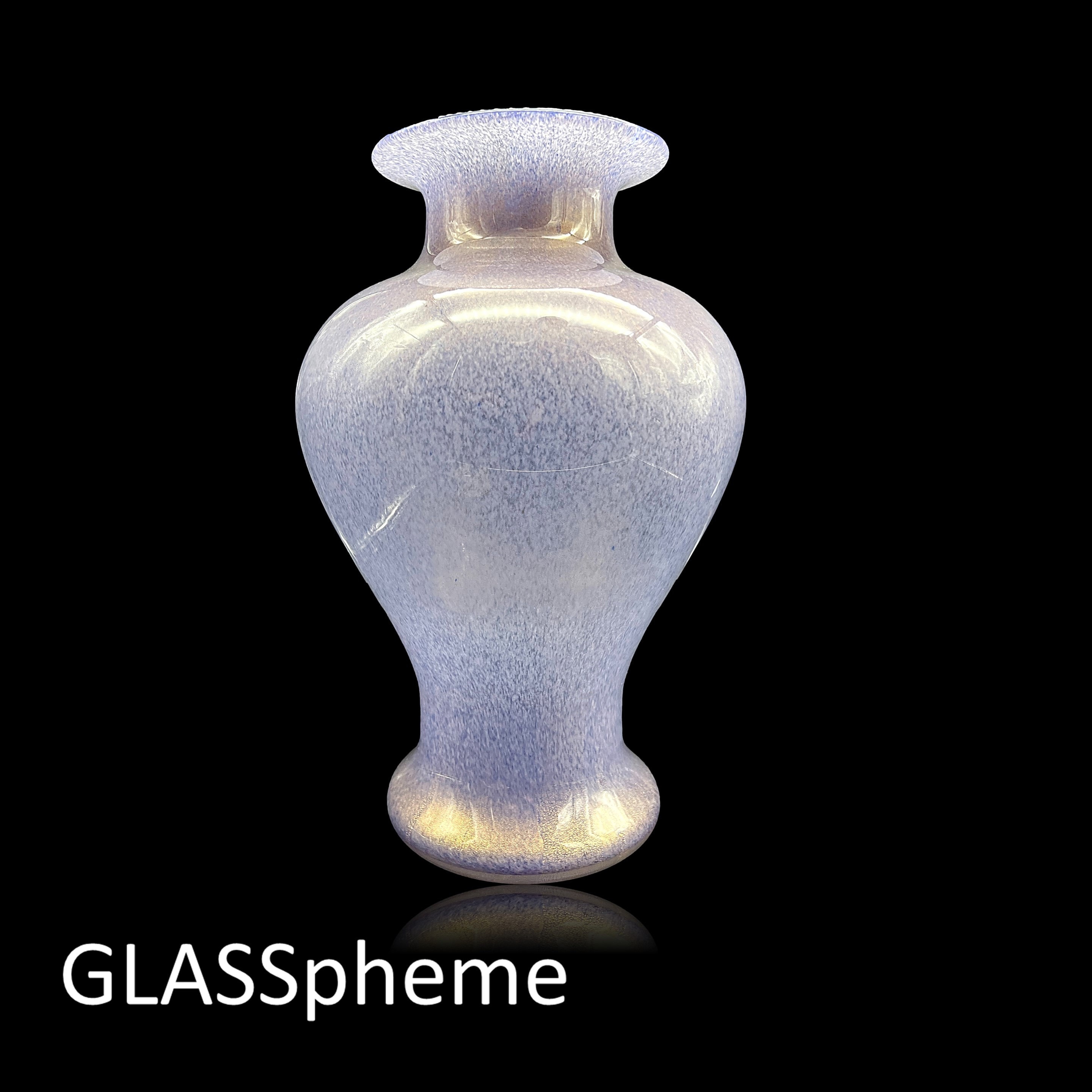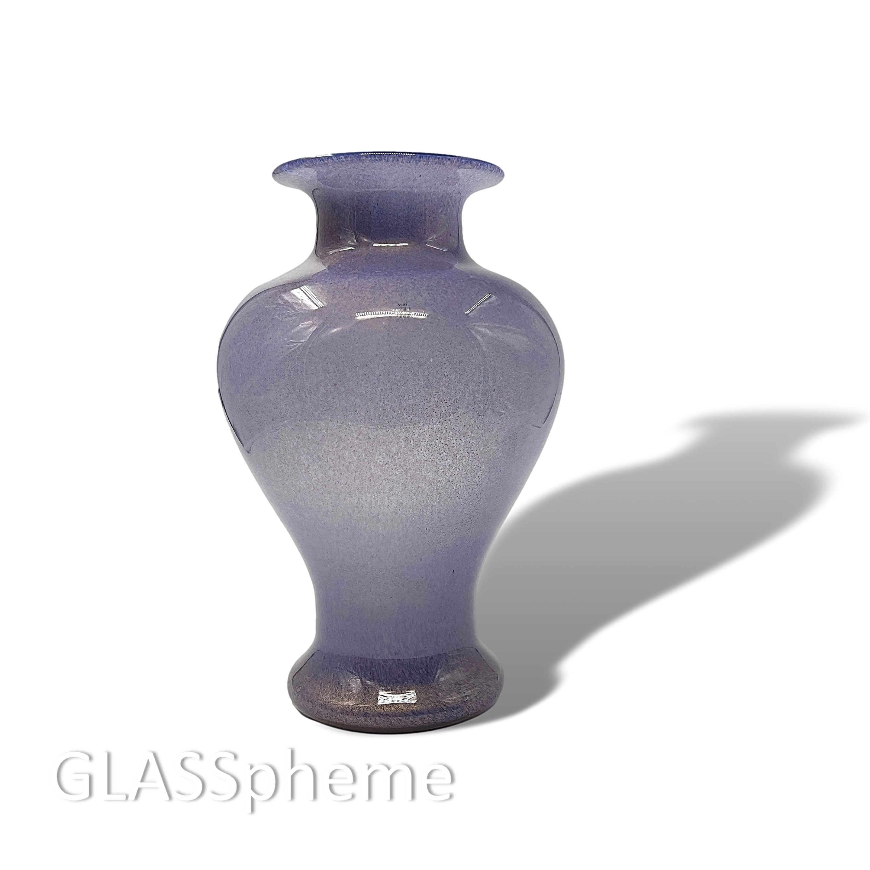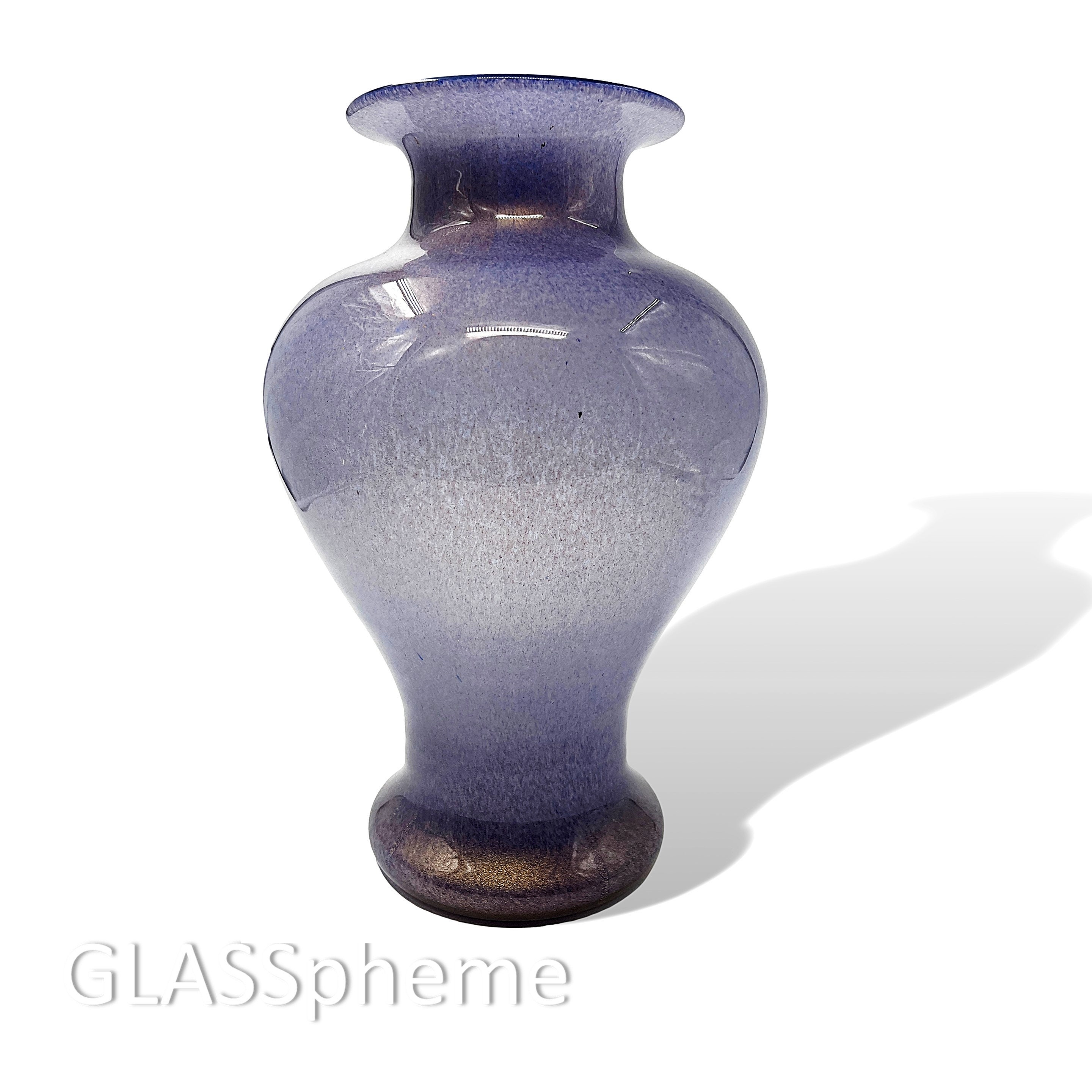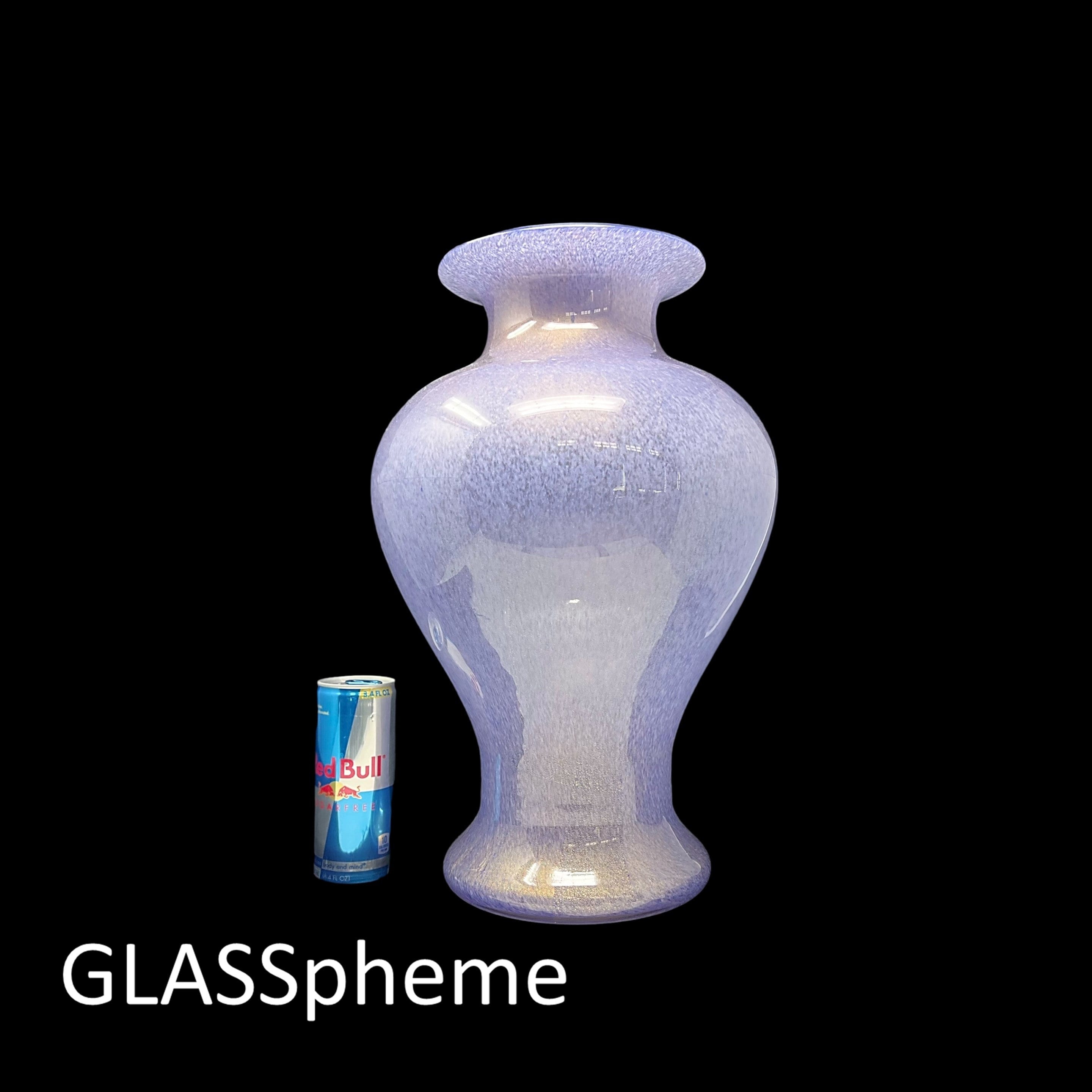 You're looking at a HUGE Hollywood Regency style masterpiece--a SUBLIME BAROVIER & TOSO floor vase. In this latter 20th century design (1970s or 1980s I believe), Barovier & Toso puts classic 'ginger jar' on steroids with exaggerated and highly sensuous curves and an elegant sense of drama. While from a distance, our vase appears to be pale glowing purple or periwinkle, the glass is actually composed of gradations of blue, purple and white flecks overlaid with a layer of crystal and gold leaf (incamiciato). The result is a striking piece of art sporting an ethereal sort of glow depending on the light. The roughly 6" neck opening beckons for the most opulent flower arrangement or even use as an umbrella or cane stand.