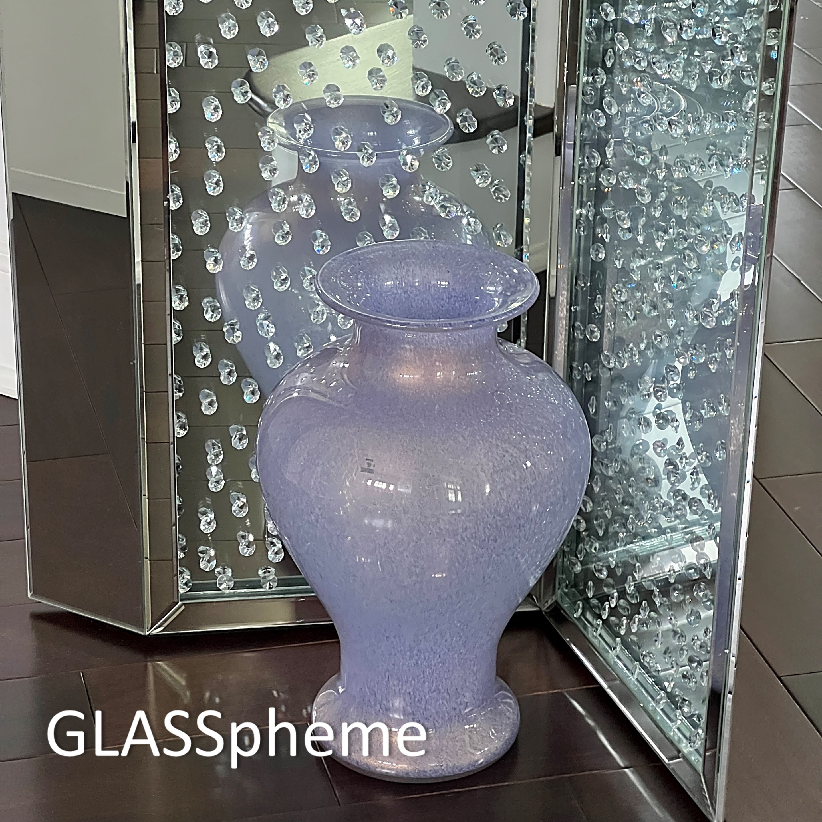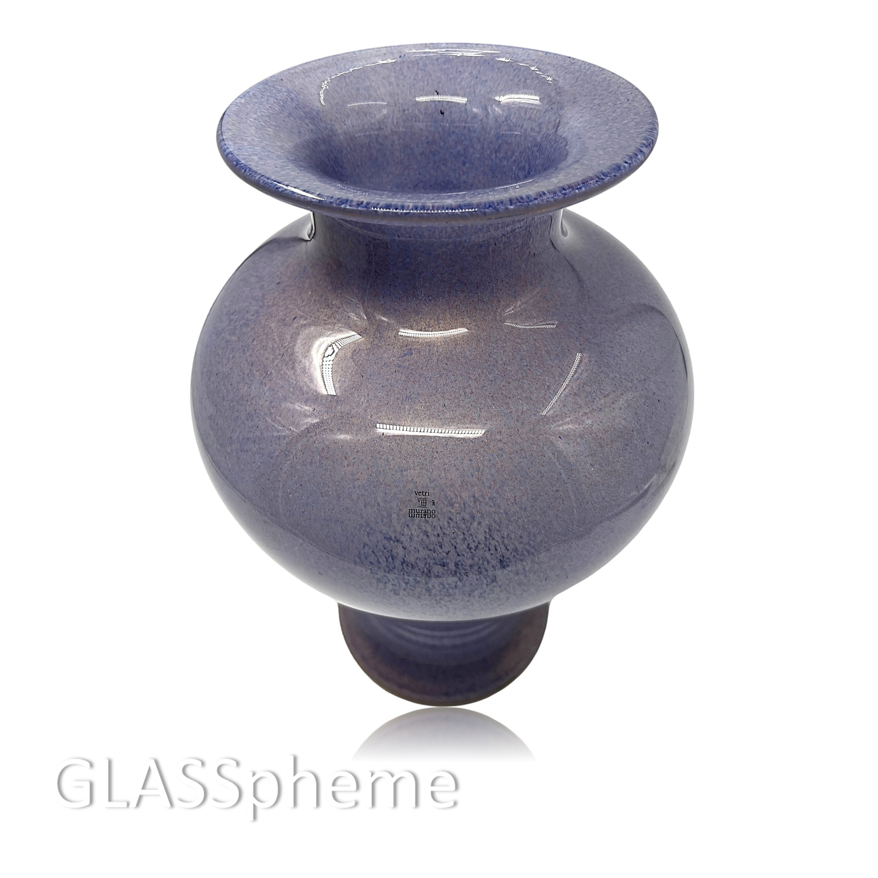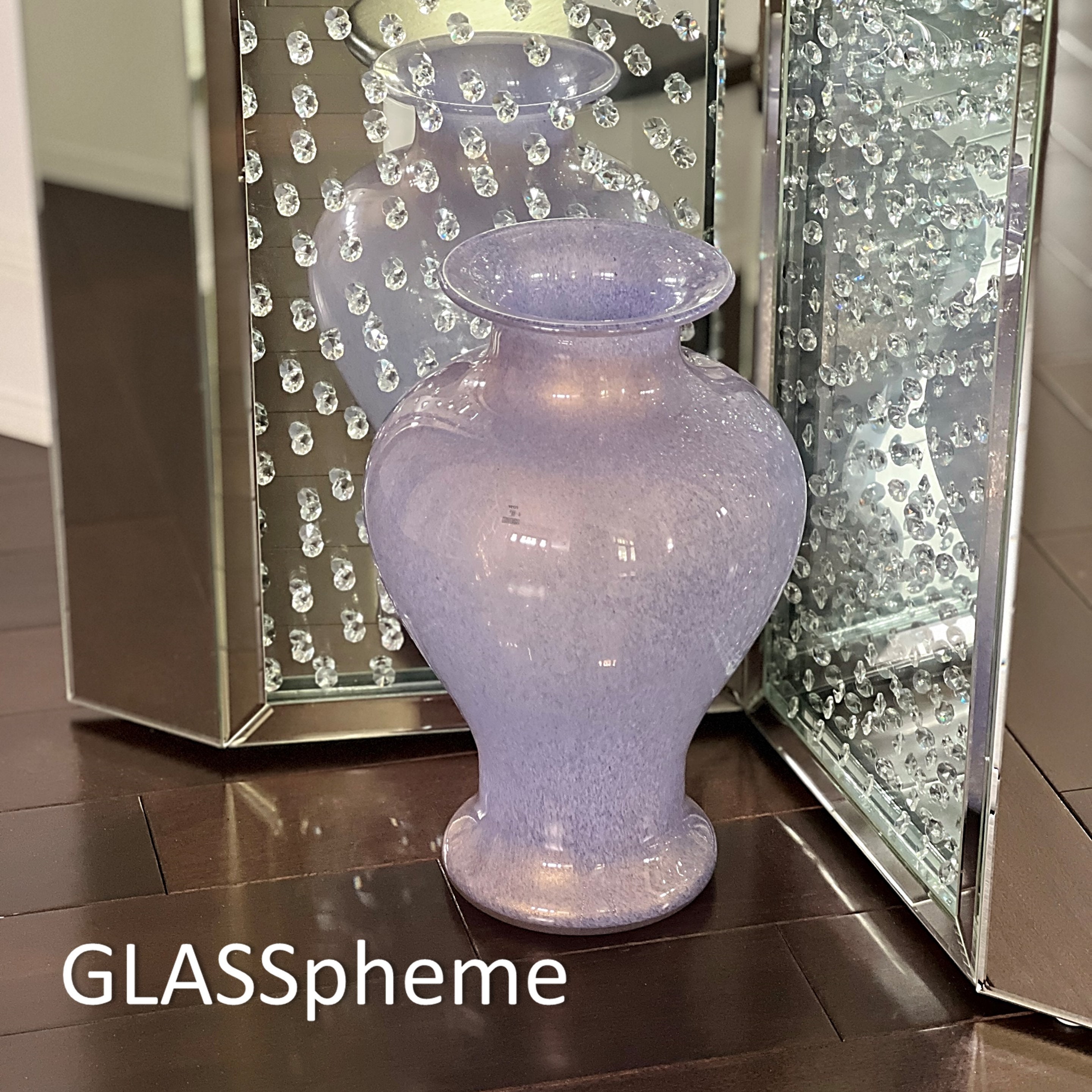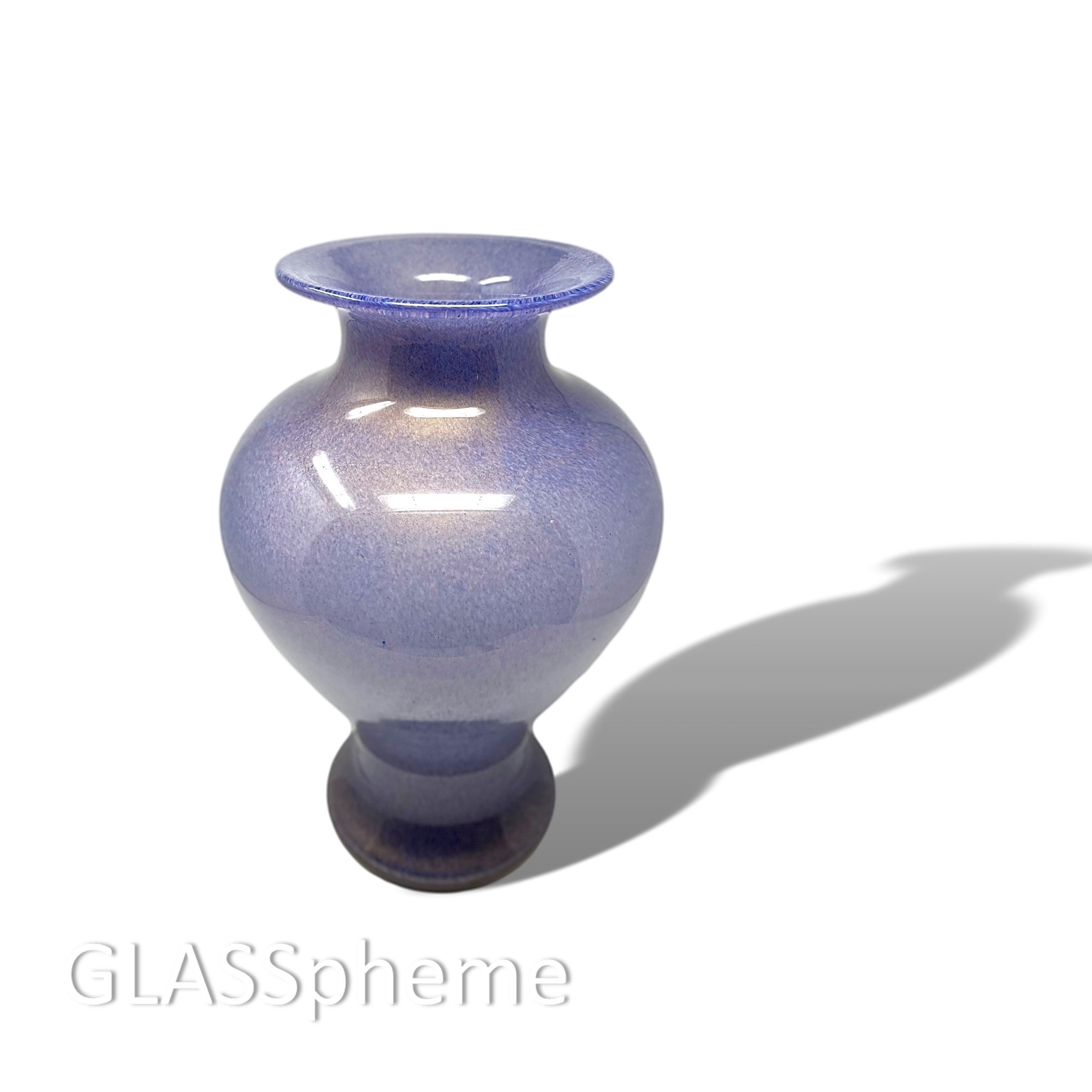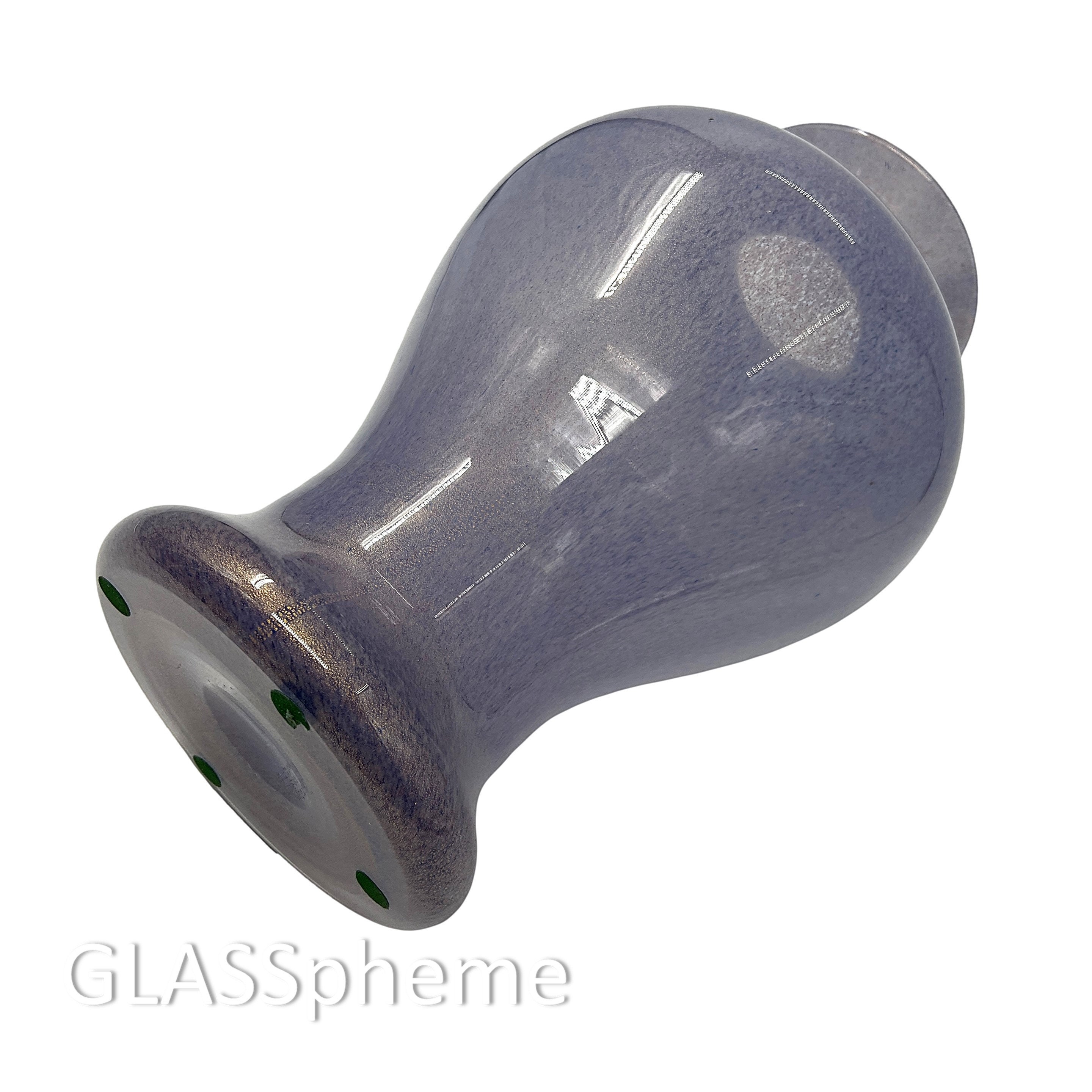 You're looking at a HUGE Hollywood Regency style masterpiece--a SUBLIME BAROVIER & TOSO floor vase. In this latter 20th century design (1970s or 1980s I believe), Barovier & Toso puts classic 'ginger jar' on steroids with exaggerated and highly sensuous curves and an elegant sense of drama. While from a distance, our vase appears to be pale glowing purple or periwinkle, the glass is actually composed of gradations of blue, purple and white flecks overlaid with a layer of crystal and gold leaf (incamiciato). The result is a striking piece of art sporting an ethereal sort of glow depending on the light. The roughly 6" neck opening beckons for the most opulent flower arrangement or even use as an umbrella or cane stand.