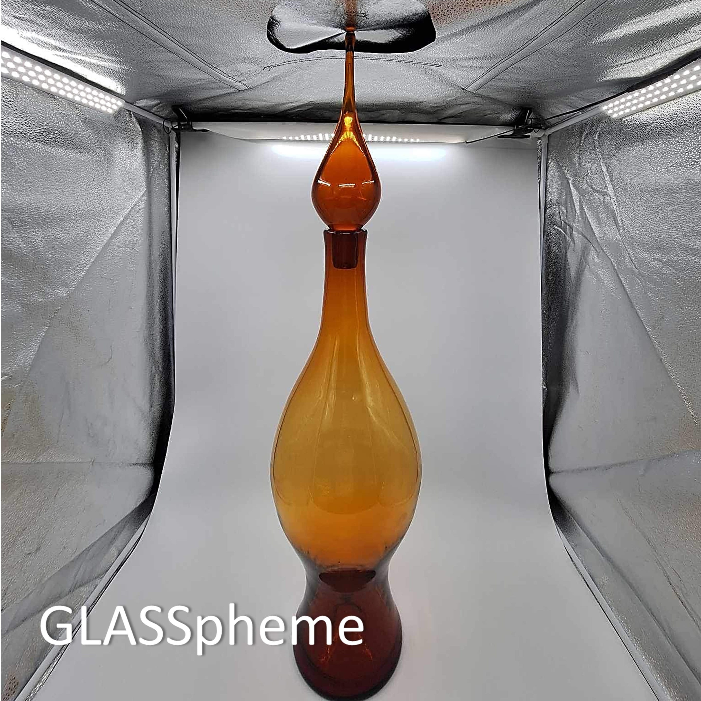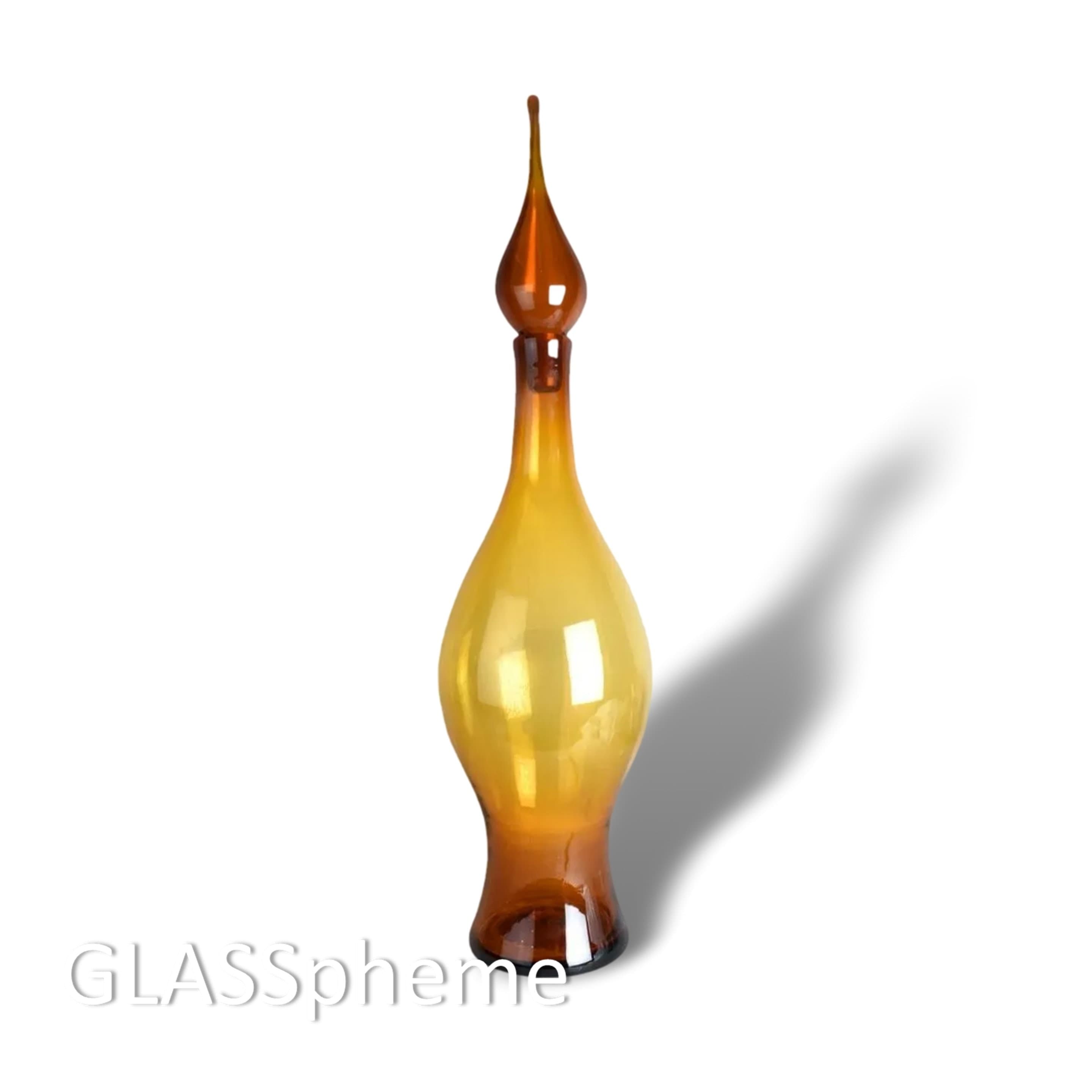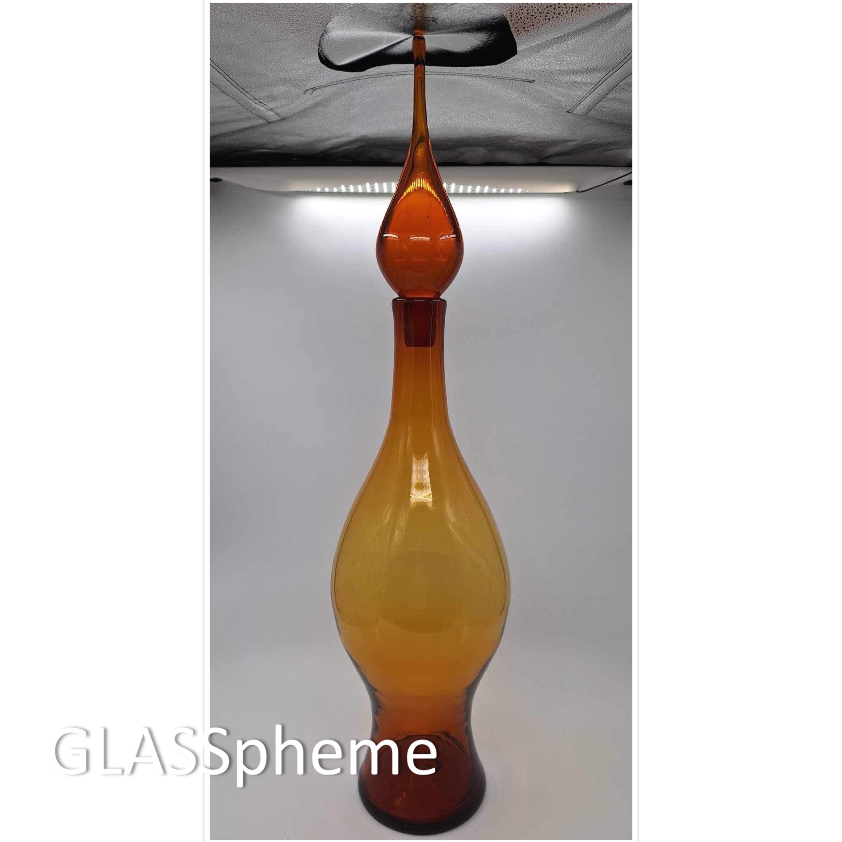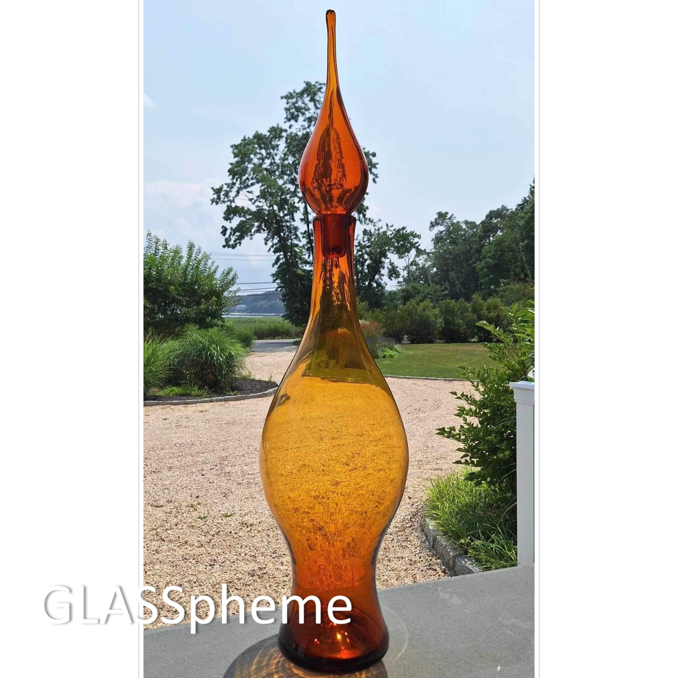 Check out Blenko's rapturously curvaceous and unprecedentedly monumental #6535 architectural decanter by Joel Myers in deep warm HONEY! Coming in at nearly 44" tall (okay, 43.5"), this is the tallest of Blenko's architectural decanters and a serious stunner! There's of course some base wear, but interior of the decanter is sparkling clean and undamaged by moisture, mineral deposits, etc. The stopper is perfect. Given the sheer size of this piece, the existence of a few bubbles is inevitable, but the overall production quality of this piece is as good as Blenko gets.