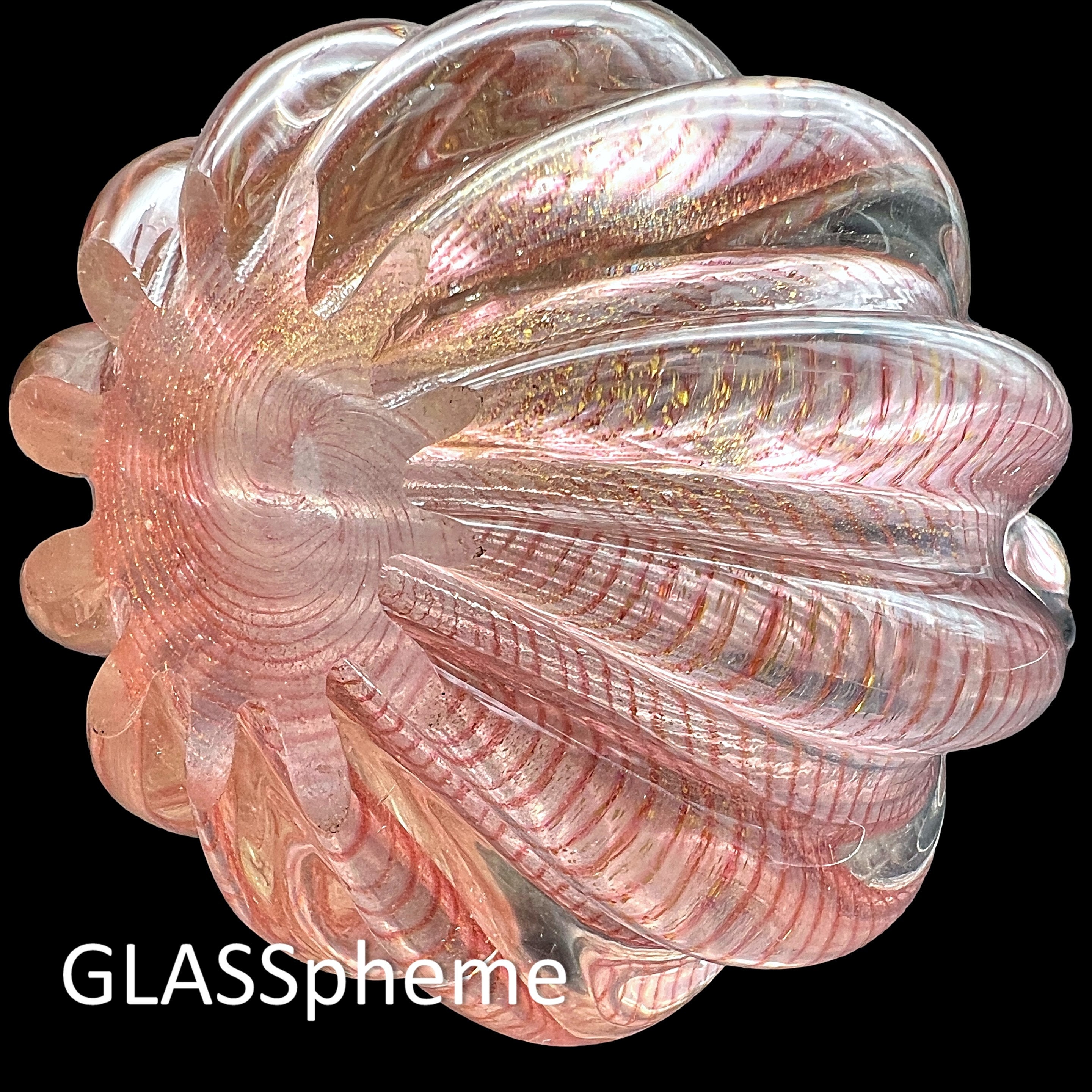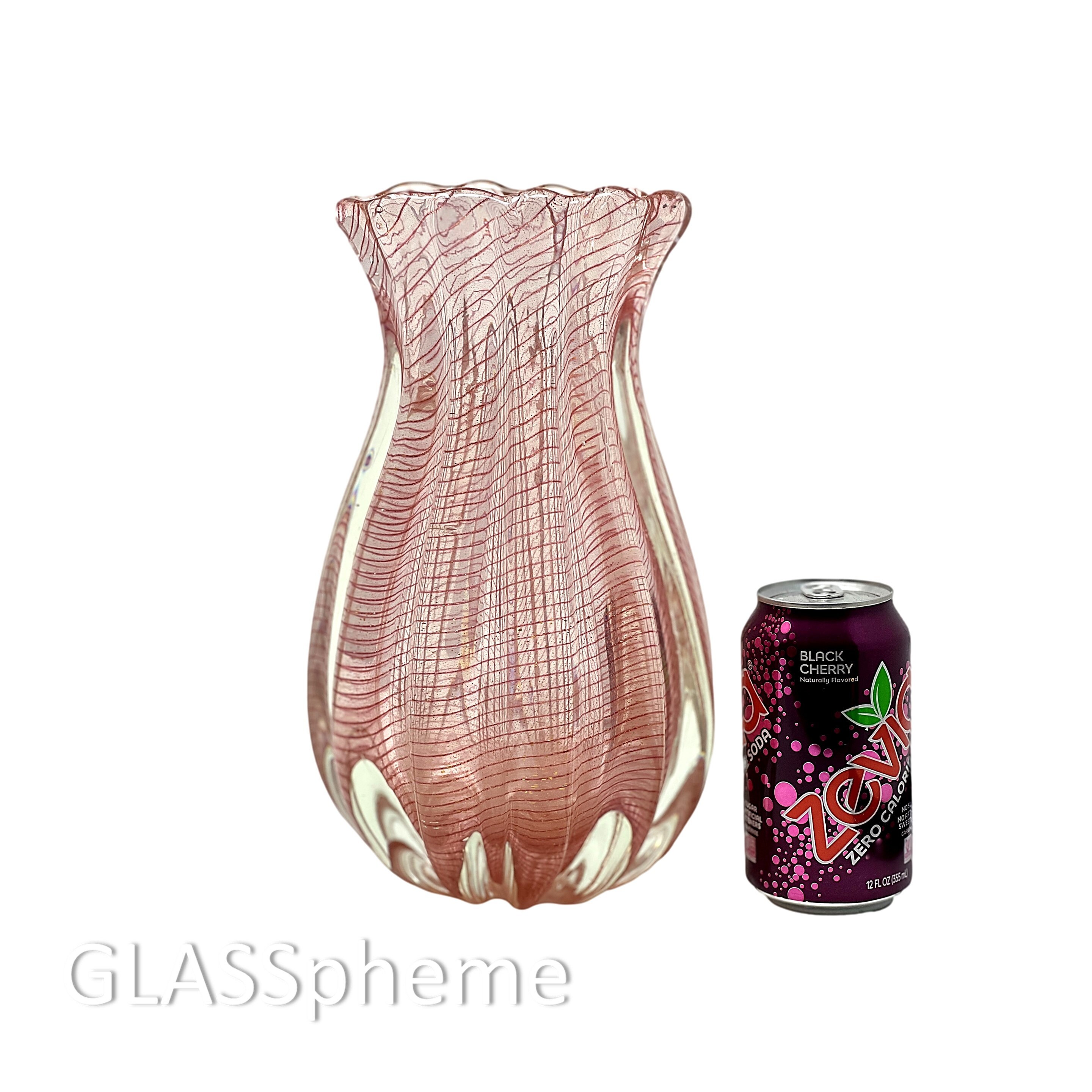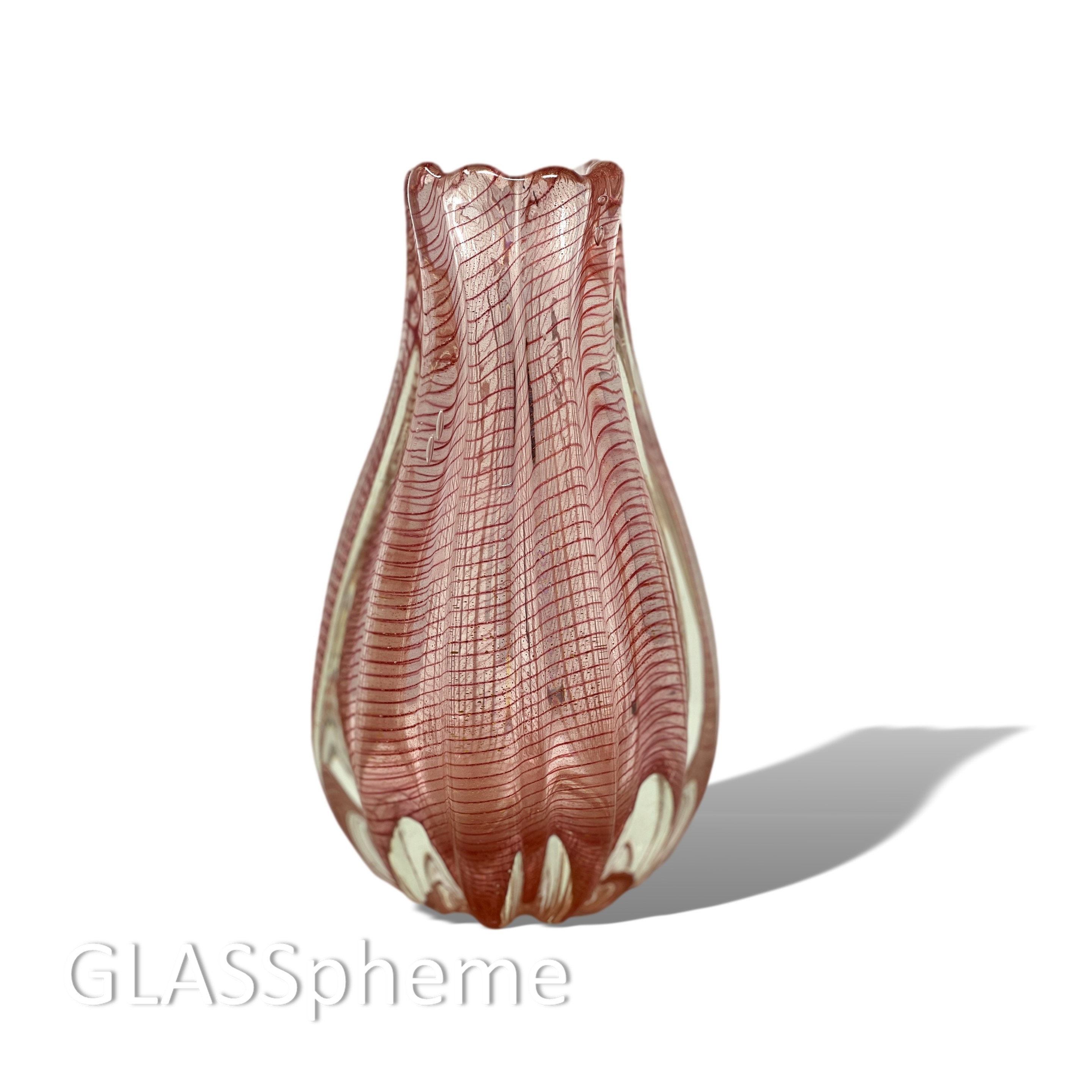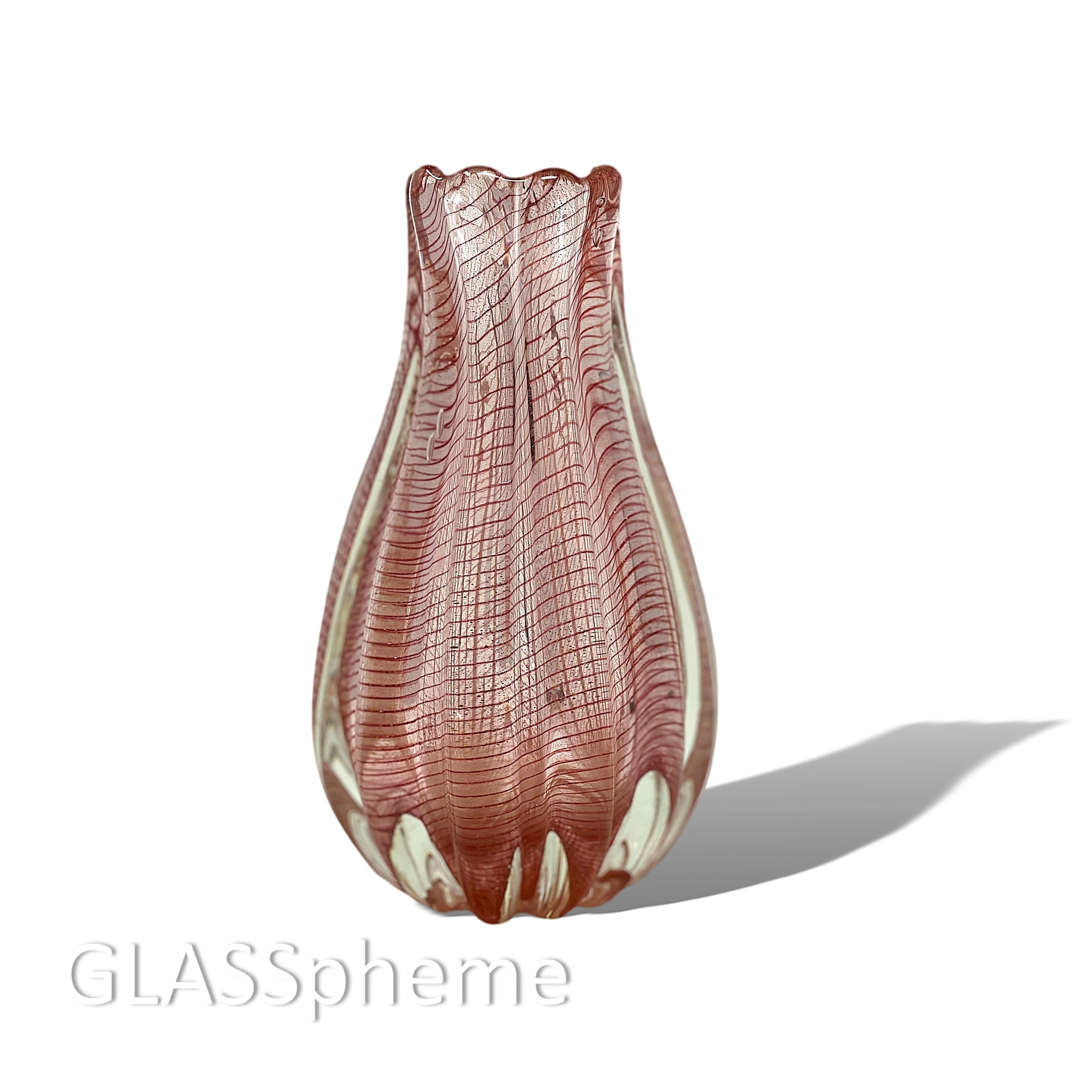 Our Barovier & Toso "Zebrato" vase, designed by Ercole Barovier (1889-1974), is a large heavily cased ribbed beauty decorated with pink spiral threads and adorned with sparkling gold aventurine. The unique form, circular on the base and ovoid at the top, adds to the piece's complexity and splendor. Unsigned but documented exhaustively, our Zebrato specimen has a few (small bubbles and tiny flecks of ash) but is in otherwise excellent condition.