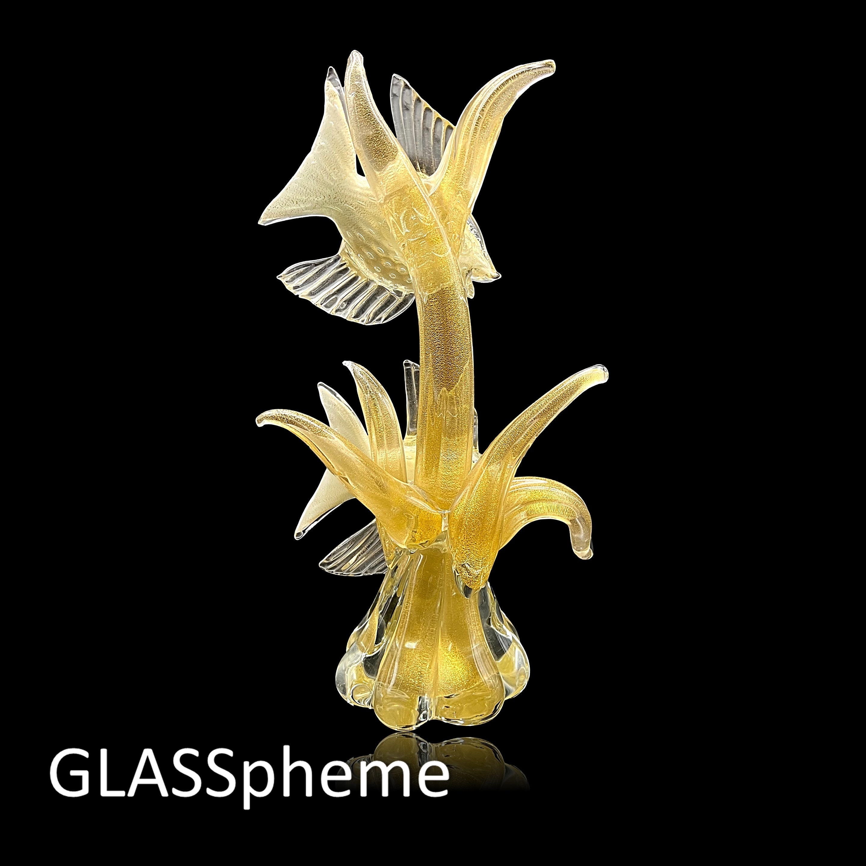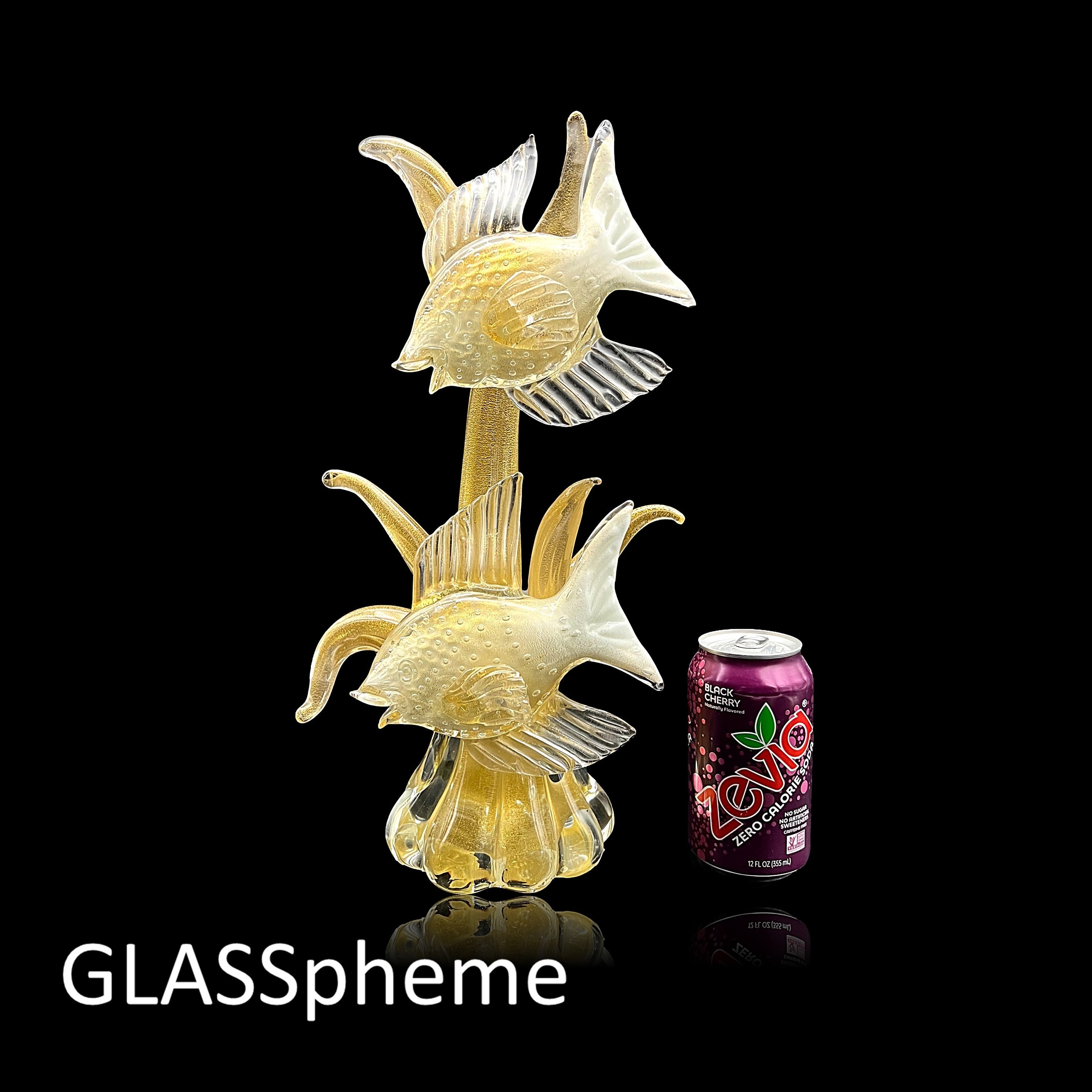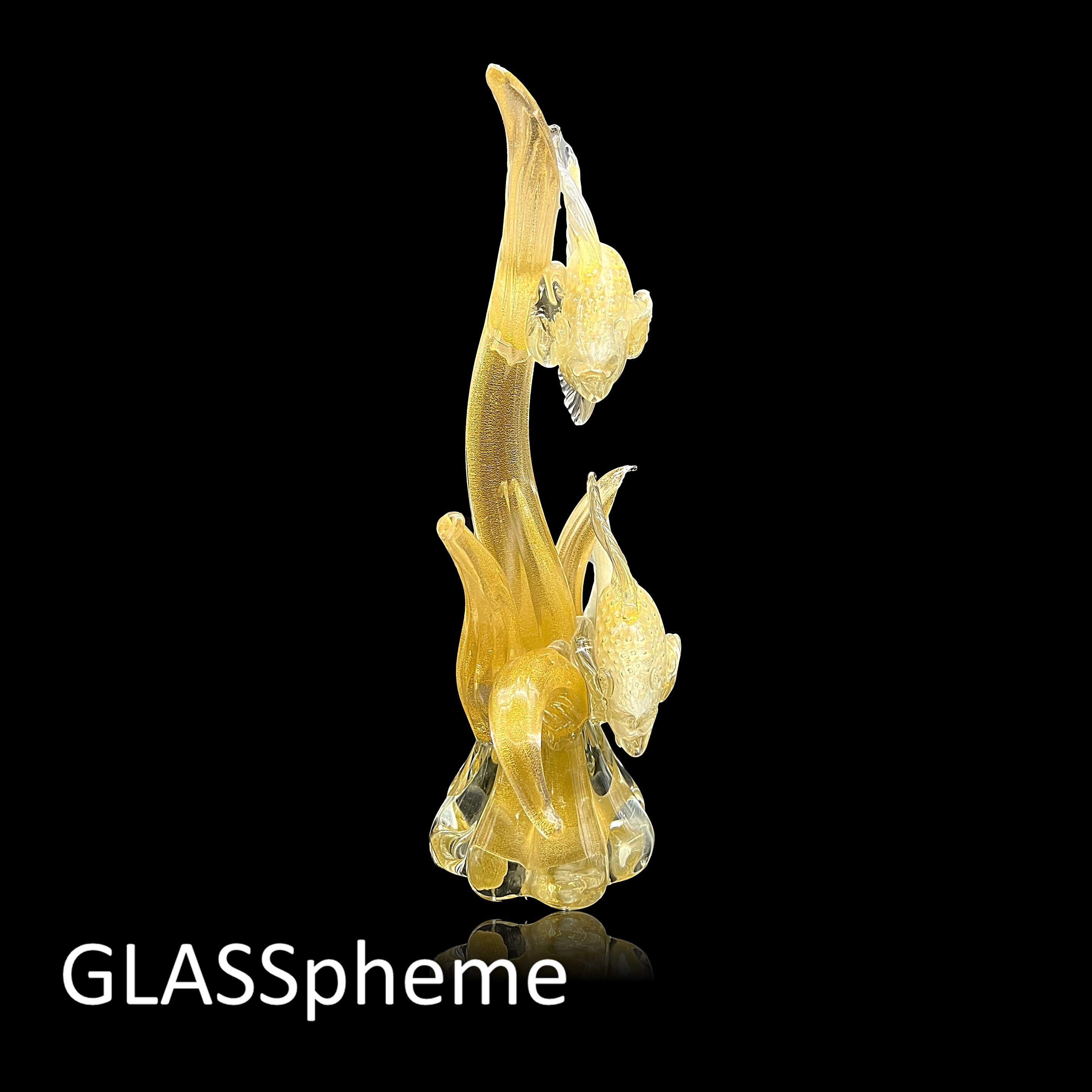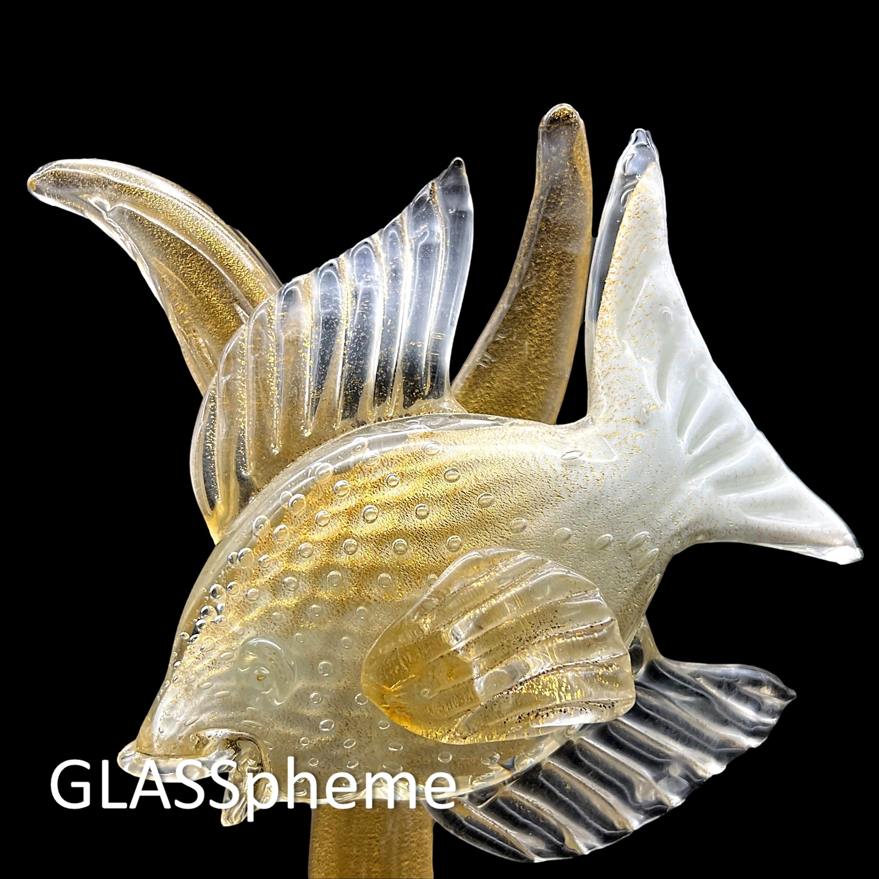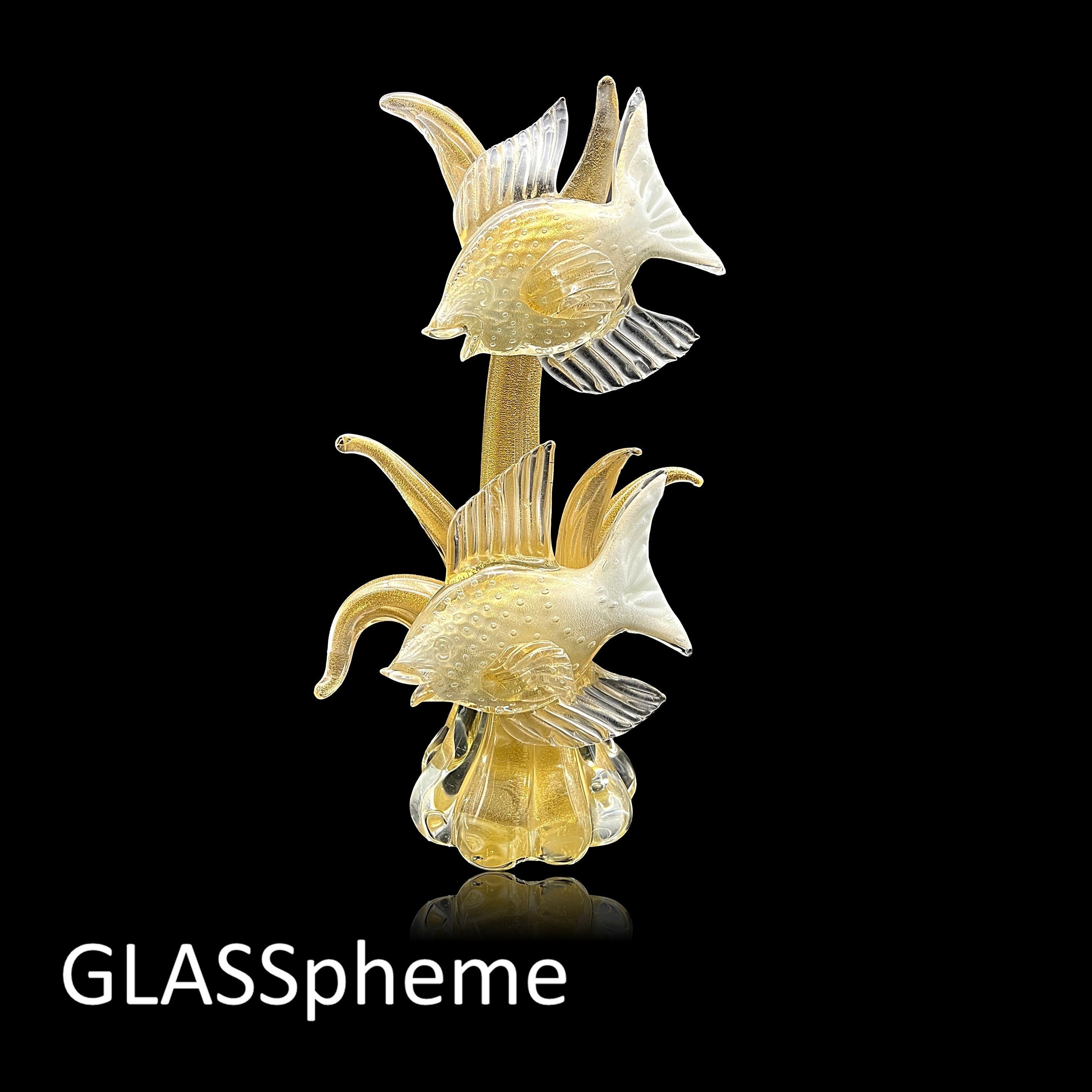 Standing just short of 16" tall and 9" deep, this large, opulent, intricate gold-laden C.1950s glass fish sculpture is an exquisite example of the sheer luxury of high-end mid-century MURANO glass. Two fish (done in lattimo/milk glass adorned with gold flecking and encased in bullicante crystal) swim amongst superbly-imagined gold and crystal glass reeds that appear to be flowing gently in the current...