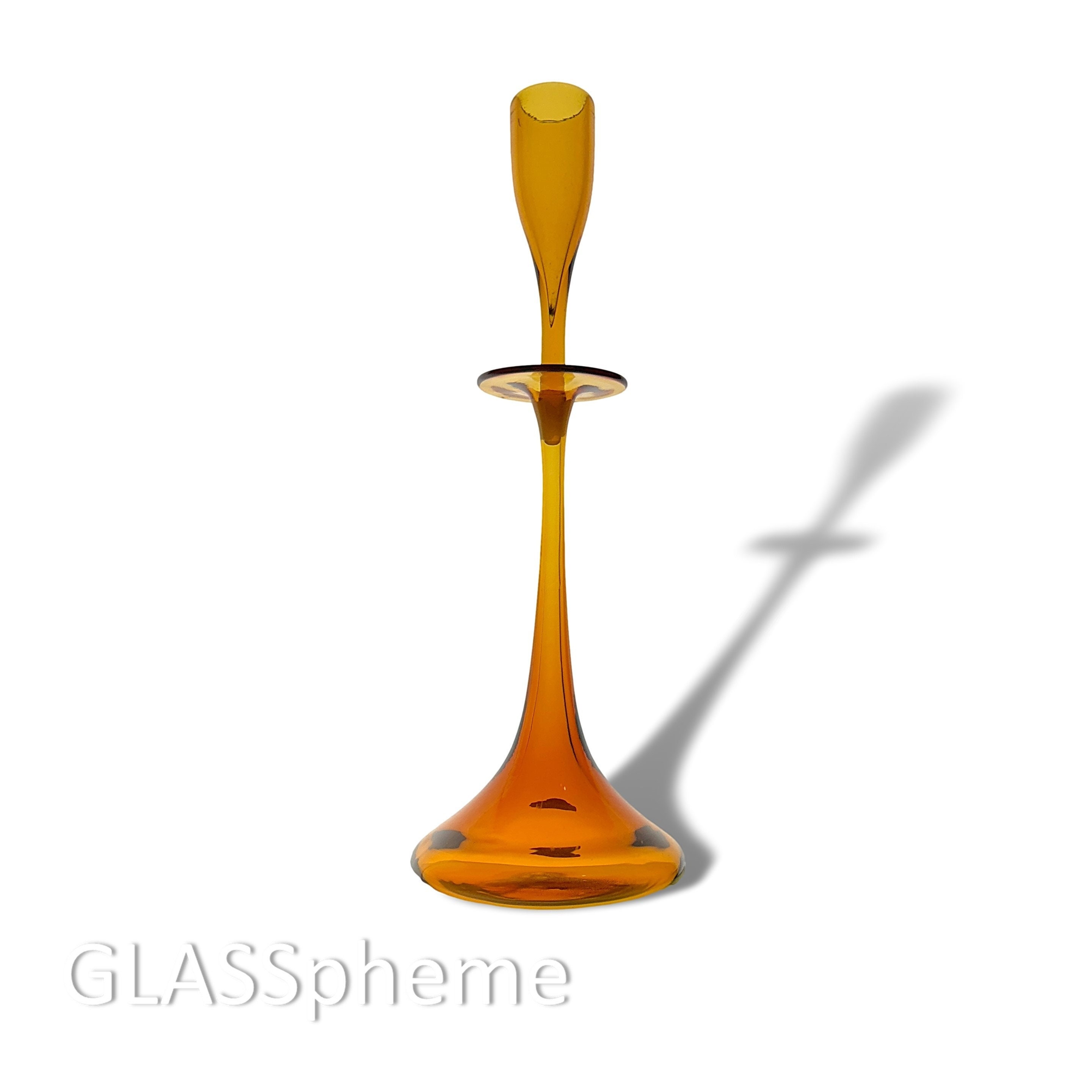 Blenko's iconic 1960 shot glass decanter by Wayne Husted is one of Blenko's most beloved designs. Given that they were made for most of the 1960s, even 60 years later, there are quite a few floating around. Except NOT LIKE THIS ONE! This beauty is in HONEY--a deep dark rich golden brown that Blenko only made in 1965-8.