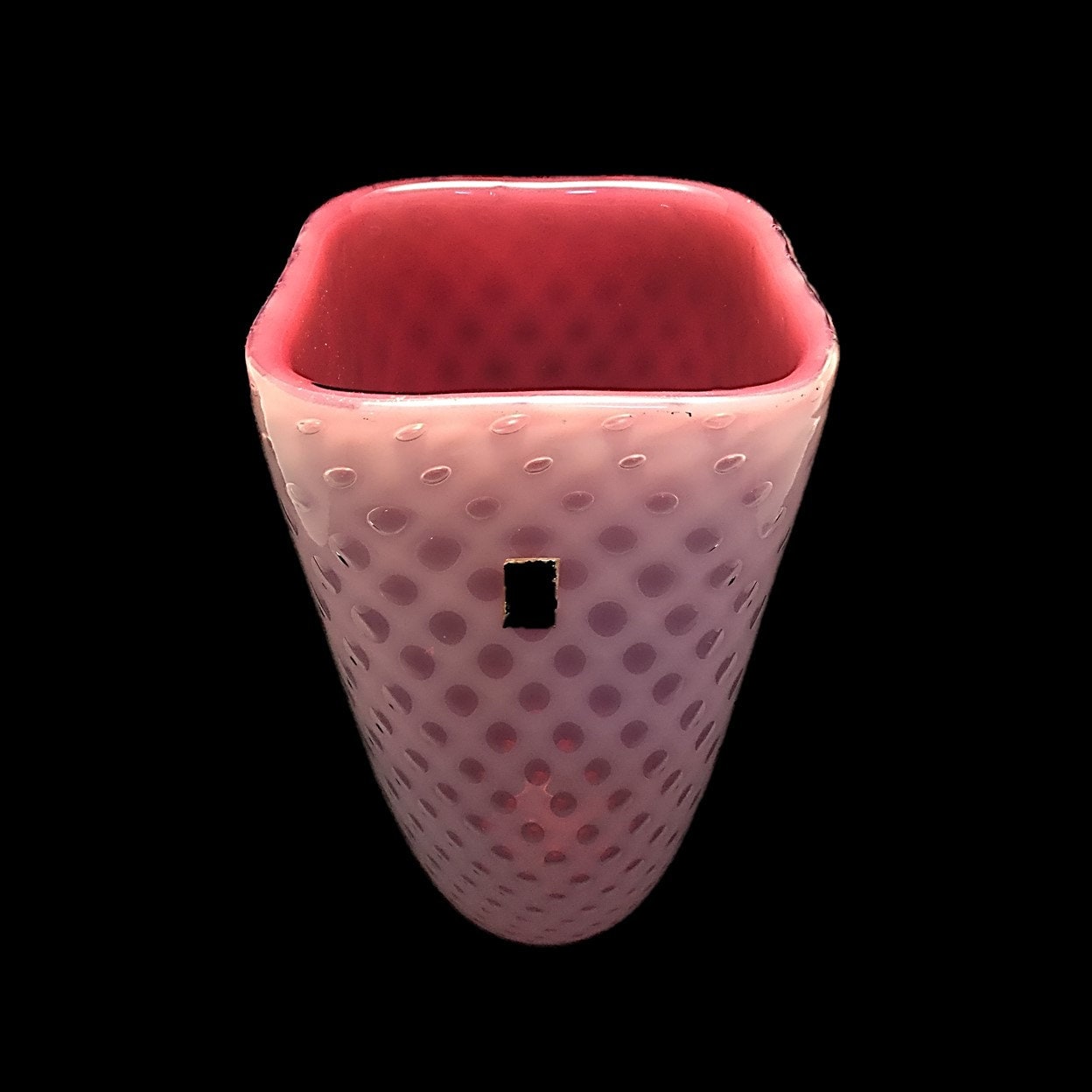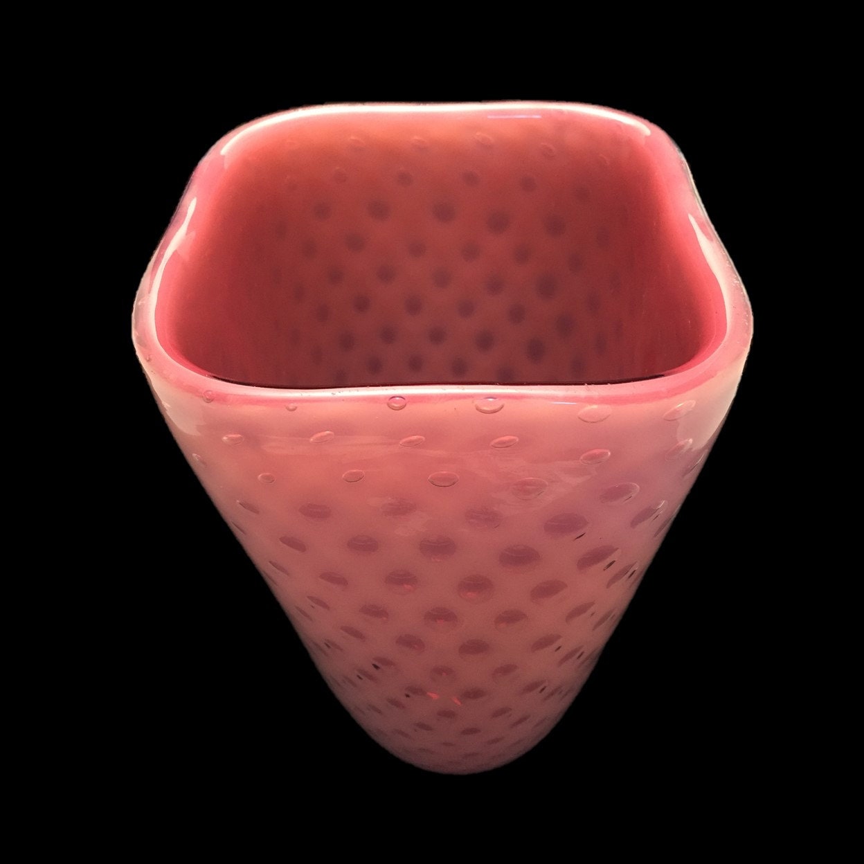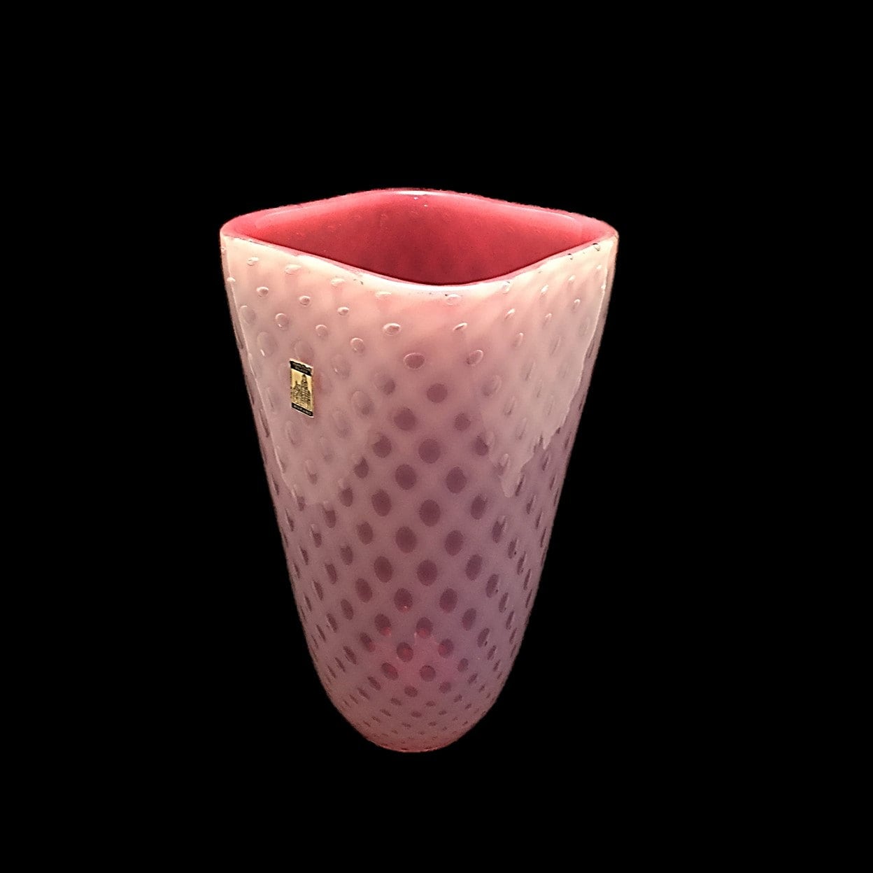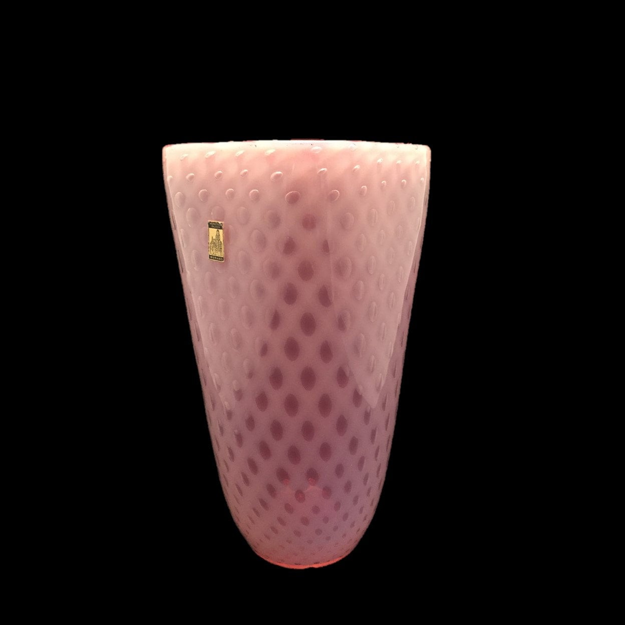 Behold this Fratelli Toso masterpiece--a very rare VERY LARGE pink/white opalescent/opalino cased glass vase with an unusual bullicante (bubbles-in-the-glass) pattern, it's authenticity confirmed by not one but two Fratelli Toso labels, one on the front and one on the base. How rare? I've been collecting Fratelli Toso glass for the last decade-plus and I've encountered this particular beauty only once before--on 1stdibs. (Not only is our price waaaaay better, but ours has the labels, making it more valuable.)