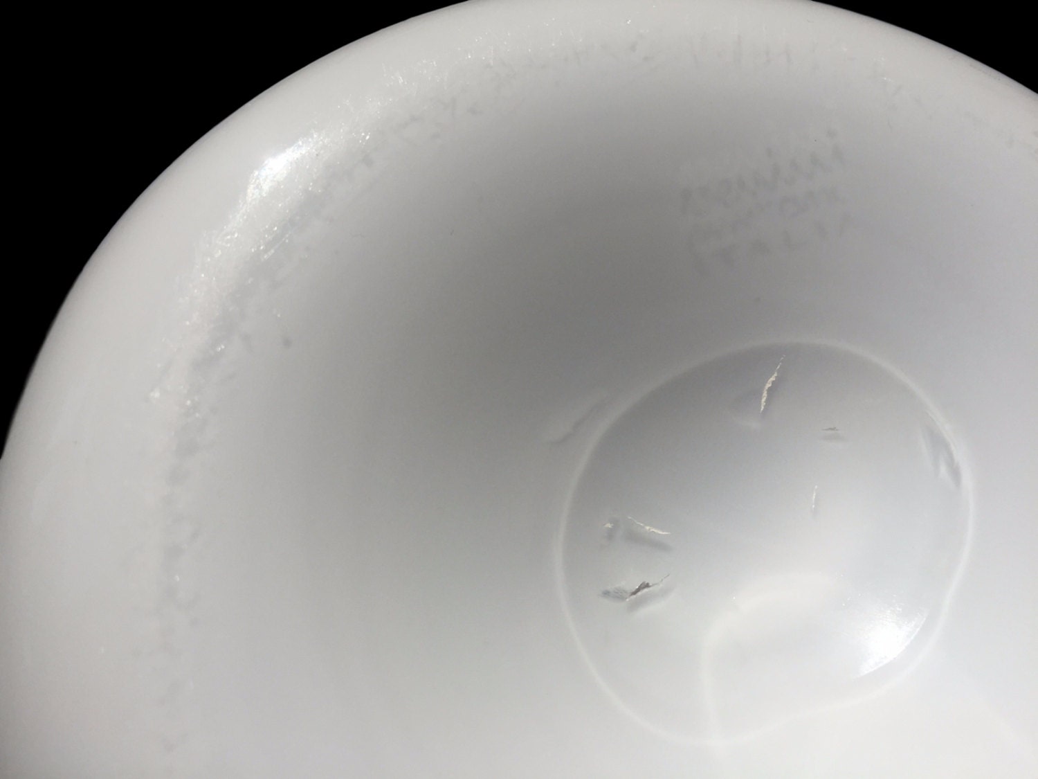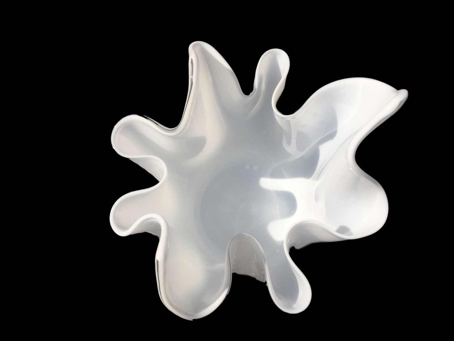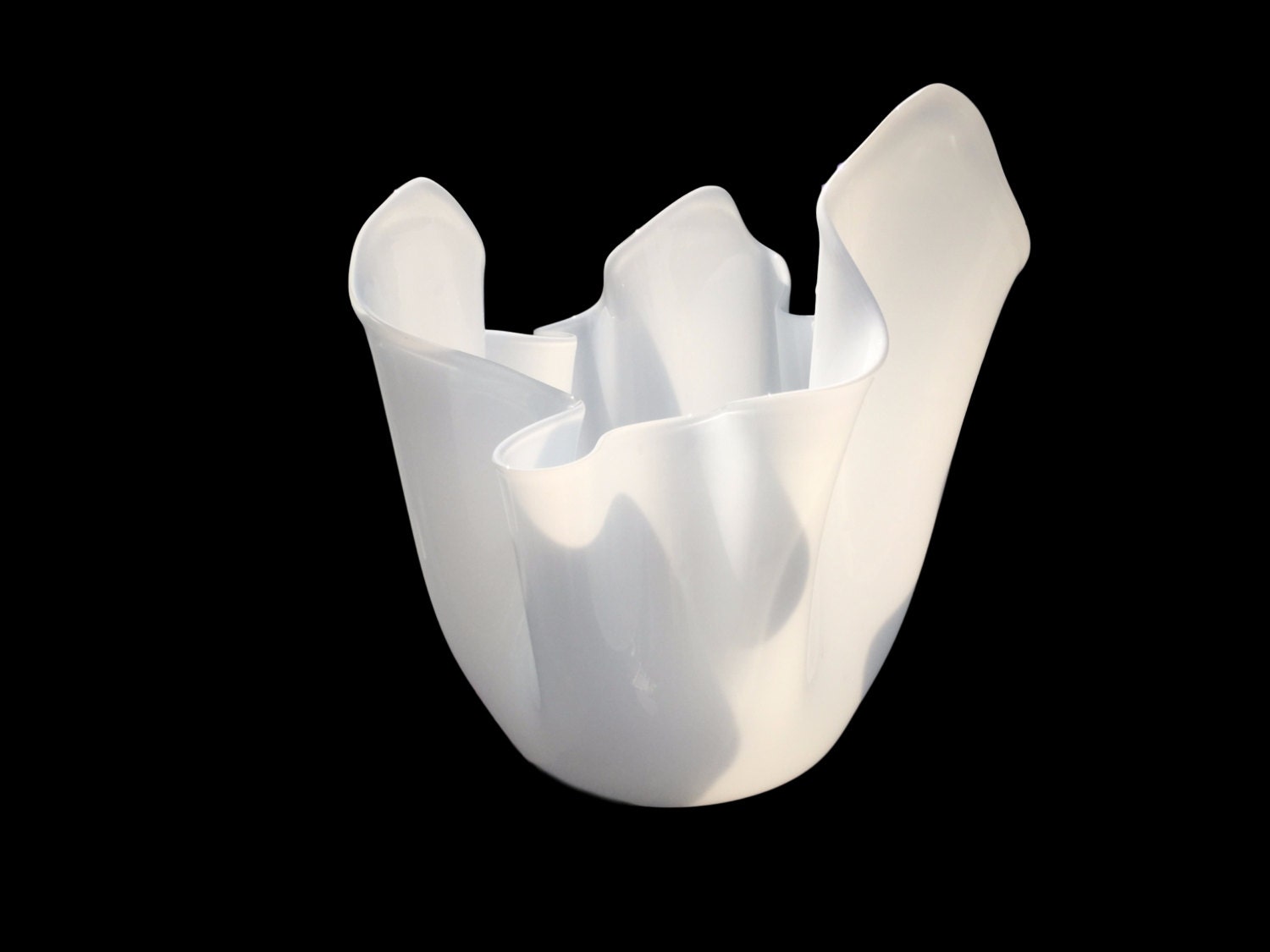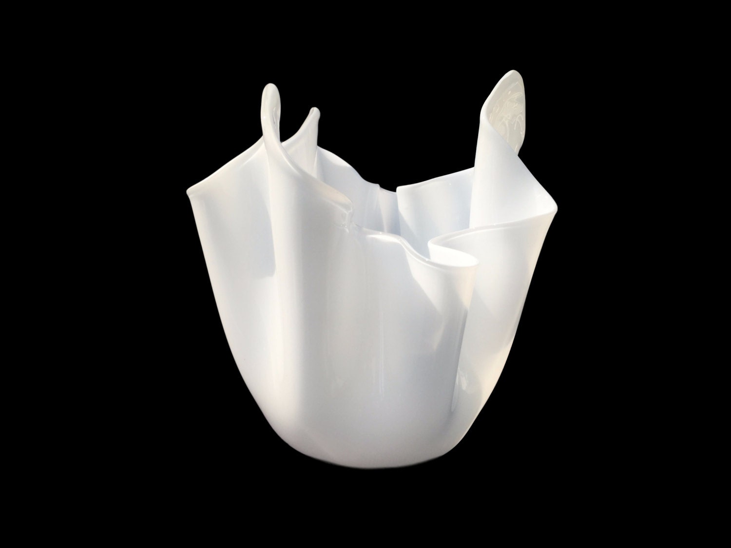 A superb example of an early Mid-Century Venini fazzoletto vase in white, with the telltale Venini Murano ITALIA three-lined signature on the base. (This form of the signature was used from 1948 into the mid-1960s and is easily distinguishable from later versions.) This highly-coverted and dramatic piece is MASSIVE--9" tall and roughly as wide--one of the largest I've encountered dating from the mid-century. Some tool marks on the base, as well as the wear expected on such an old well-loved piece, but no damage.