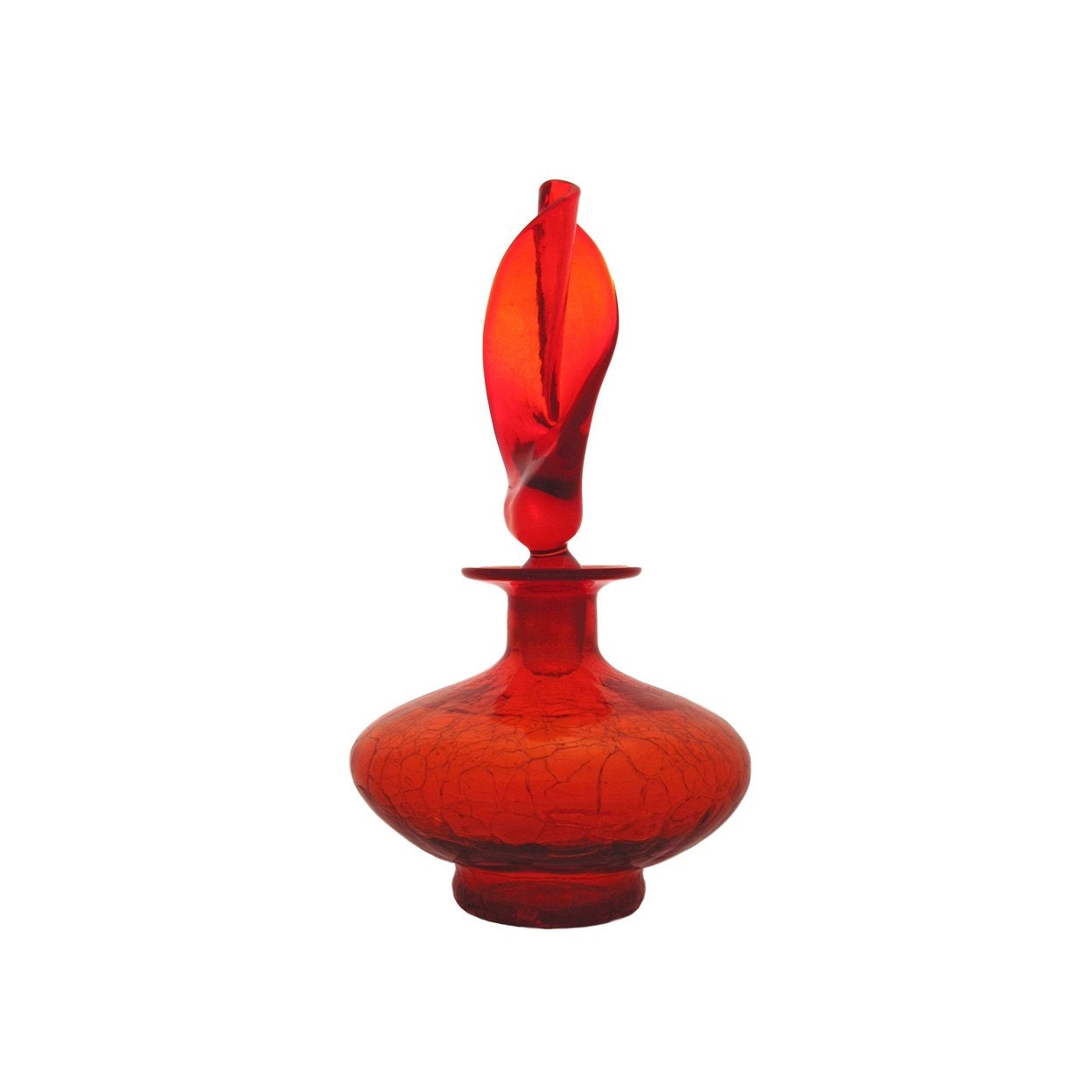 This pristine, mint condition mid-century OUTRAGEOUS AMBERINA Rainbow crackle glass decanter, roughly 15" tall and 7" at its widest, sparkles like a jewel! The now-defunct Rainbow Glass Company, known for its elaborate and oversized stoppers, was once based in Huntington, West Virginia, just down the pike from Blenko (the maker this design is often wrongly attributed to).