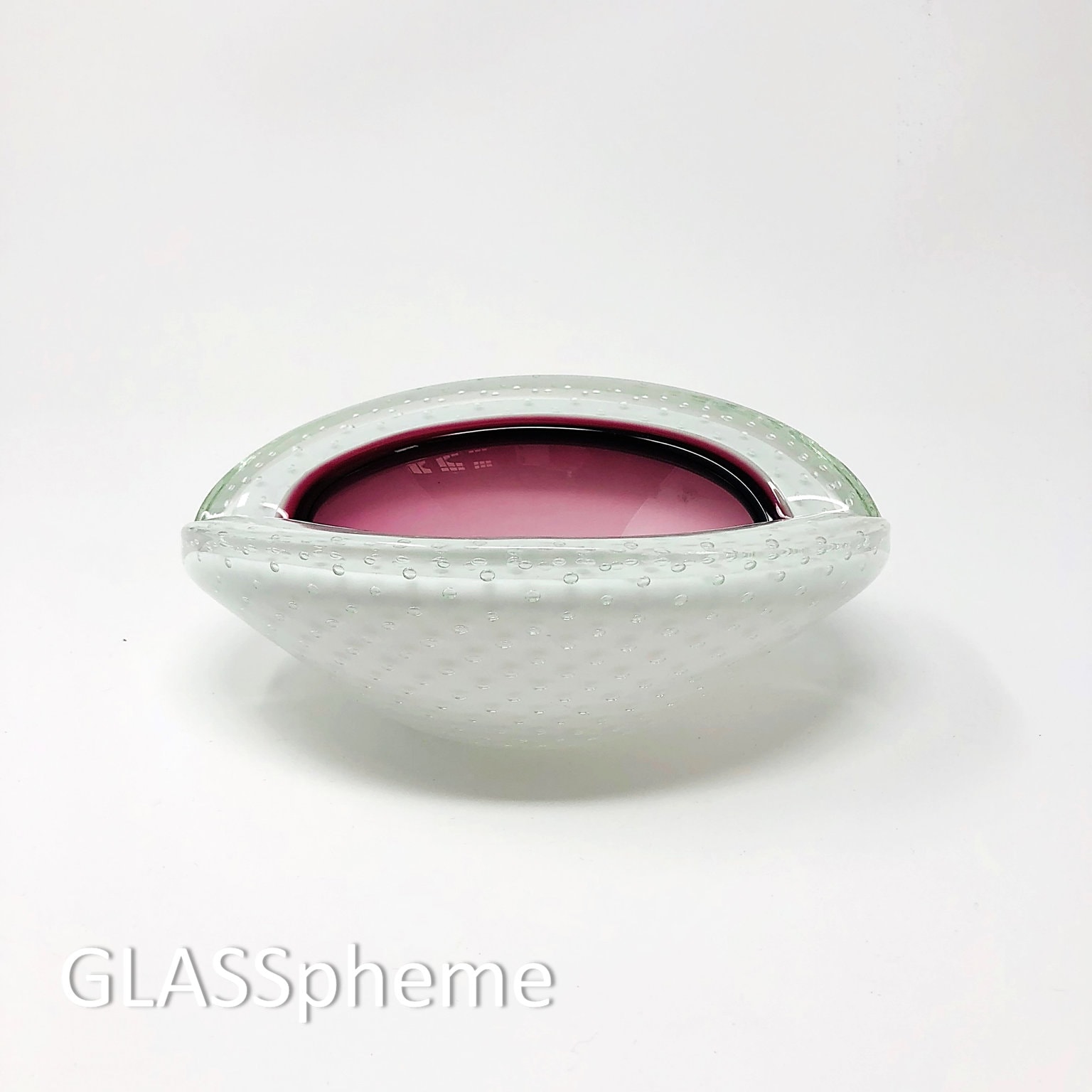 This STUNNING and LARGE mid-century Italian | Murano cased | sommerso glass bowl is killer gorgeous! Done in lattimo (white) glass with a light cranberry interior overlay rimmed in deep purple/cranberry glass, the exterior is encased in a thick crystal bullicante shell that gives the piece almost a floating ethereal quality. The effect is absolutely dazzling! While Alfredo Barbini has used all these elements in some of his documented pieces, a few of the most similar works I've come across bear Fratelli Toso's round silver 'Made in Murano" label, so I feel most comfortable with that attribution.
