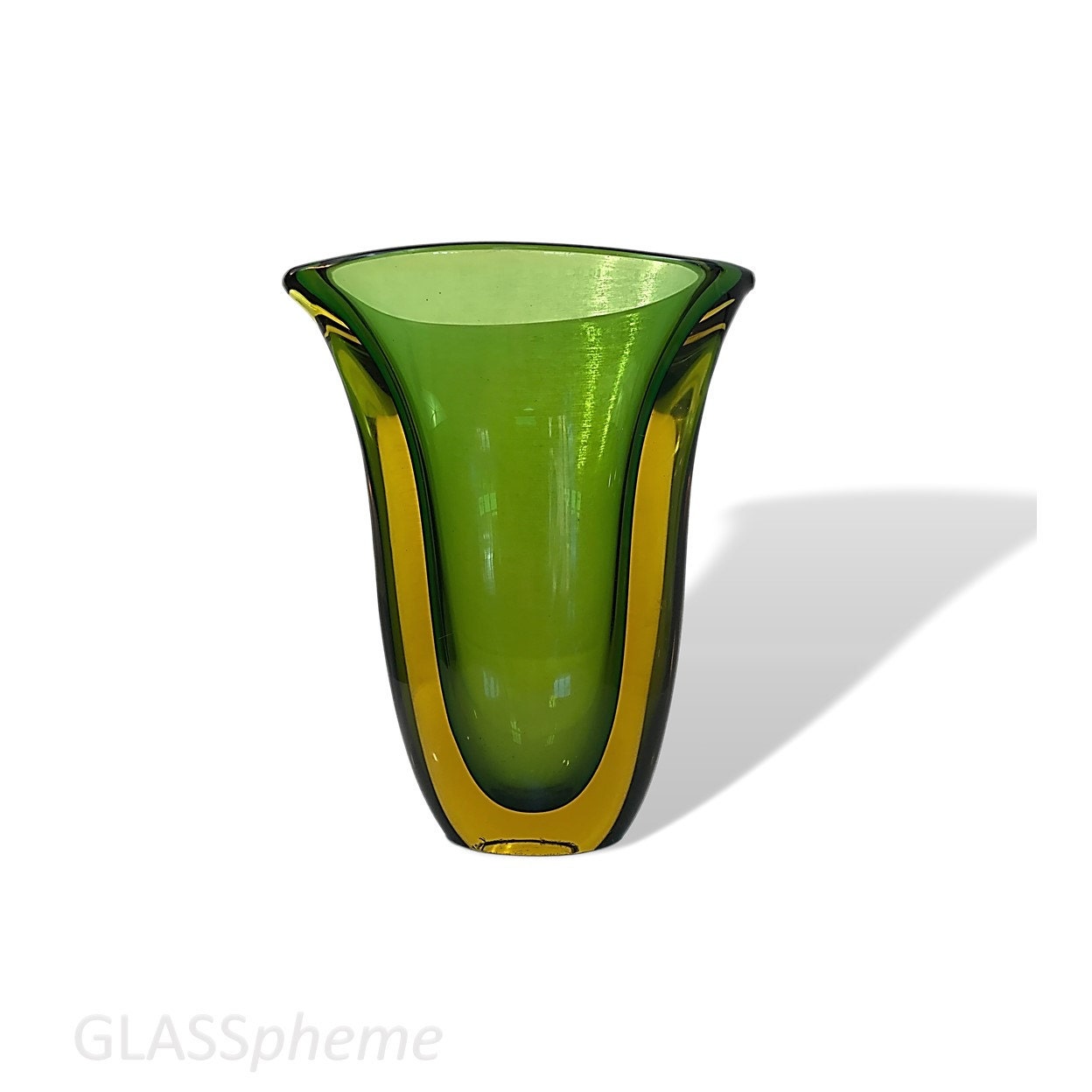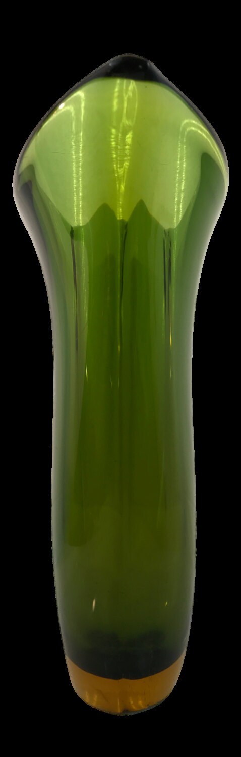 Feast your eyes on this extraordinary piece of mid-century Italian/Murano art glass attributed to Flavio Poli for Seguso C. 1950. There is no label and while there are many similar documented pieces published with that deep amber and green sommerso meld, this is the first time I've ever seen this specific shaped vase. We'll leave it to you to decide, but this is doubtless an important circa 1950s piece of Venetian art glass, by Flavio Poli or not.