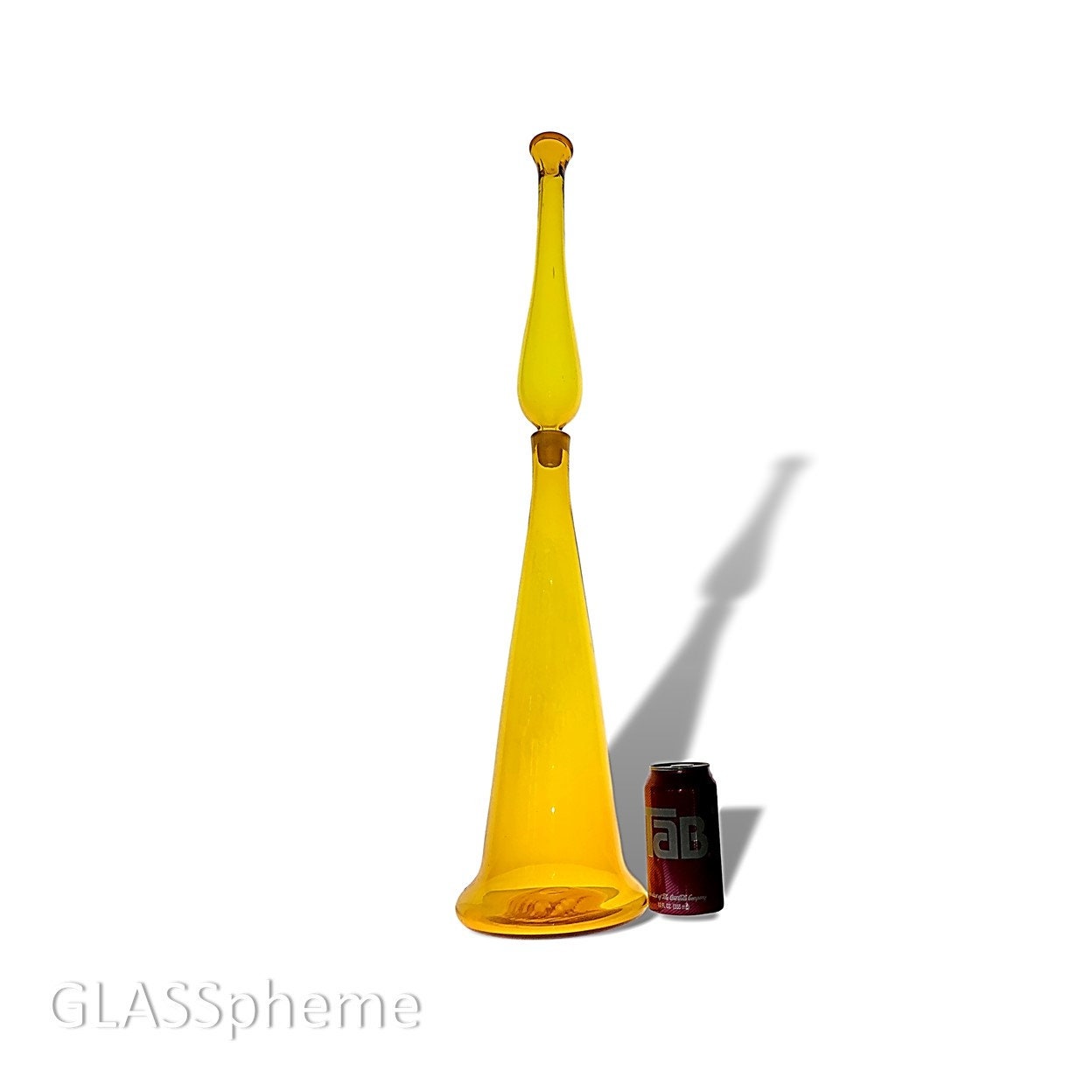 Behold this magnificent extra-tall Blenko #6029 architectural glass decanter by Wayne Husted in an extraordinarily sunny JONQUIL! The standard Blenko catalog size for this piece is 27.5"—ours is over 30" tall, with the base nearly 18" tall and the rest is stopper. Though this dramatic large piece was produced from 1960 through 1964, their relative scarcity today suggests that they were not produced in great volume, not surprisingly given its ridiculously impractical size for serving. But as a display piece WHOO HOO--this towering beauty will light up your room!