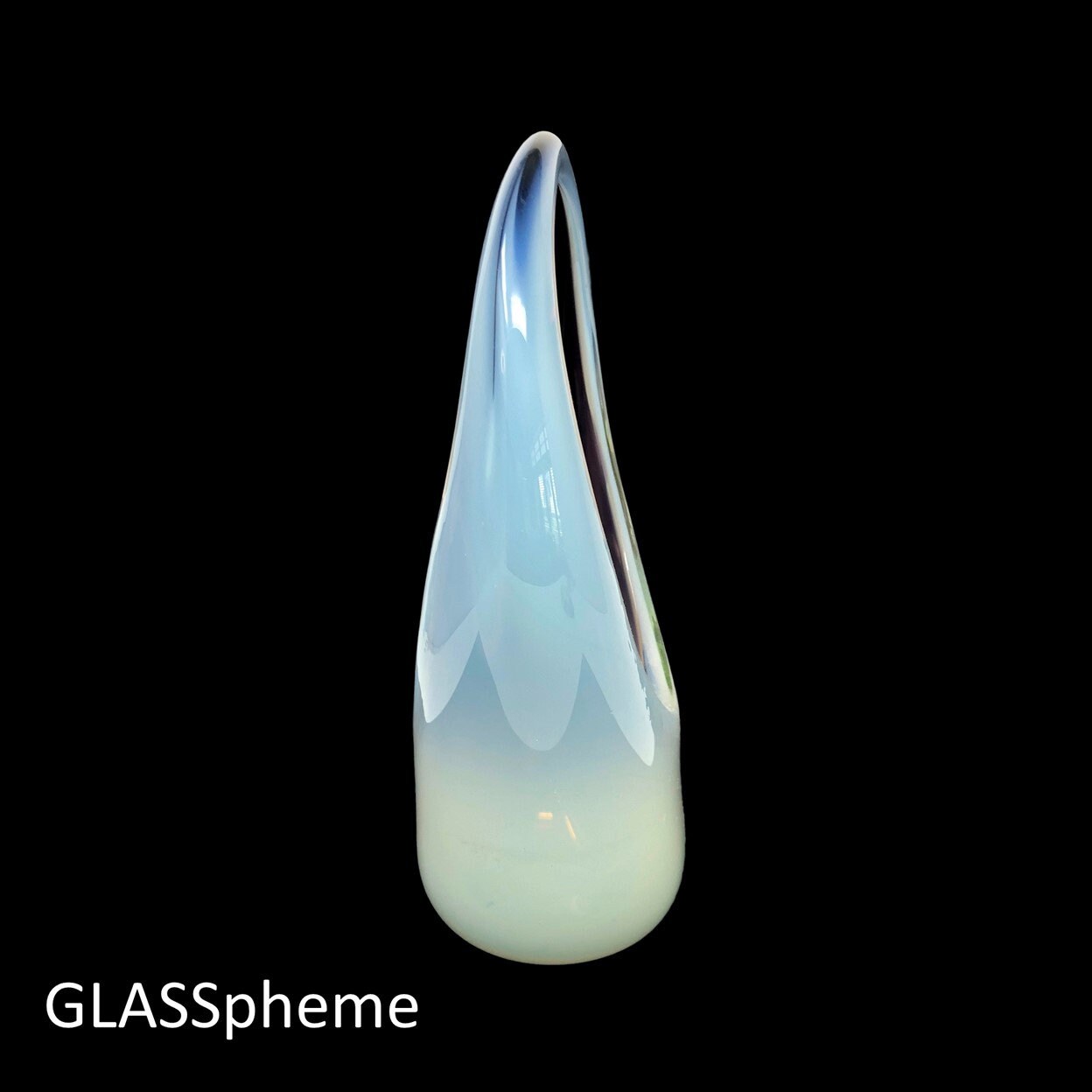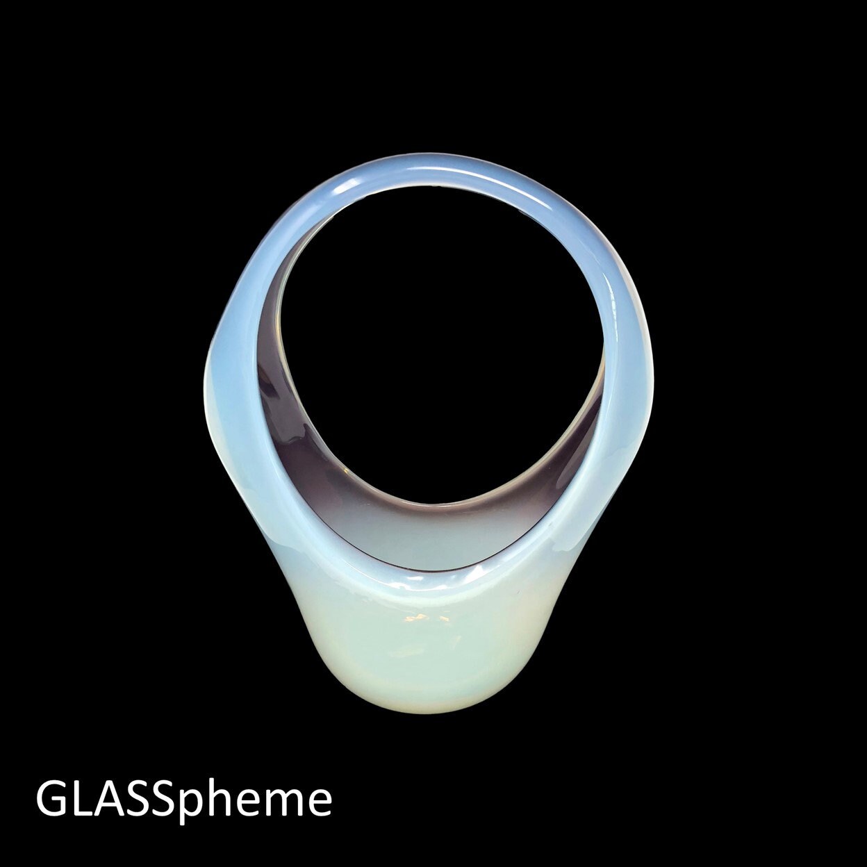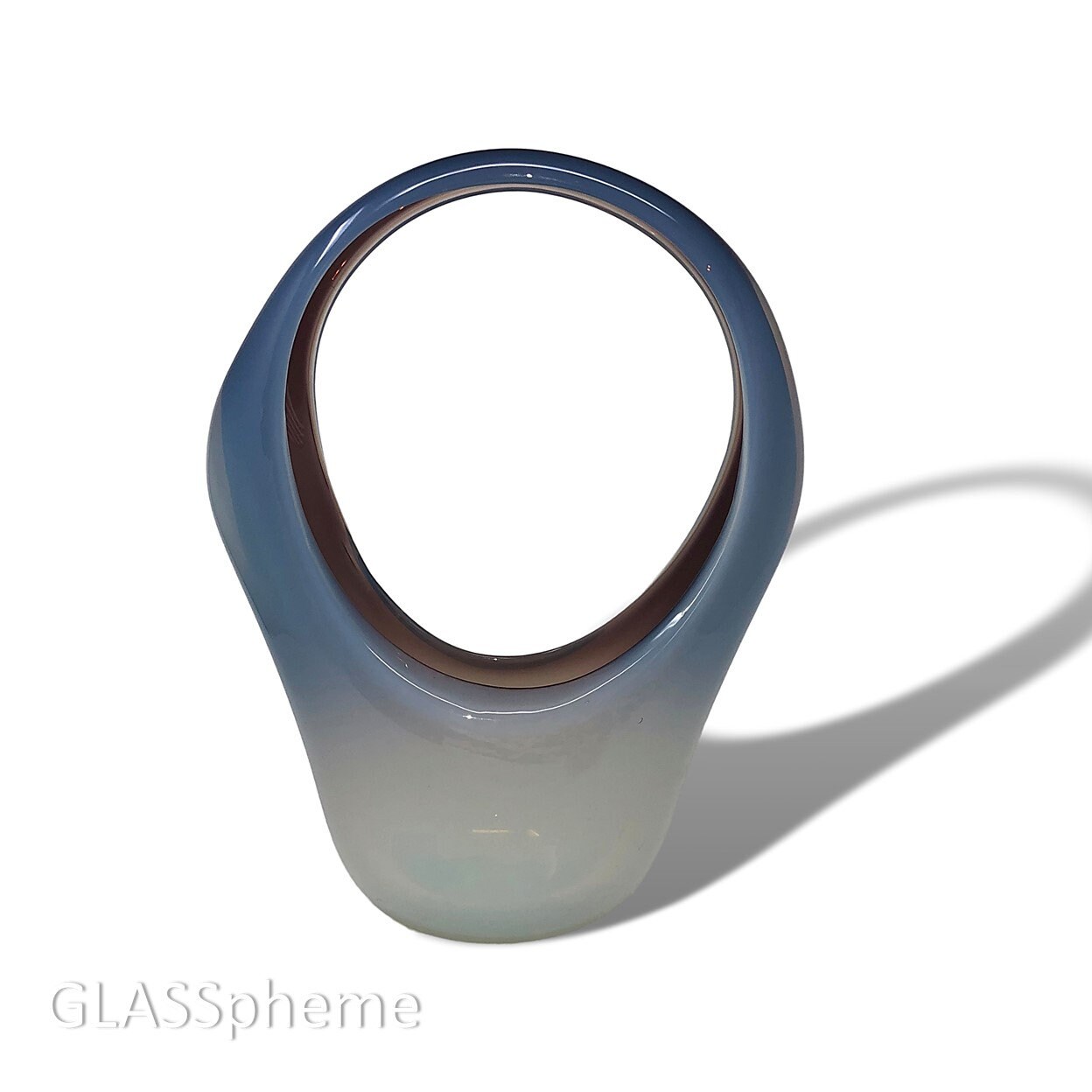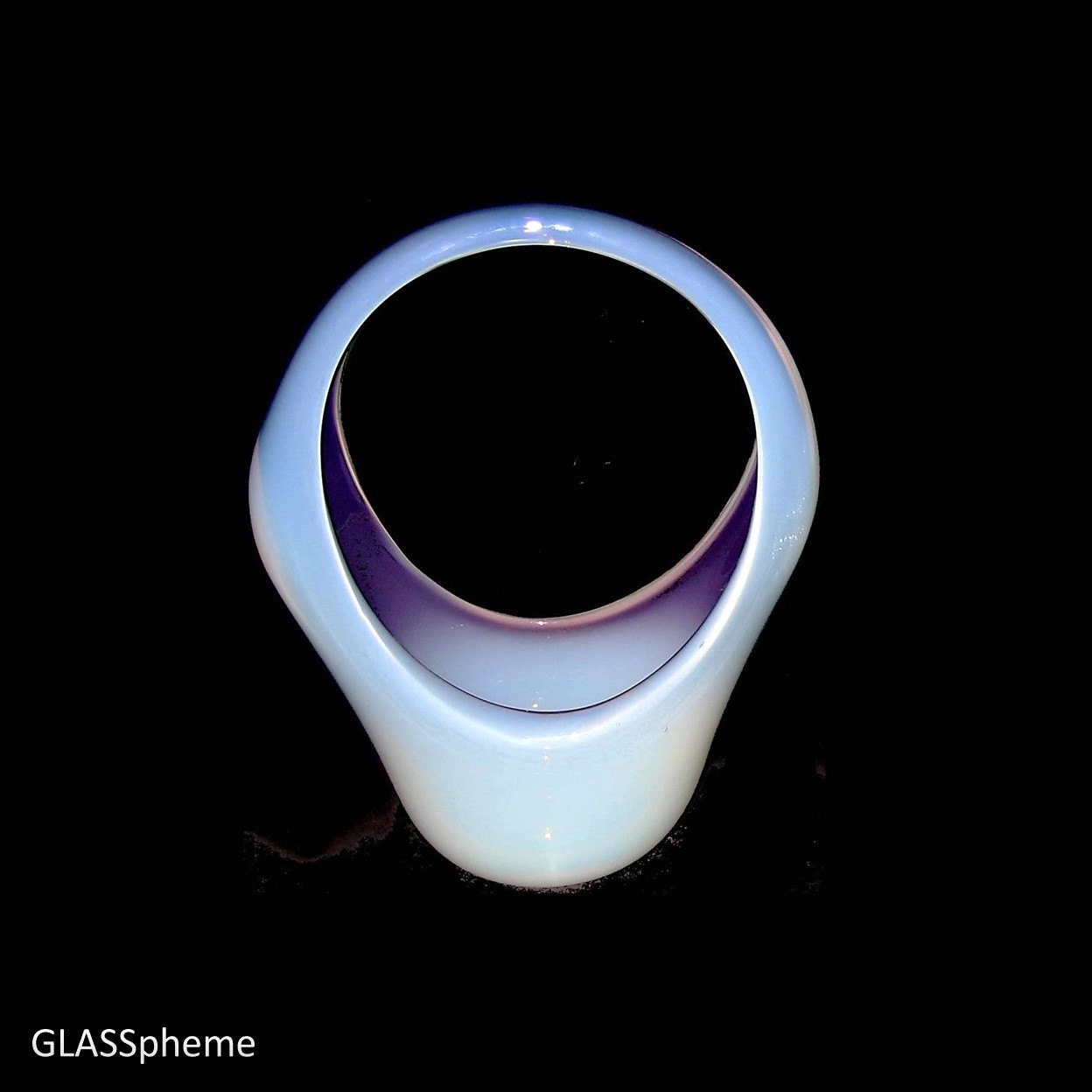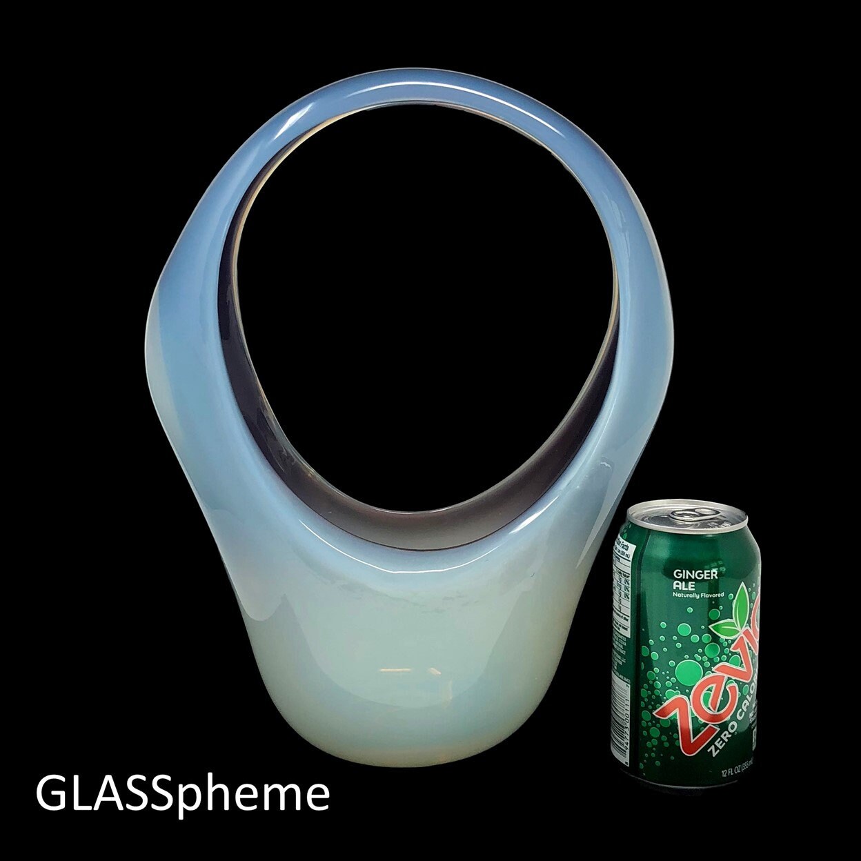 Feast your eyes on this extraordinary piece of mid-century Italian/Murano art glass documented in Leslie Pina's FRATELLI TOSO. This breathtaking vase/basket/sculpture is amazing in its complexity--the opalescent lattimo, blues, pinks and purples glowing and shifting constantly in the light. Aside from the base wear expected on this very heavy piece, it is flawless and perfect.