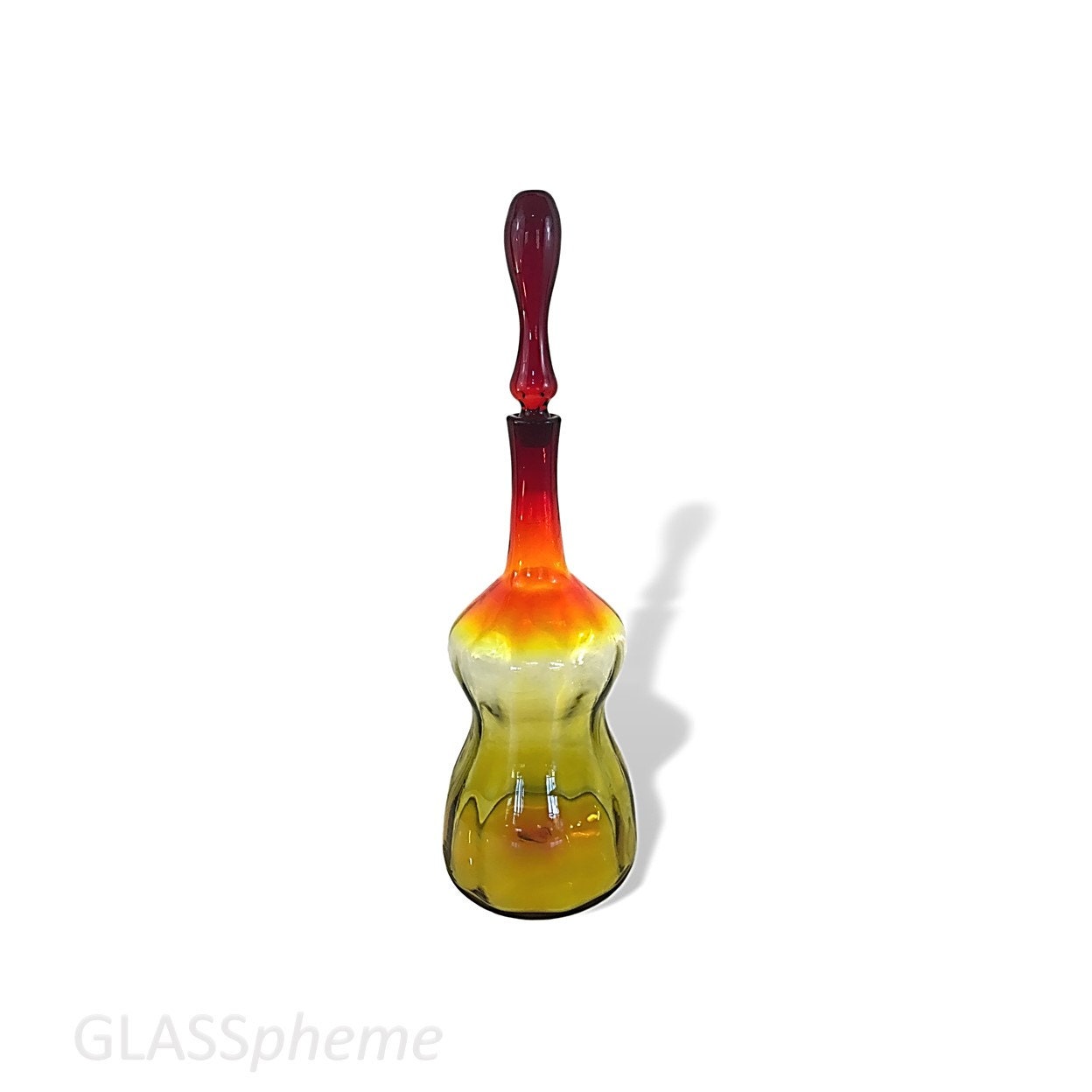 HUGE gorgeous Blenko #6954 optic glass floor decanter, designed by Joel Myers for the 1969 catalog. This clean sparkling beauty (I don't think it's ever held liquid) is done in an extraordinarily bright, vivid amberina that spans the lightest of the yellows to the darkest possible orange.