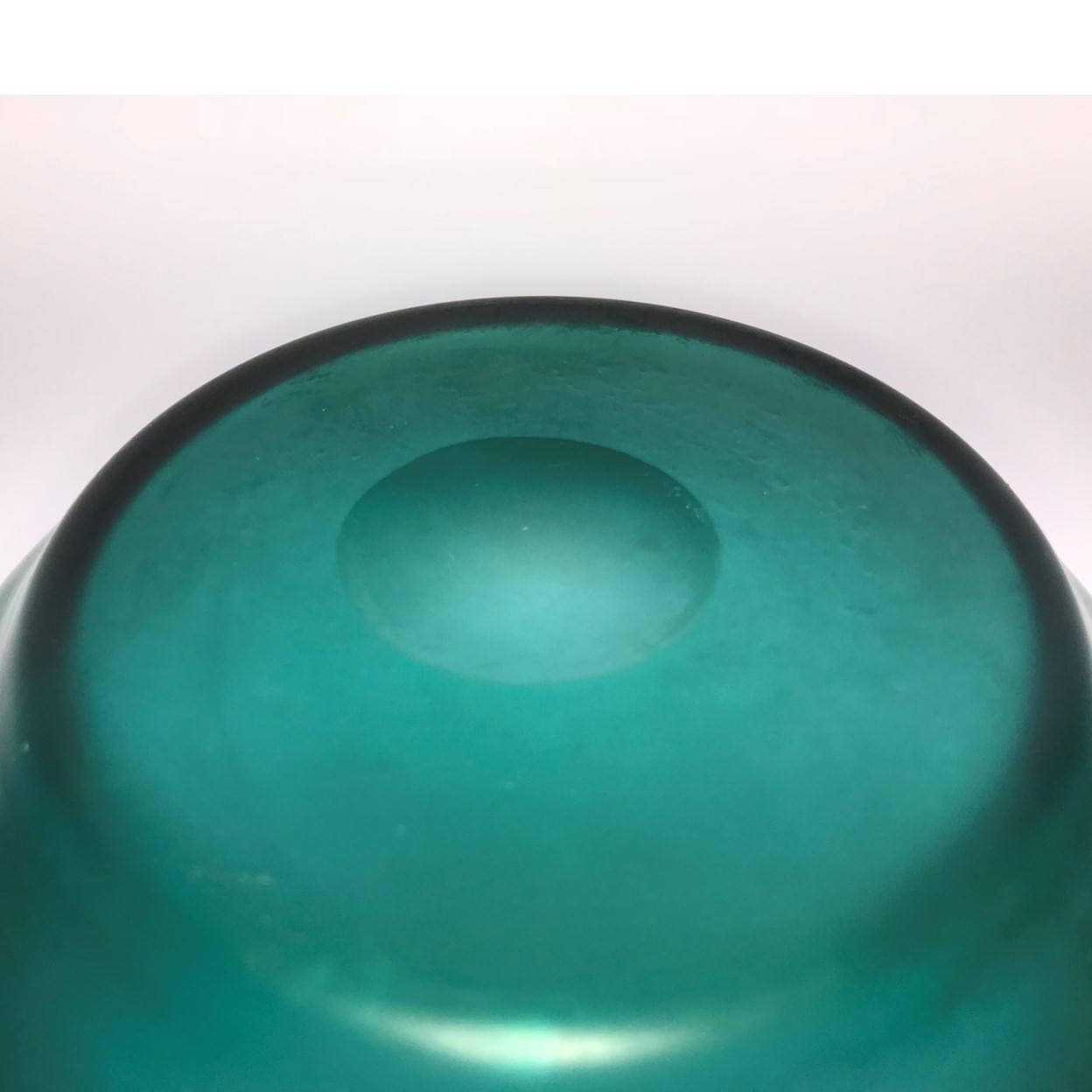 Exquisite 22" tall mid-century Italian satin (satinato) glass decanter in teal with flat-rimmed neck and clear tear-drop stopper. The remant of a red "Made in Italy" label remains, but no further clue about its origins. While Italian satin glass production is almost universally sold online as "Carlo Moretti", this beautiful piece bears no resemblence to his other designs. Rather, I believe that this piece was produced in Empoli based on popular midcentury US designs (e.g. Blenko's shot glass decanter and tear-drop stoppers). Even the teal is a perfect match for Blenko's PEACOCK.