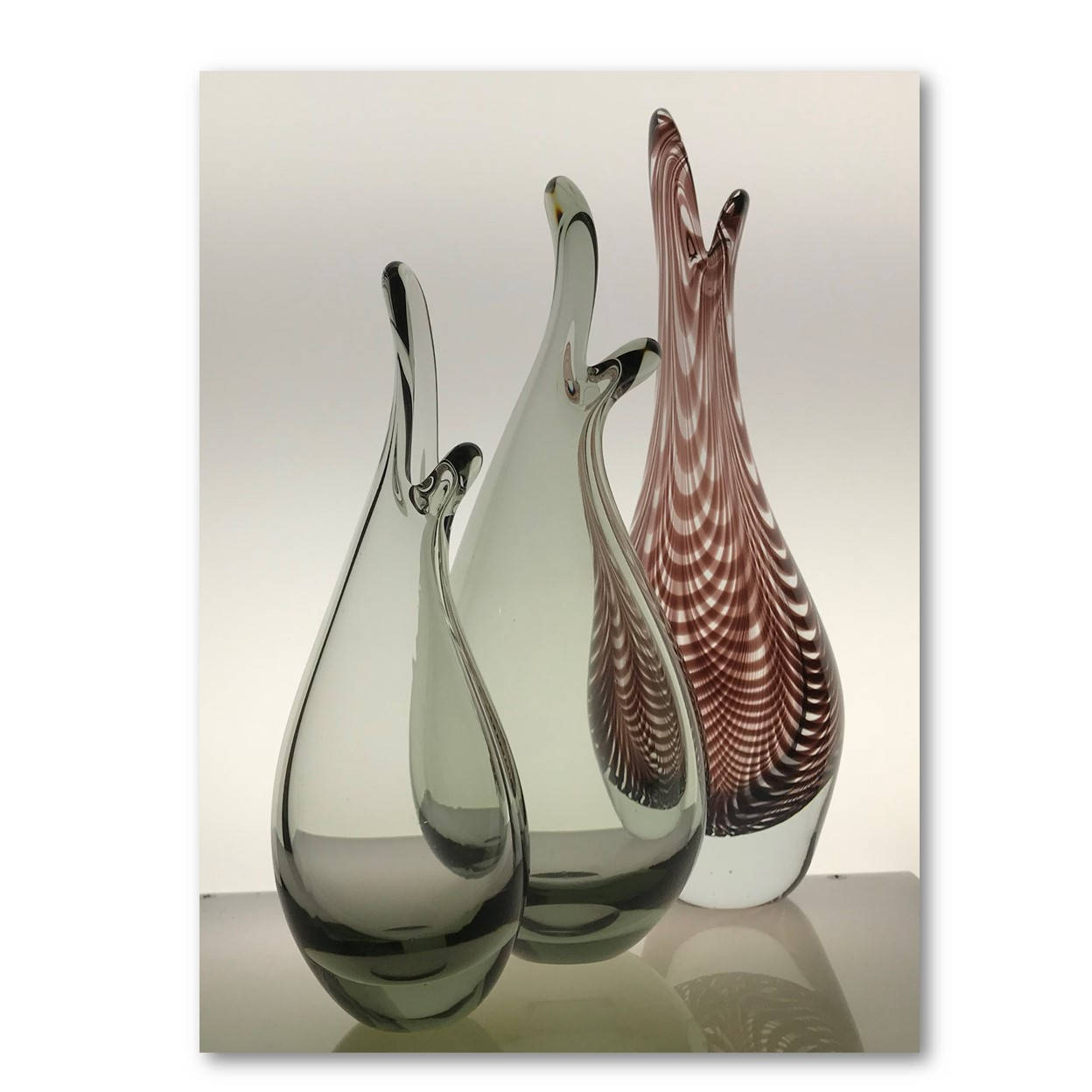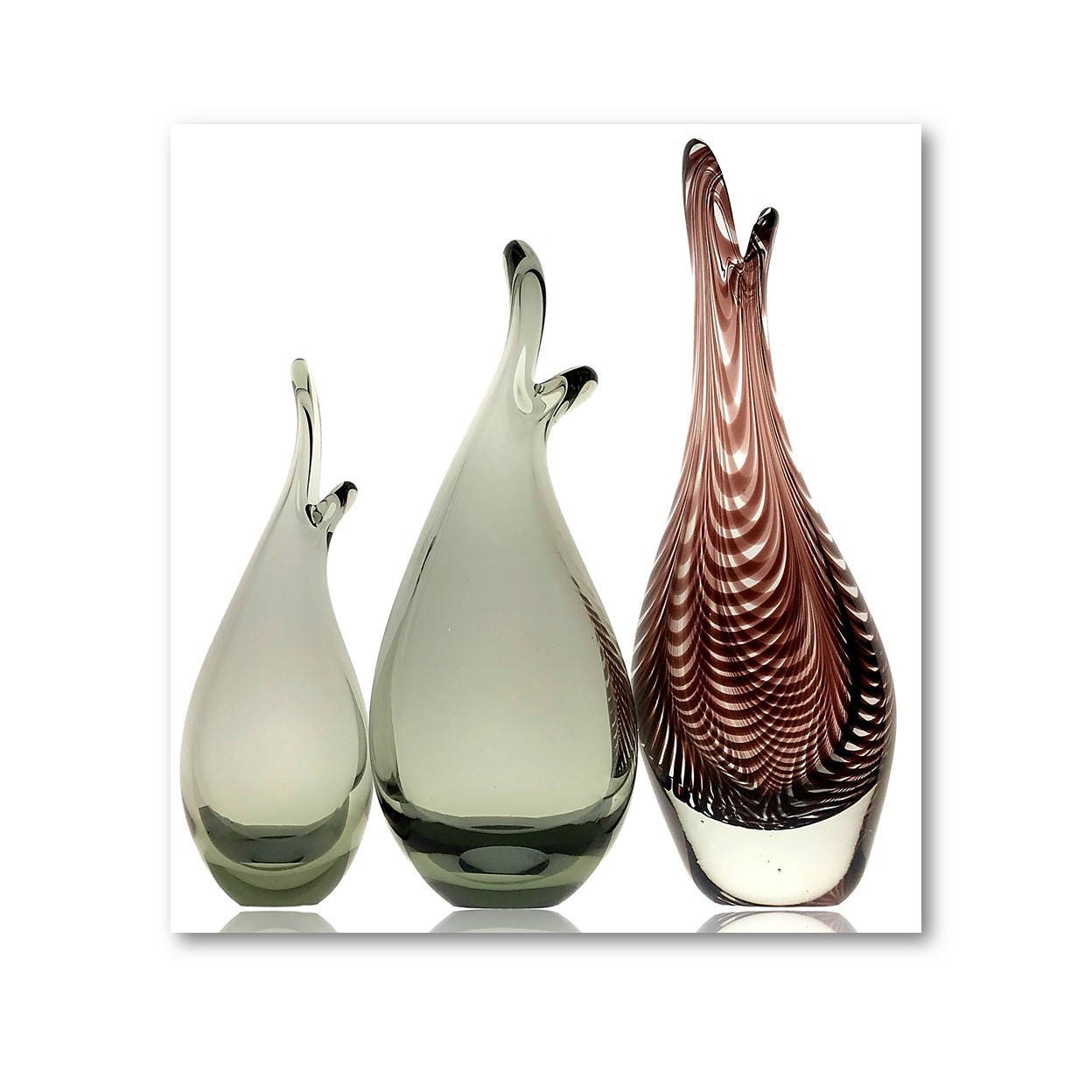 The ICONIC Danish Modern "Beak" vase designed by Per Lutken in the late 1950s is one of Kastrup Holmegaard's most famous and highly coveted designs. Here, we have three of them, two in smoke/gray/charcoal, the tallest in an amethyst swirl. The smoke pieces are both signed and dated 1959. While the largest piece is not signed, it is well documented.