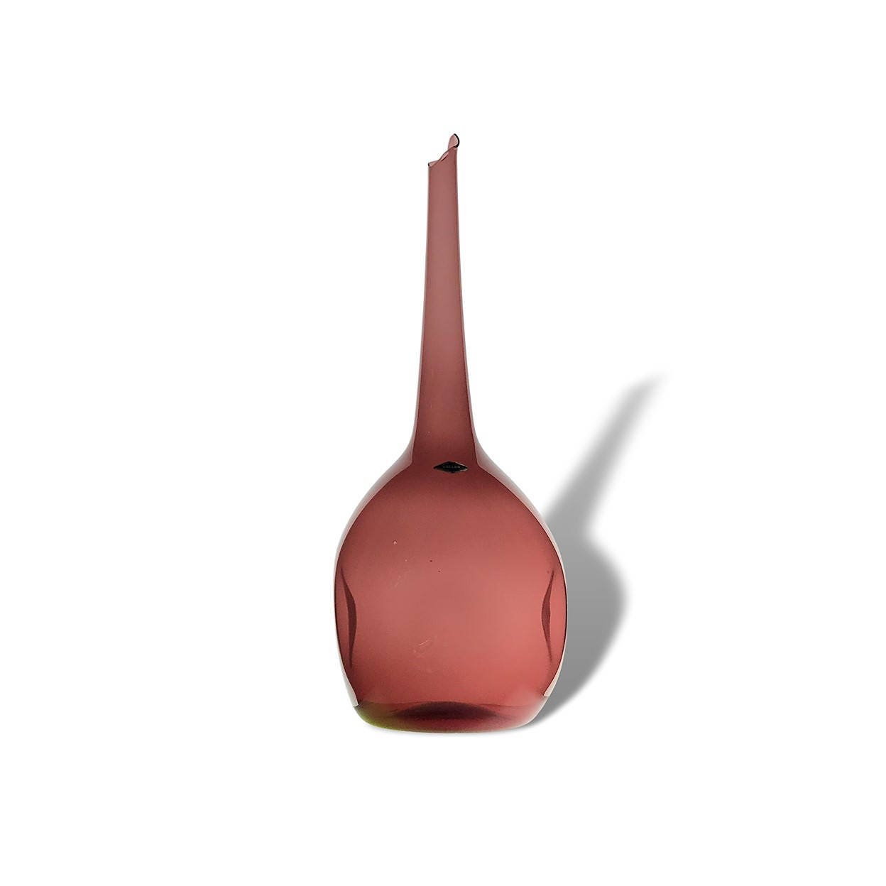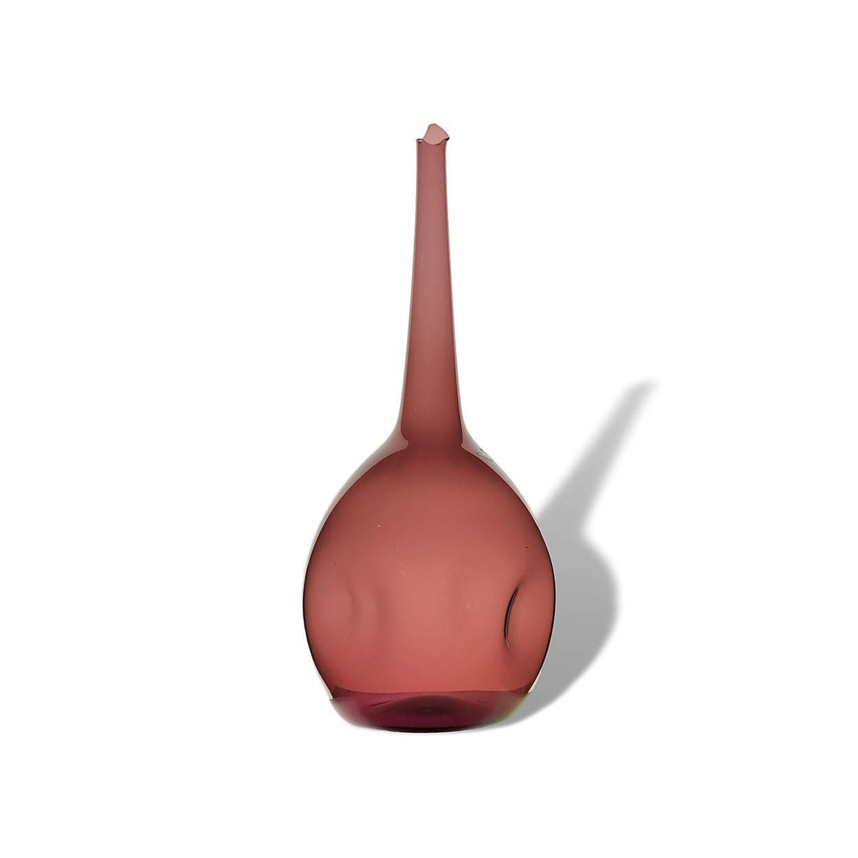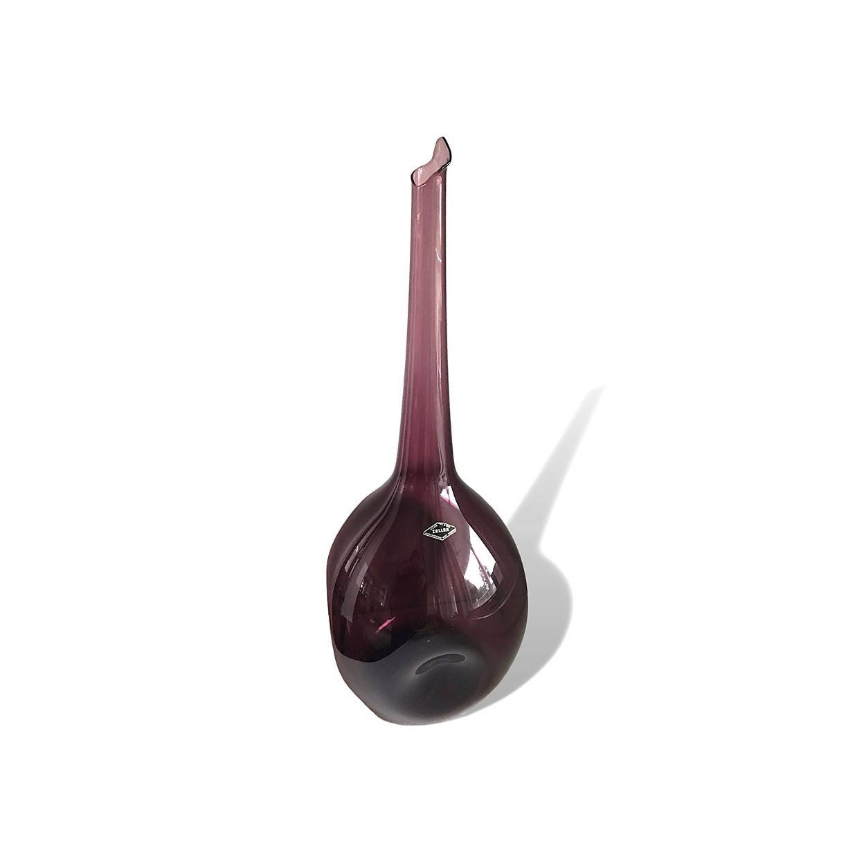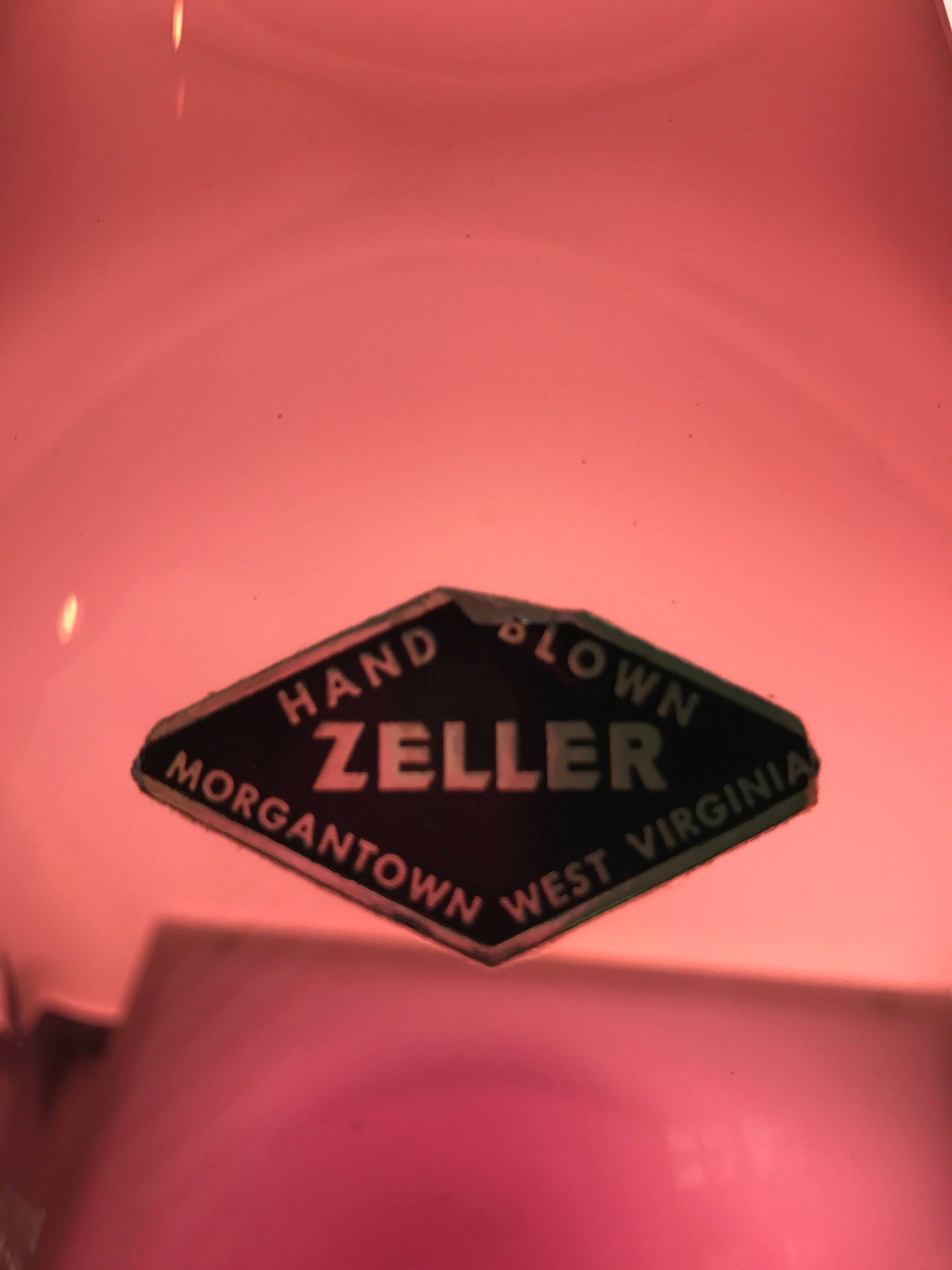 This is an AWESOME and highly coveted piece of mid-century US blown glass by Zeller, another now-defunct Ohio River Valley handmade glass blower. Blenko collectors seem to have a special affinity for Zeller's dramatic oversized vases, possibly because Wayne Husted himself is purported to have designed them (I've read this several places but have no independent or authoritative sourcing here). The backlighting on this glass gives a much better sense of the clarity and hue of this beautiful color, and the decanter itself is in fantastic condition given its age--the light wear and near-mint condition of this 50-year old piece suggests it has stayed in one place for a very long time.