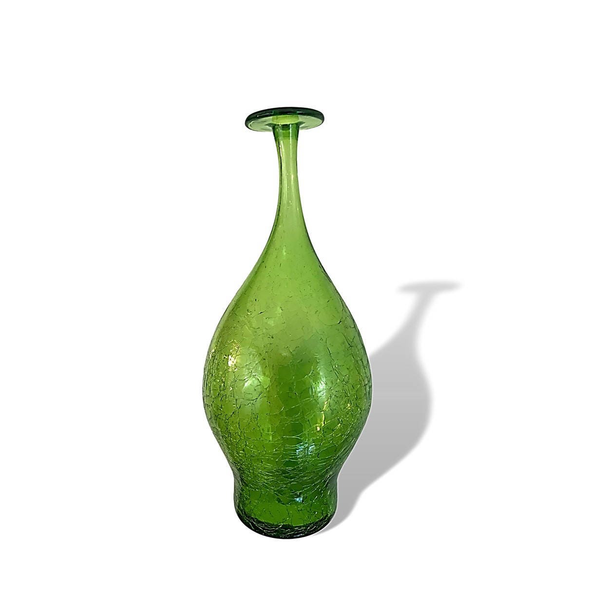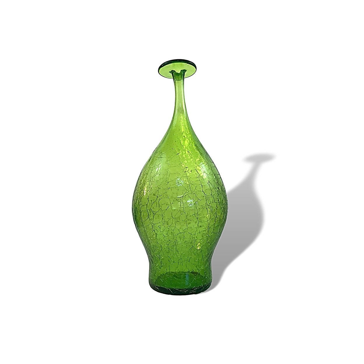 Blenko's #6422 flat-topped vase by Joel Myers, produced for two years only (1964 & 5), is a mod curvaceous wonder. One of our favorite designs, the somewhat asymmetrical cast to this piece gives it a certain jauntiness that kind of adds to its cool space age vibe. In a sunny sparklng Olive Green crackle.