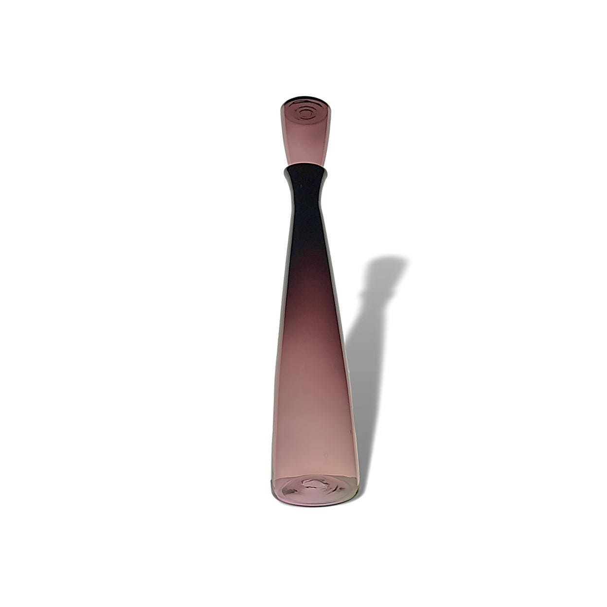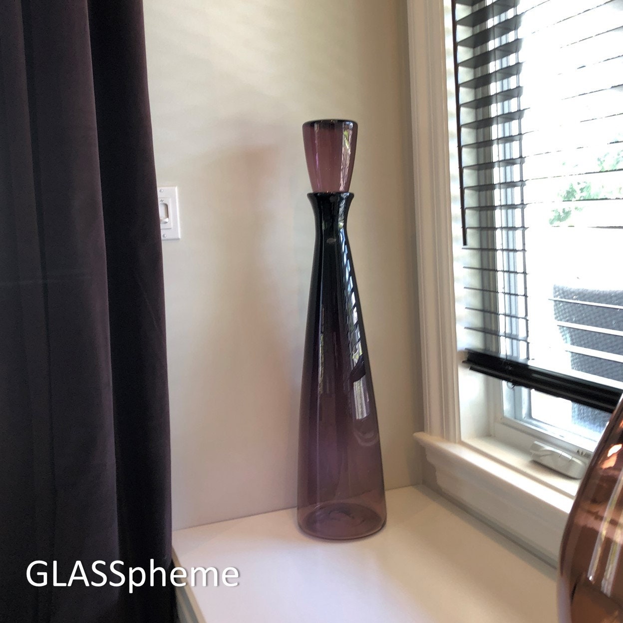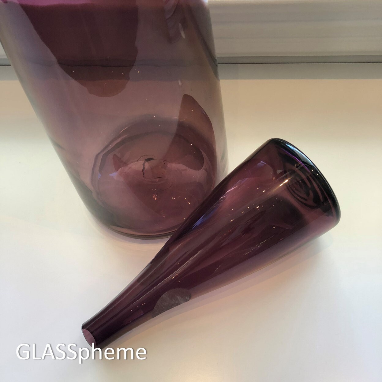 Unlike most of my other pieces, this is not a 'collector' play. (Not yet, anyway, as it was produced in and stamped 2008 on the base. Note, however, that Blenko hasn't produced this design in some years and getting your hands on one isn't so easy.) This is a SHEER AWESOMENESS play! Blenko glass, at its finest, has truly sublime qualities and the color and clarity of this piece make it absolutely weep-worthy! Done in "Vineyard" (the only purple in Blenko's 2007-2008 catalog), this is a deep complex more purple amethyst most akin to the much-coveted "Mulberry" of 1958 and Plum" of 1967 (while the lighting isn't optimal, the last photo shows this beauty on display with my Mulberry, Lilac, and Plum Blenkos).