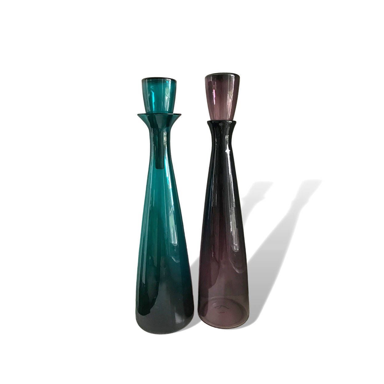 The clean modern lines of Blenko's #6138 architectural decanter, designed by Wayne Husted for the 1961 catalog, made it so sustainably popular that Blenko produced it for the whole of the 1960s and the 1970s. And then, around a quarter of a century later (2003), they brought it back again--with a new catalog number (3203) and some minor changes (see photo #2). Notice that the decanter has grown sleeker--somewhat narrower in diameter with a less pronounced flange at the neck.