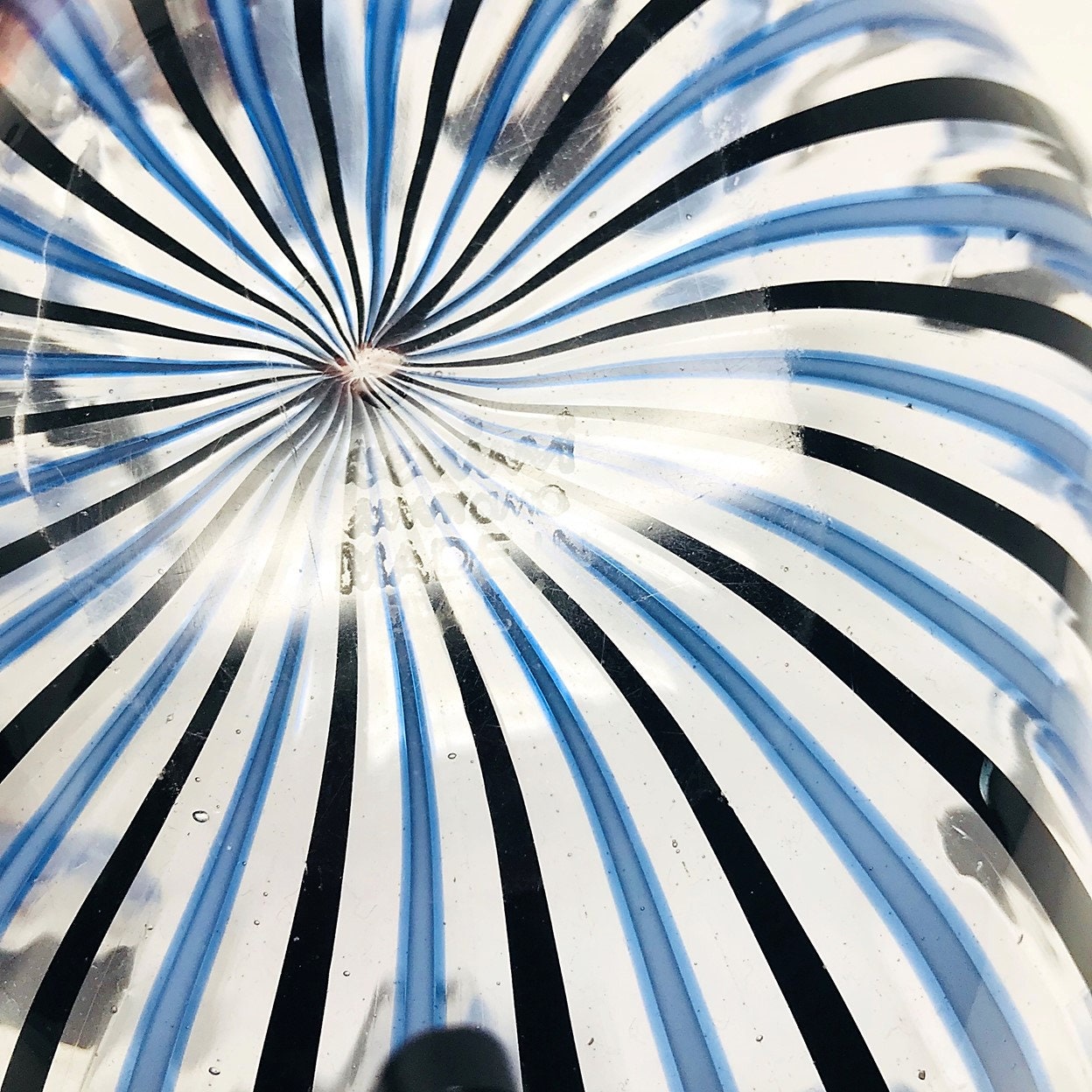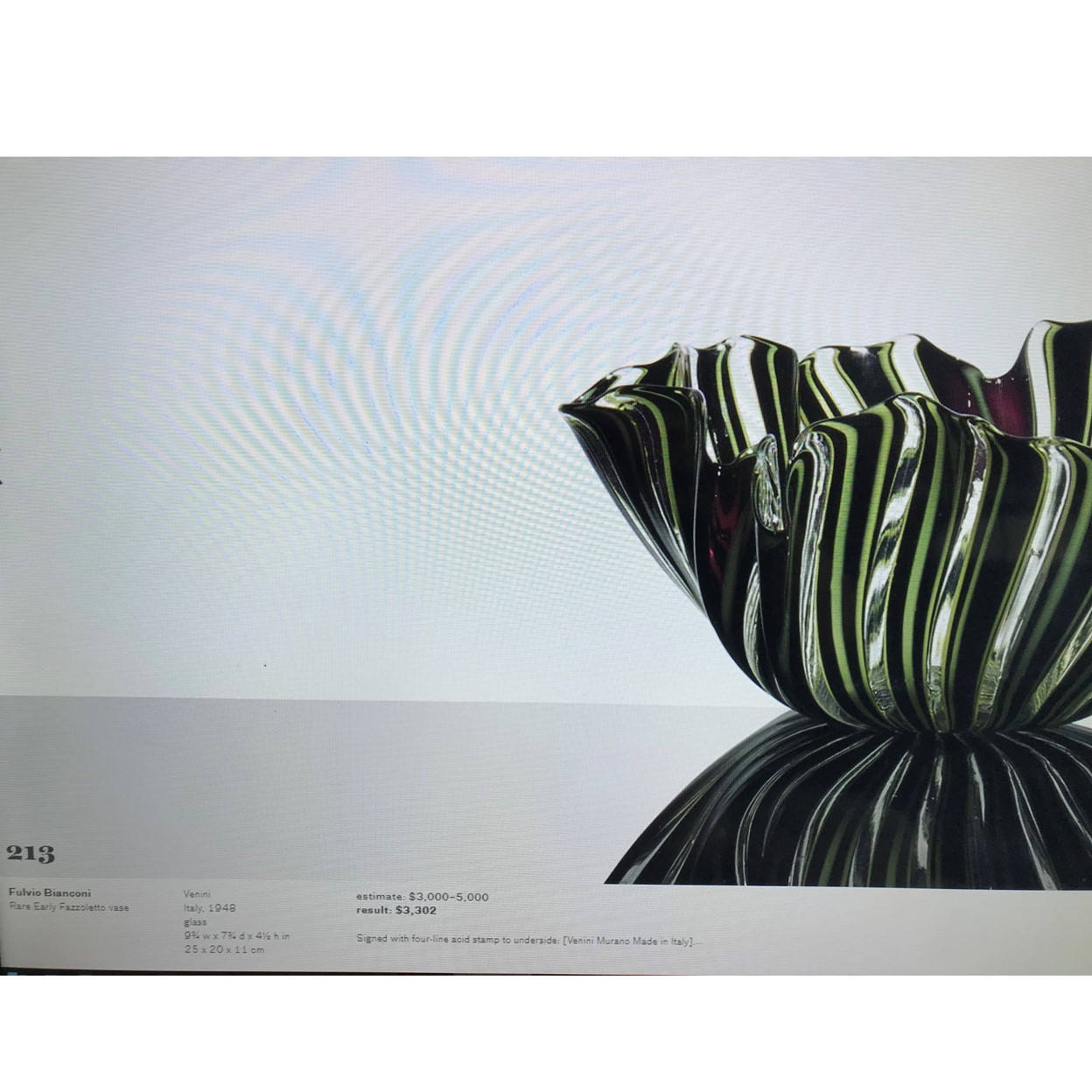 Certainly, the stretched striped cane construction is one of the rarer Venini fazzoletto designs available, especially in this massive 9+" wide size. But what makes our beauty here a serious rarity is the fact that its signature dates it to the very first year of Venini's fazzoletto production! Venini's earliest signature, "Venini | Murano" etched on two lines, was used from the company's inception in 1925 through about 1935. From 1935 through roughly 1948, the FOUR line "Venini | Murano | Made in Italy" was used (that's the signature on our vase!), and then the more commonly seen Venini | Murano | Italia signature came into use. The last photo is a screenshot of the same piece (same thich wavy canes, 4-line signature, same large size) featured in Wright's "Important Italian Glass" auction of June 2013.