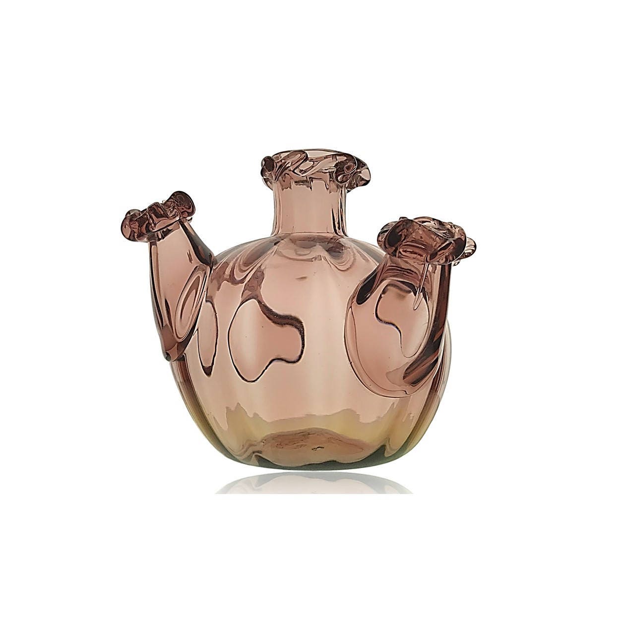 This piece is documented in both Murano Magic and Leslie Pina's Italian Glass, and our vase design and proportions appears to be an identical match for the amber ones photographed. Yet, Gordiola, a Spanish firm who has produced copies of this piece, has caused some confusion in the marketplace. The Cappellin Soffiato vases are very light, delicate and finely crafted; The Gordiola are thicker, heavier, and generally larger. Moreover, the Cappellin Soffiato vases of the 1920s are paler--even if only because the glass is much thinner. The pale pink of our speciman here is the same rose color used on Cappellin production around that time. Some of the Gordiola speciman's I've seen have a rough pontil, while ours has been fired smooth.