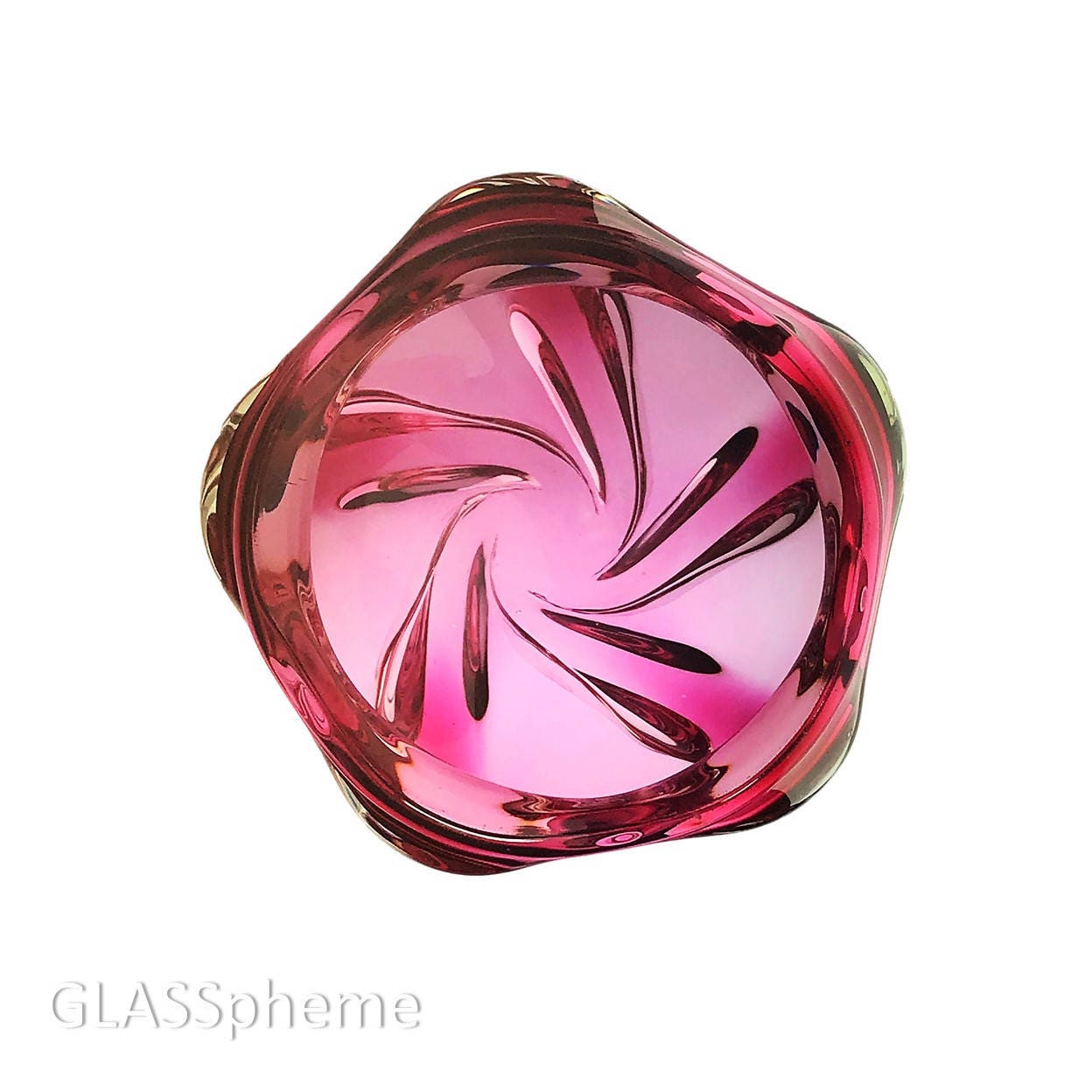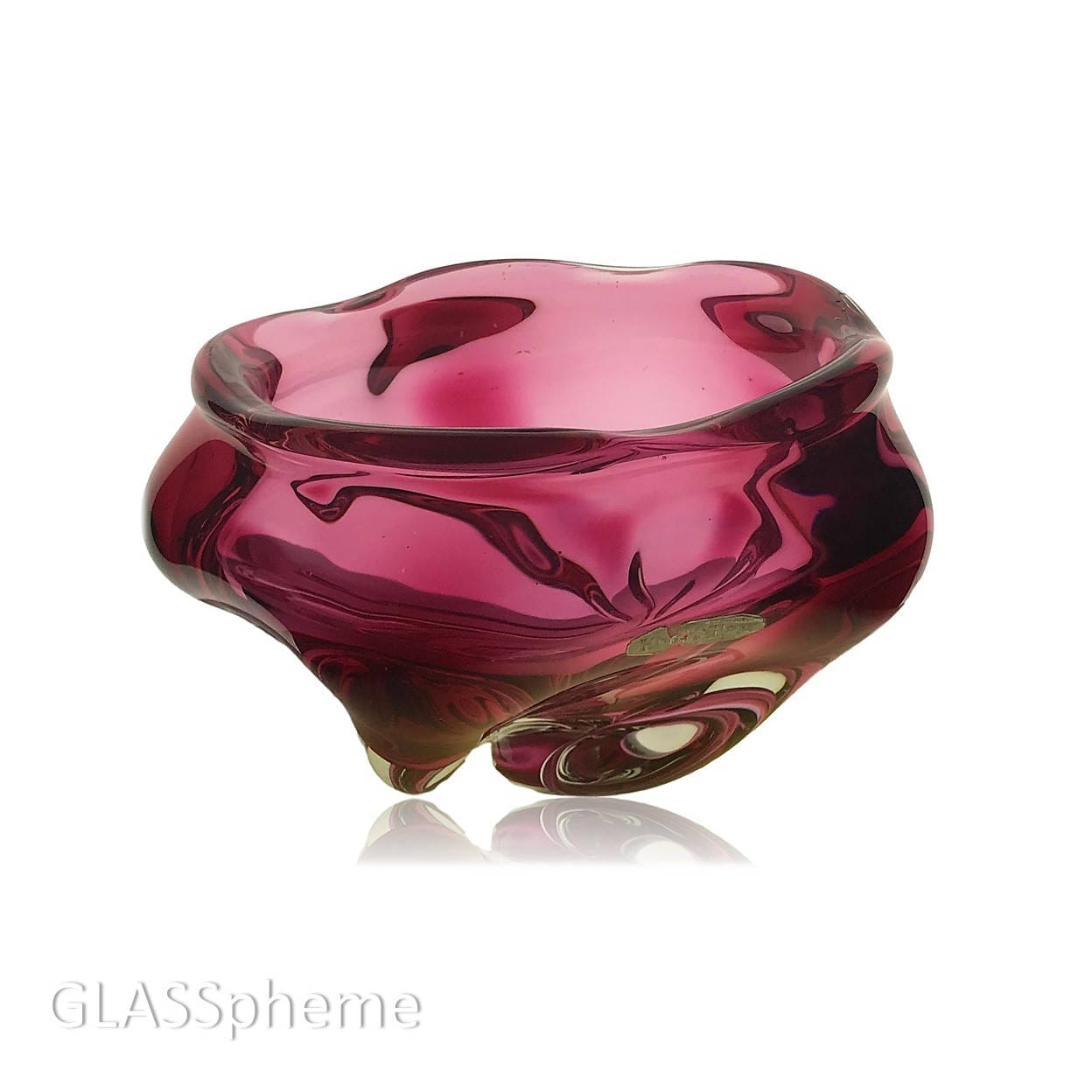Those divine oversized biomorphic glass vessels sporting big thick folds of sommerso glass that are often mistaken for Murano commonly hail from Bohemia--particularly when they're in pink/cranberry. I too first thought this spectacularly dramatic mid-century glass bowl was Bohemian until a close look at the label inducted me into a world I hadn't before known existed--JAPANESE glass! Not the cheaply manufactured "Made in Japan" pieces commissioned by US importers, but actual handblown Japanese art glass. This beautiful large, thick, heavy chunk of heaven sports remnants of the HINERI label, which I believe was a brand of the Iwatsu company.