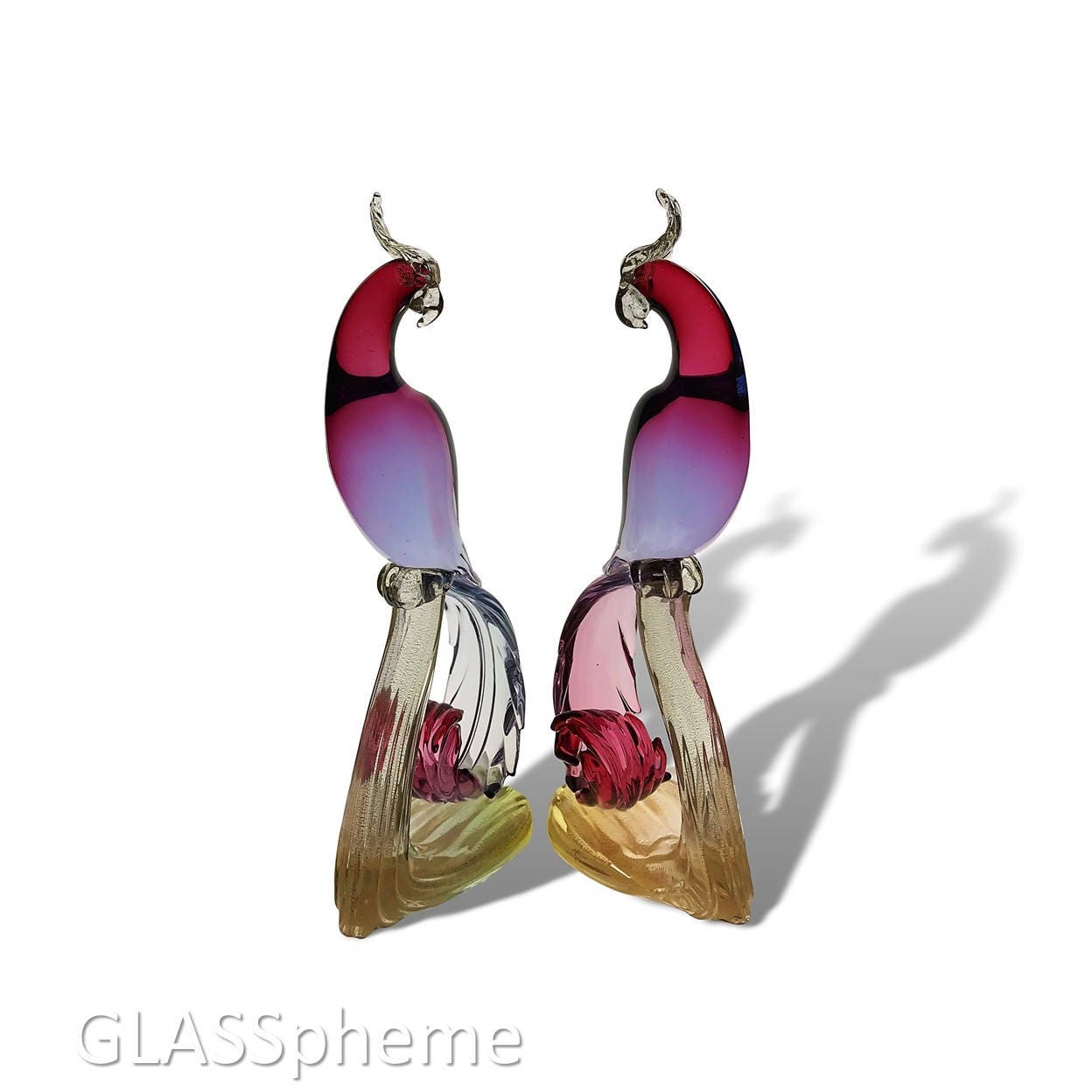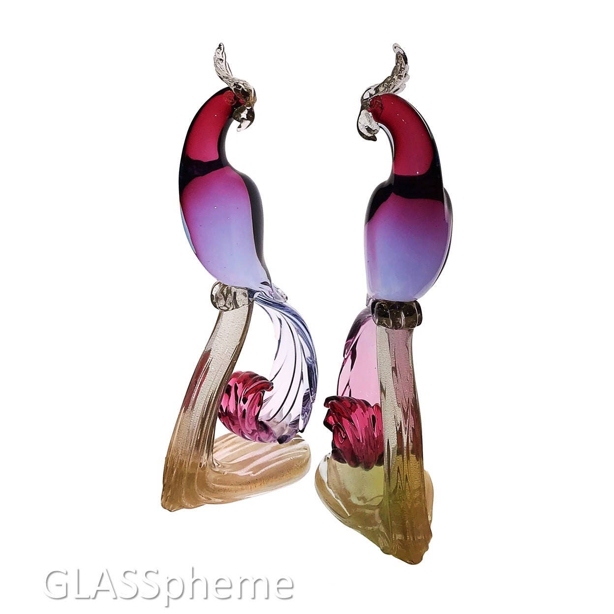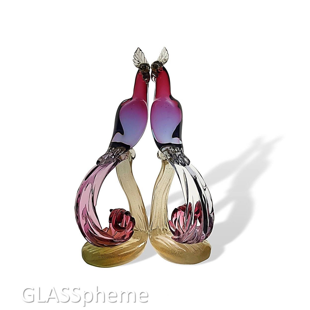 Casual glass collectors and enthusiasts TURN BACK NOW for there is no return after experiencing the devastating beauty of Alfredo Barbini's mid-century bird sculptures--the intricacy, the brilliant colors, the sweep and grace of the lines. The birds' body and tail is dominated by a divine blend of cranberry and "Alexandrite" glass. (The Alexandrite will appear a pale ice blue or an intense lavender depending on lighting conditions.) Sparkling gold aventurine graces the feathers and stands. These rare extraordinary captivating beauties will enchant and bewitch you. Consider yourself forewarned.