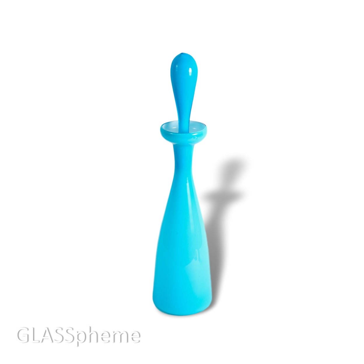This bright baby blue mid-century Empoli | Italy hand-blown cased glass decanter is a fantastic example of modern design—sleek, dramatic, and a great find in this beautiful color.