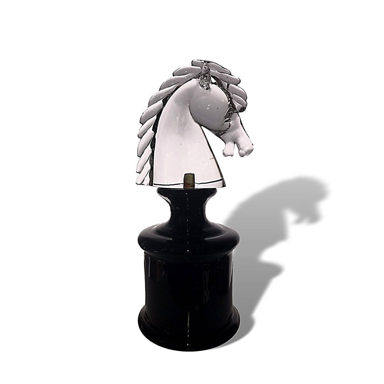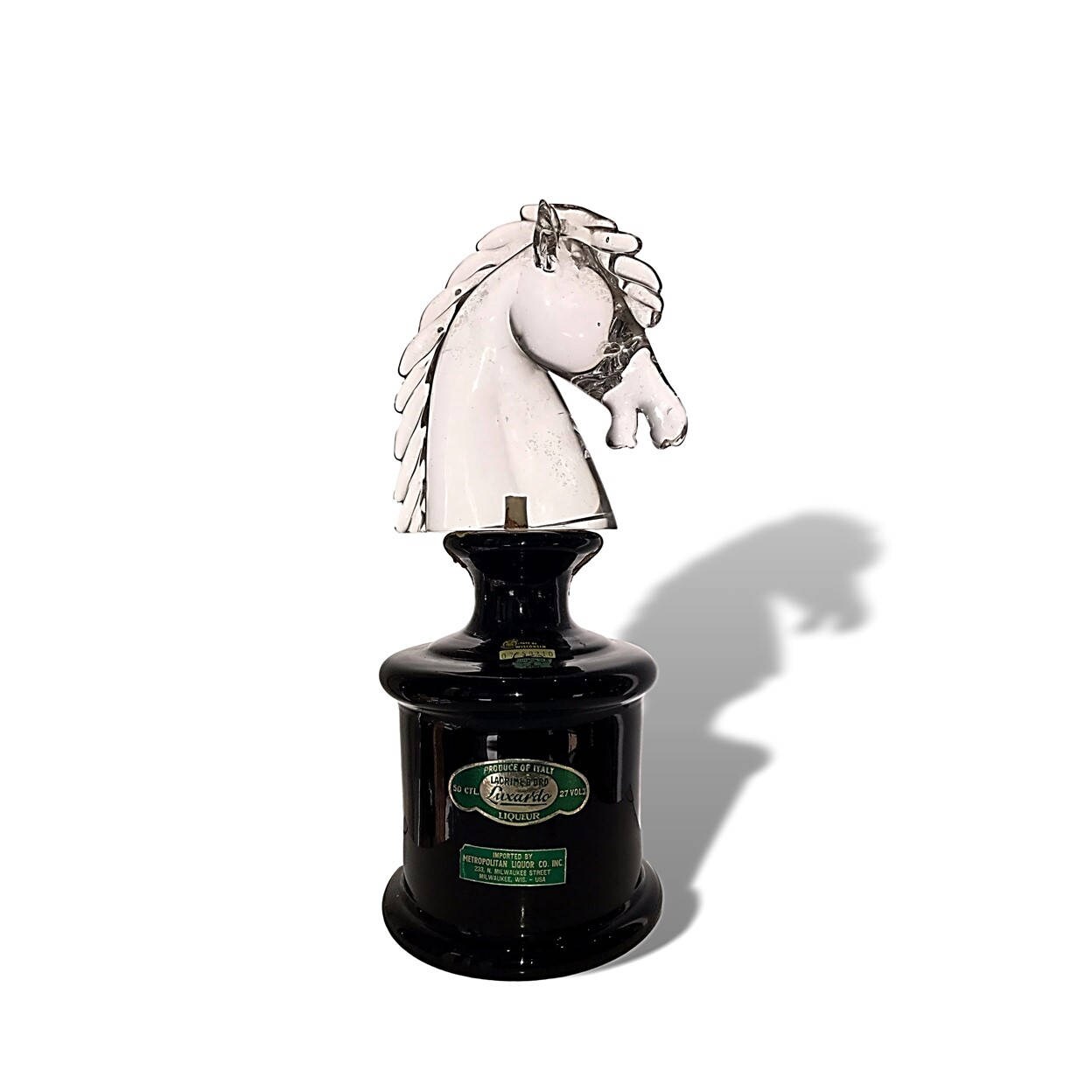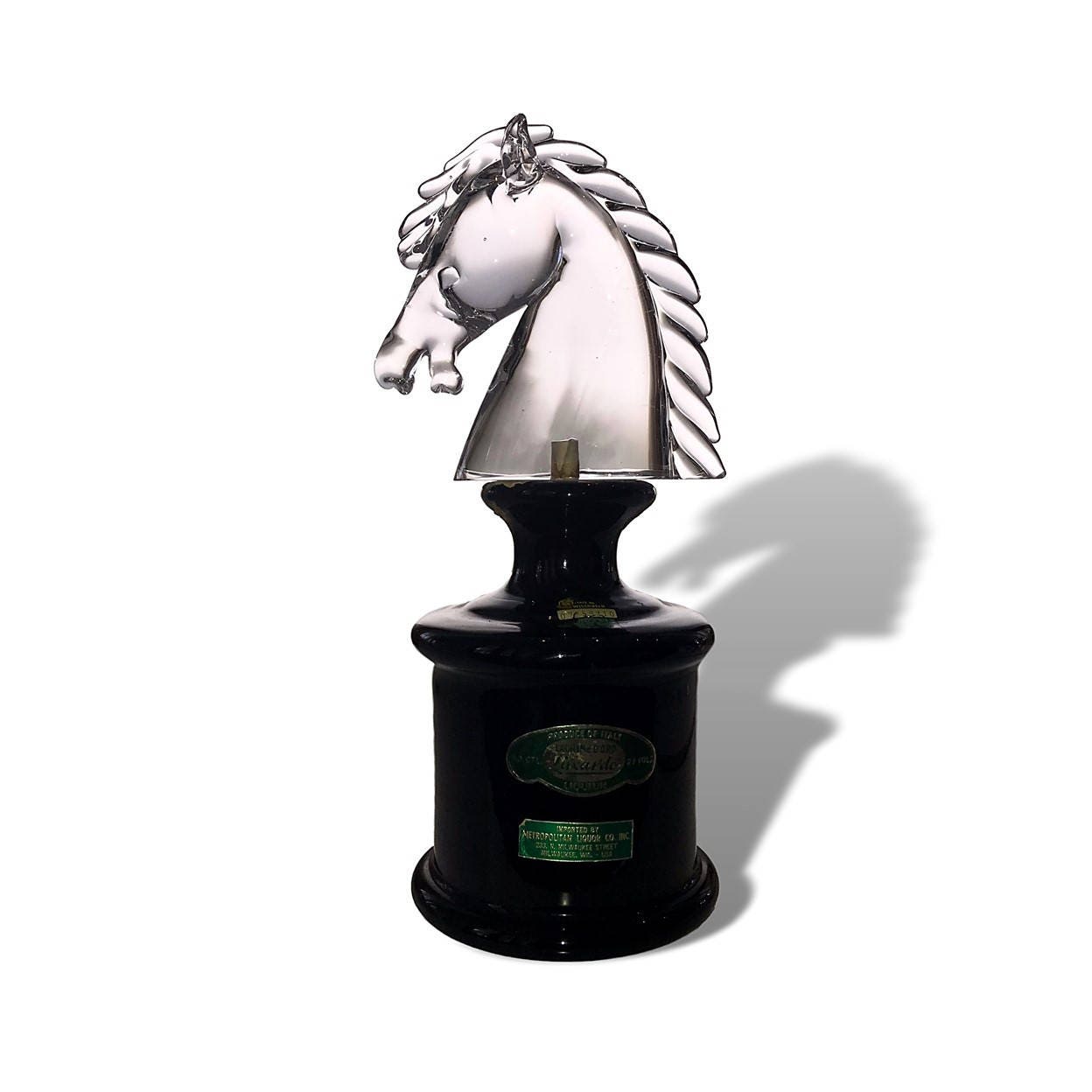 Produced in 1969 by Archemede Seguso for Italian liquor producer Luxardo, this beautiful chess piece | rook | horse head decanter is the height of luxury indeed. The piece stands just below 12 inches tall and is in extraordinary vintage condition--no damage, some light base wear is all.