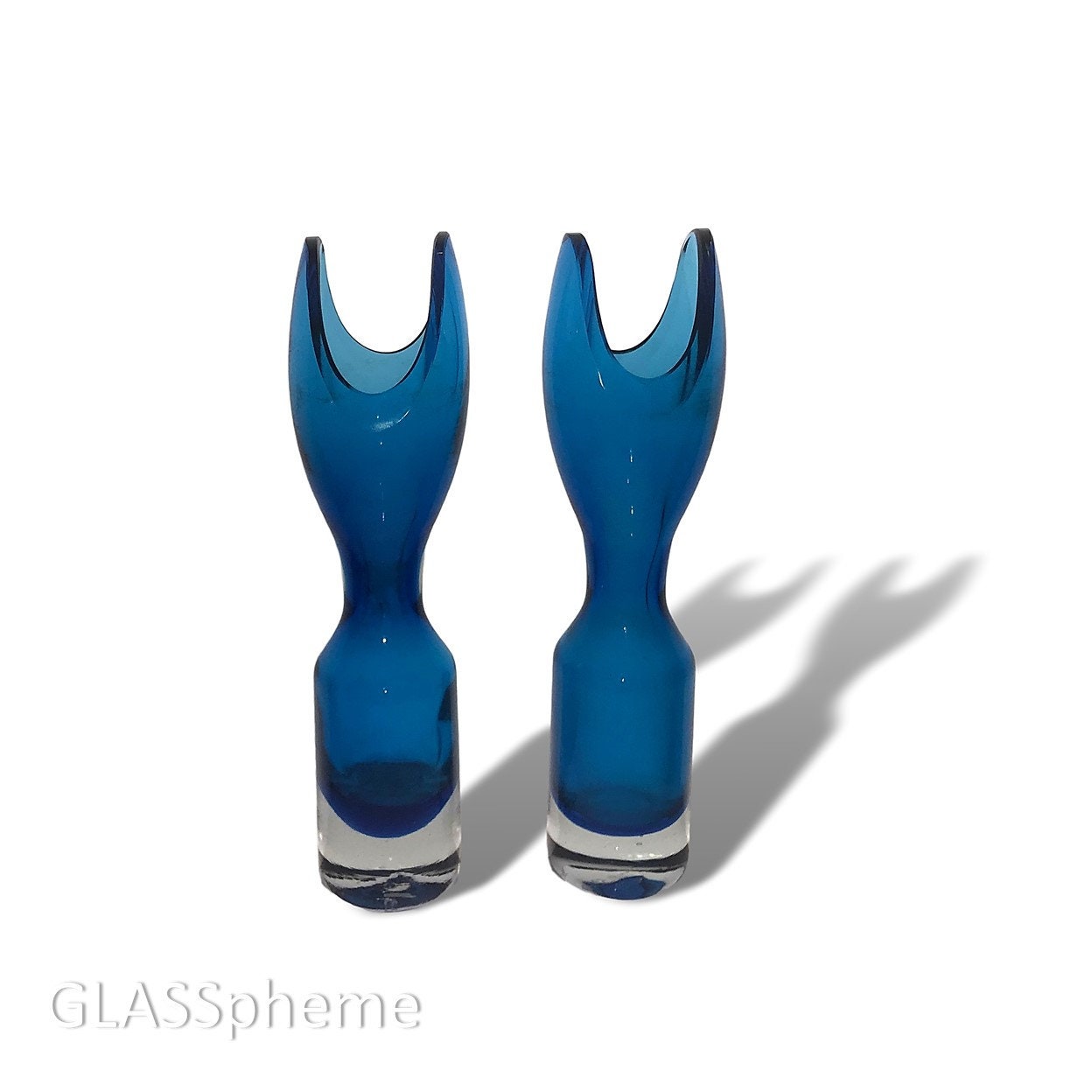 You're looking at a RARE PAIR (even more ridiculously difficult to find than a single!) of Blenko 1959 bud vases - candleholders (Blenko refers to them as such in their catalog) by Wayne Husted. While this design is super rare and highly coveted in both sizes, the smaller version (which this is) was made for ONE YEAR ONLY and is even rarer. The larger 13.5" version was made for two years. Part of the allure of this piece is its radical departure from Blenko's usual design elements. With its cased sommerso glass base, sleek Danish modern shape and diagonally cut lip, it has a decidely Murano | Scandinavian vibe.