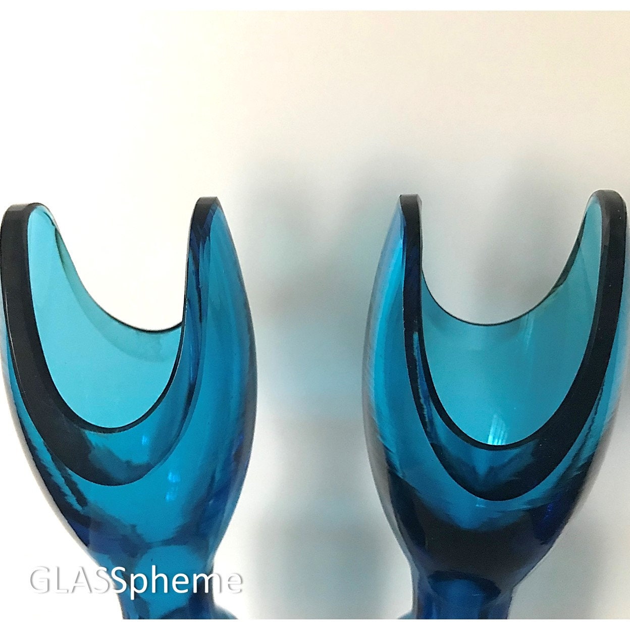 So, finding a PAIR of these (so you can indeed use them as candleholders) without any chips or nicks is pretty incredible. Please note that both pieces are signed with Blenko's acid-etch on the base.