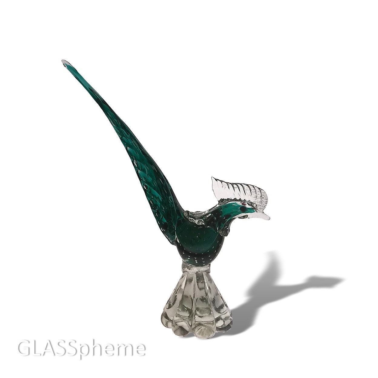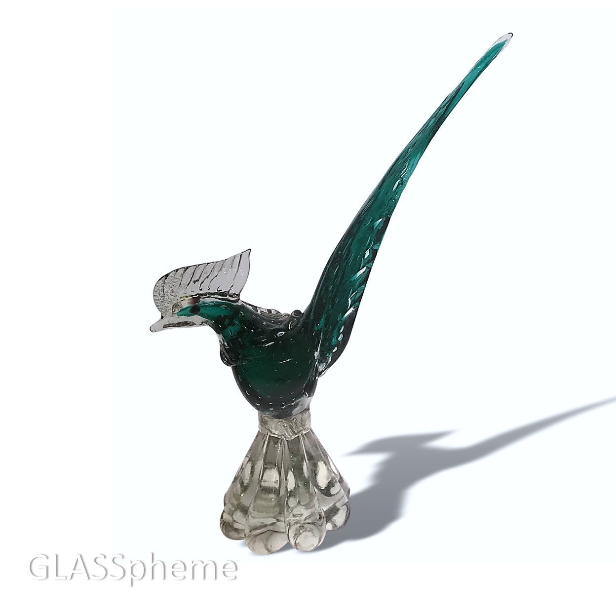 This super pretty mid-century Murano glass rooster (maybe) is done in crystal and a vivid teal/green cased | sommerso bullicante glass and is in perfect condition. I'm unable to attribute it to any one producer--it sports the generic (but clearly mid-century) red scalloped Genuine Venetian Glass Made in Murano Italy, which I've thus far seen on AVEM and Fratelli Toso (among other) pieces.