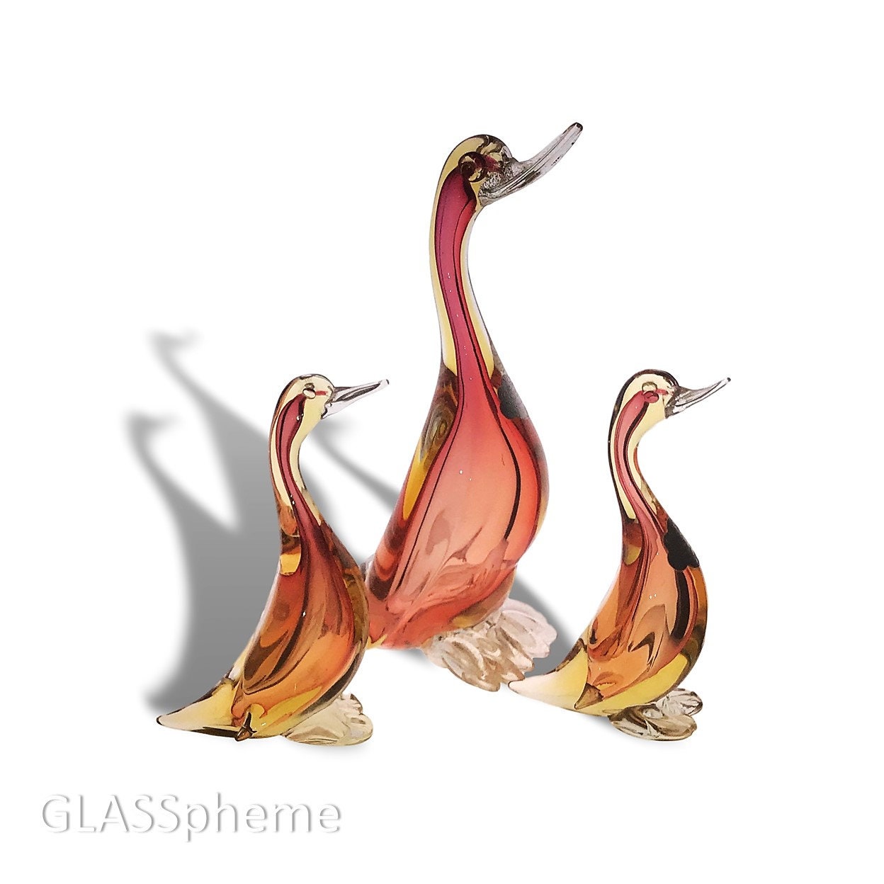What's better than a graceful Alfredo Barbini sommerso duck (or other type of water fowl)? A flock of them! Or at least a Mama duck and her small brood! (No sexism here--the male duck is known to fly the coop before the eggs hatch.) This hard-to-find spectacular set of ducks was produced by Alfredo Barbini for Weil Ceramics and Glass in the mid-century period and each duck still retains its original label. This beautiful sommero | encased | submerged glass set is done in a dreamy rose/cranberry and amber with clear glass feet and beaks (though the beaks are strewn with gold aventurine flakes).