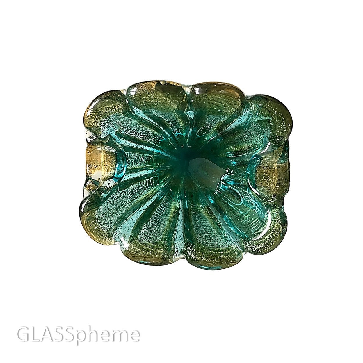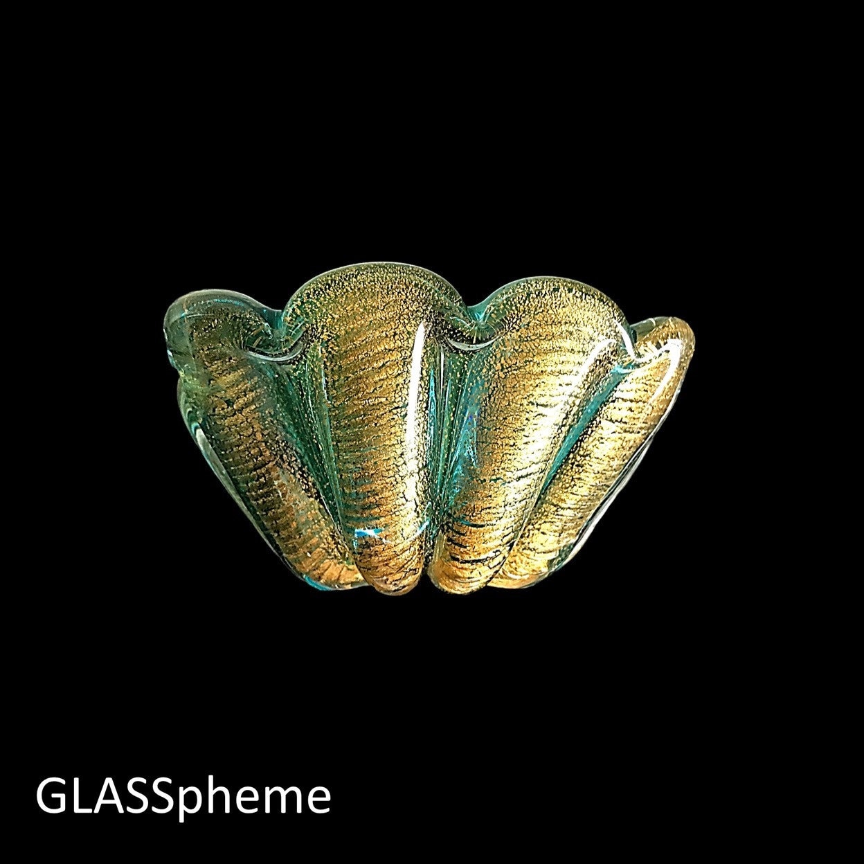 Barovier & Toso's "Cordonato D'oro" (or "Golden Rope") creations, designed by Ercole Barovier, are amongst its most lavish and highly coveted, and this gorgeous heavy bowl | ashtray | trinket dish makes it obvious why. Festooned with 24K gold in a transparent sea green base, this luxurious piece is a jewel to be treasured. Unsigned but documented exhaustively, this beauty is in excellent vintage condition (and has nice wide indentations for your biggest stogies if cigars are your thing).