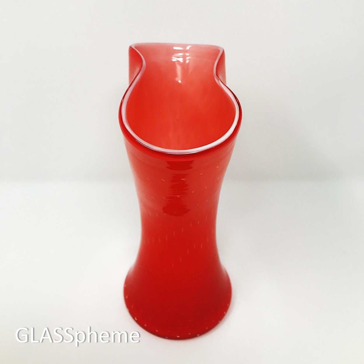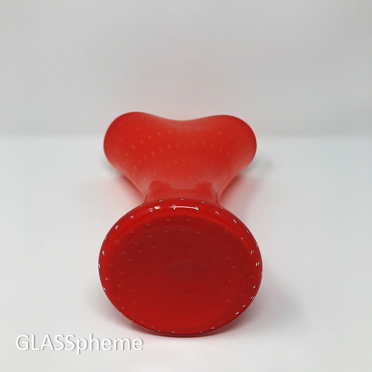 This gorgeous vivid orange cased bullicante glass vase by Fratelli Toso vase, unmarked, is readily identifiable as such; Leslie Pina documented it amply in "Fratelli Toso" and its known as one of FT's classic designs only in an incredible high-gloss atomic orange technicolor. The lattimo lip next to the bright color sharpens the cool 'pinched' shape of the vase, which, not coincidentally, is ideal for a small bunch of leafy flowers. You must have it. Really.