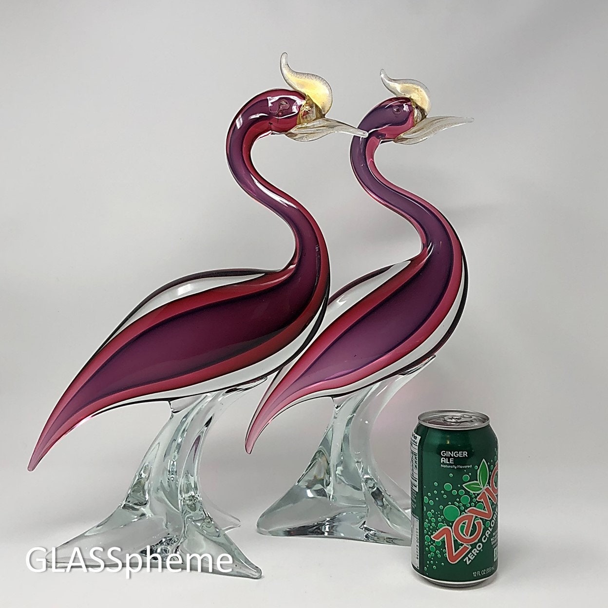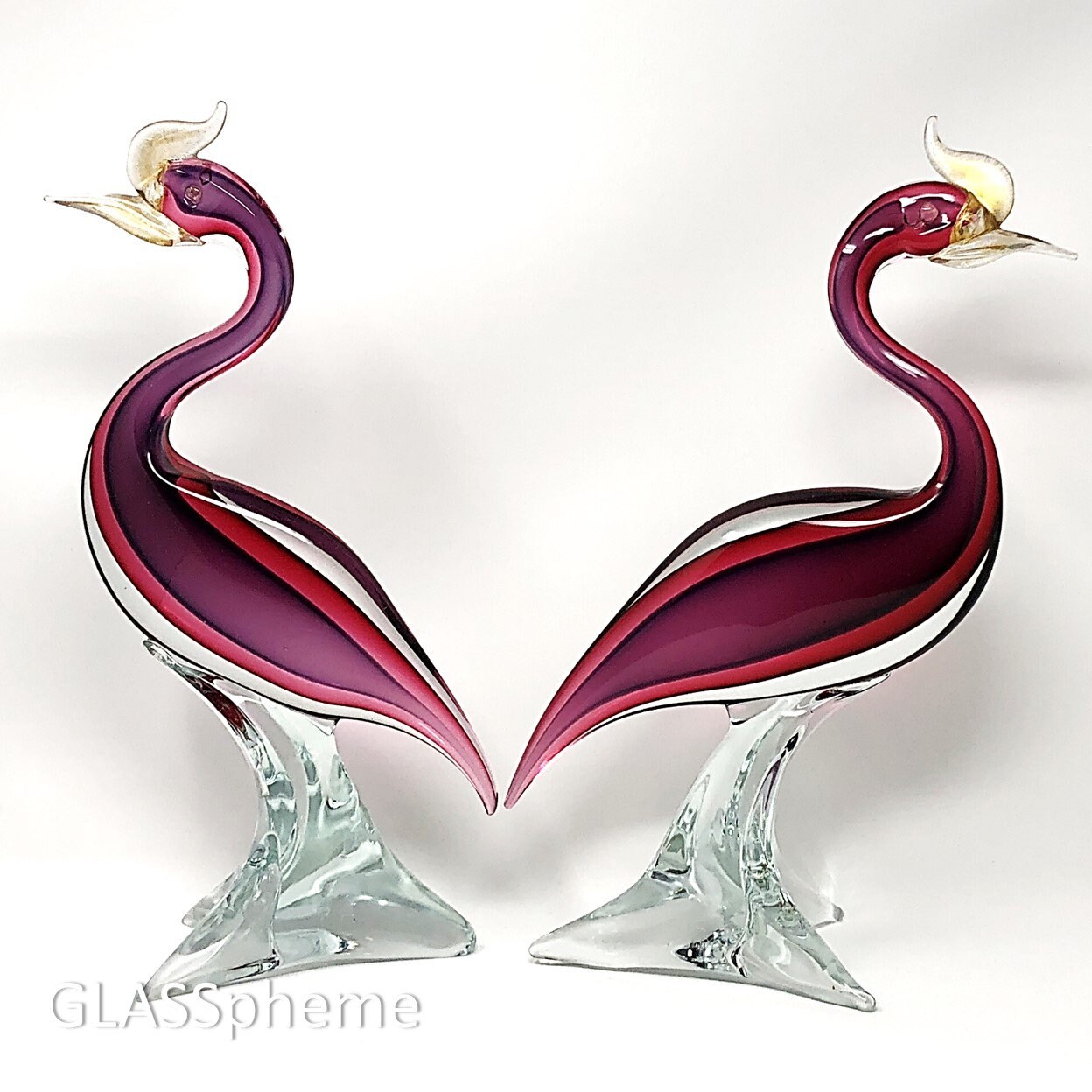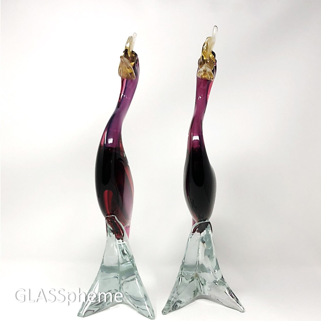 Behold these monumental and MAGNIFICENT mid-century Murano glass birds in a devastatingly gorgeous purple and cranberry sommerso with gold-flecked beaks and crowns on crystal triangular stands. I purchased these exquisite creatures about 15 years ago and have only come across one or two like them since--unsigned and NONE with labels! But, put a gun to my head and I'll attribute these beauties to Licio Zanetti, simply because the few glass Murano animals I've EVER seen with this same triangular crystal base (or a similarly shaped quadruple point base) were signed by Licio Zanetti.