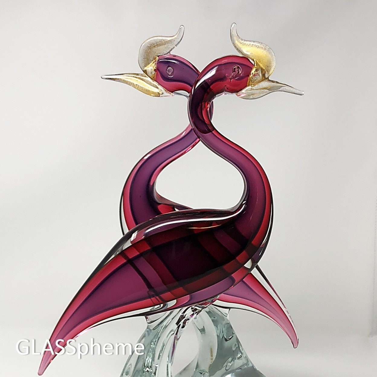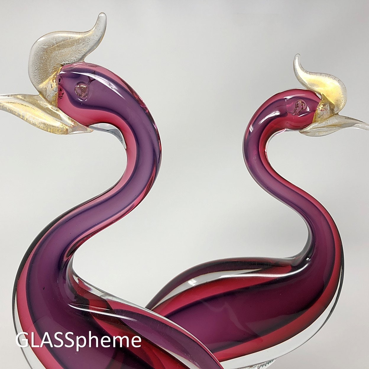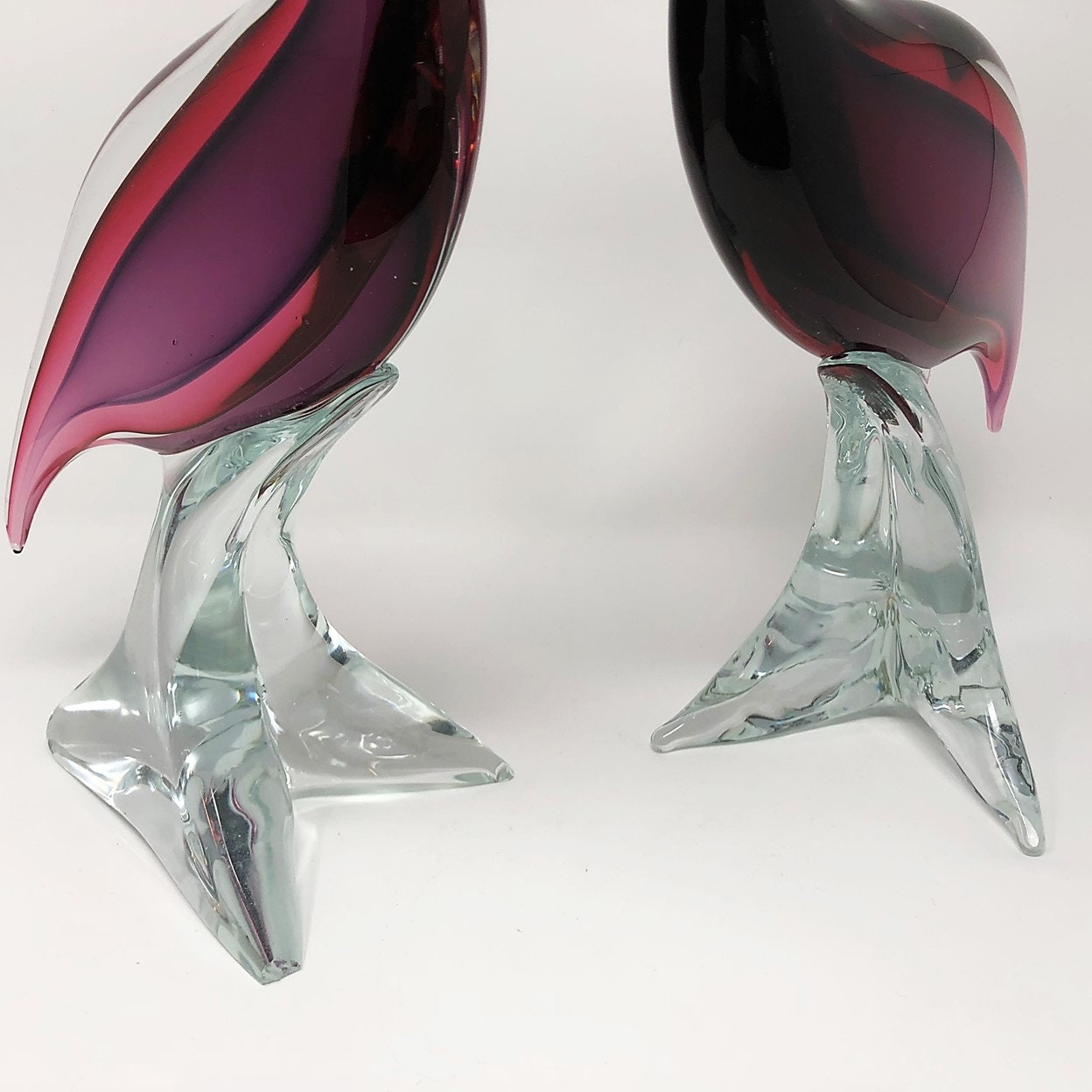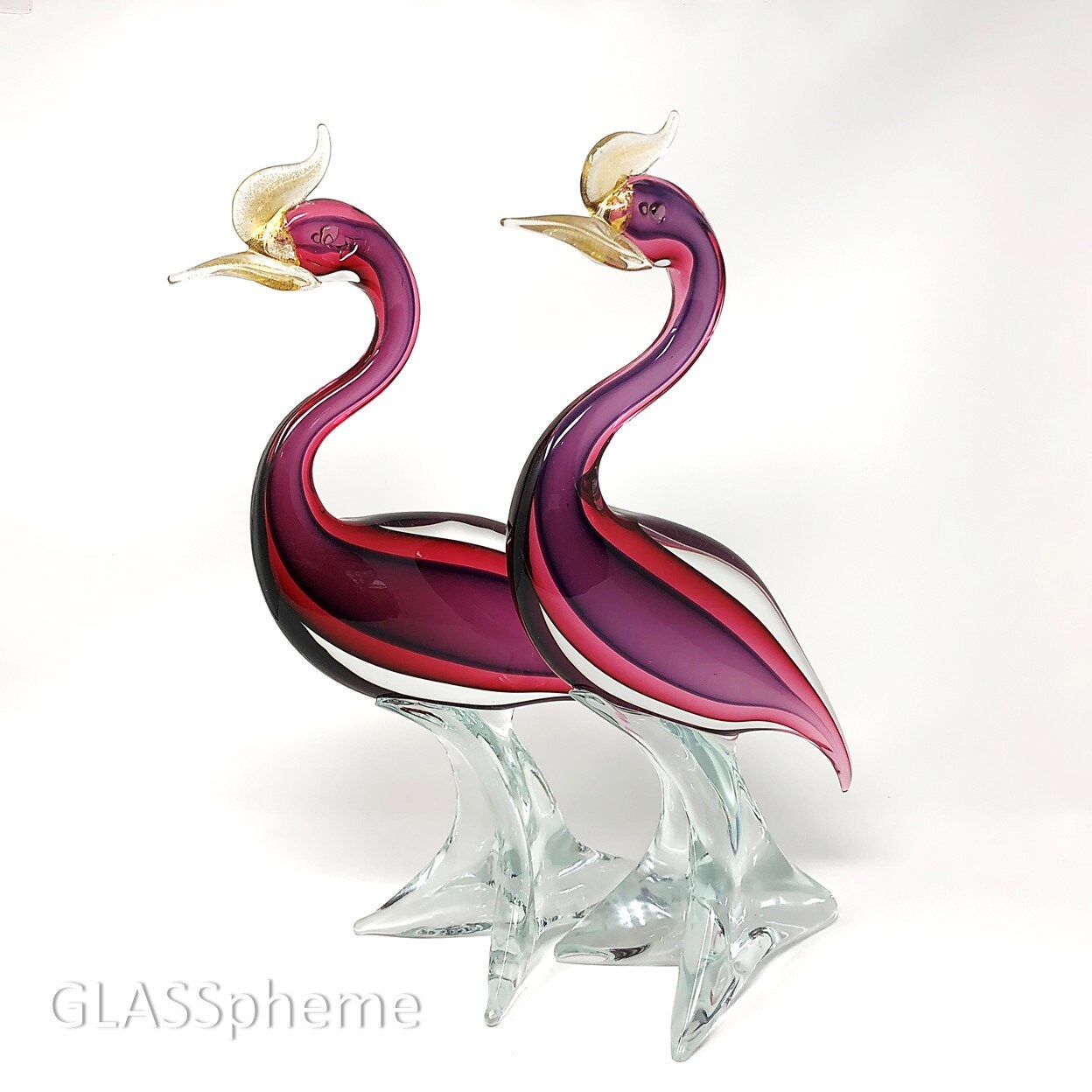 Behold these monumental and MAGNIFICENT mid-century Murano glass birds in a devastatingly gorgeous purple and cranberry sommerso with gold-flecked beaks and crowns on crystal triangular stands. I purchased these exquisite creatures about 15 years ago and have only come across one or two like them since--unsigned and NONE with labels! But, put a gun to my head and I'll attribute these beauties to Licio Zanetti, simply because the few glass Murano animals I've EVER seen with this same triangular crystal base (or a similarly shaped quadruple point base) were signed by Licio Zanetti.